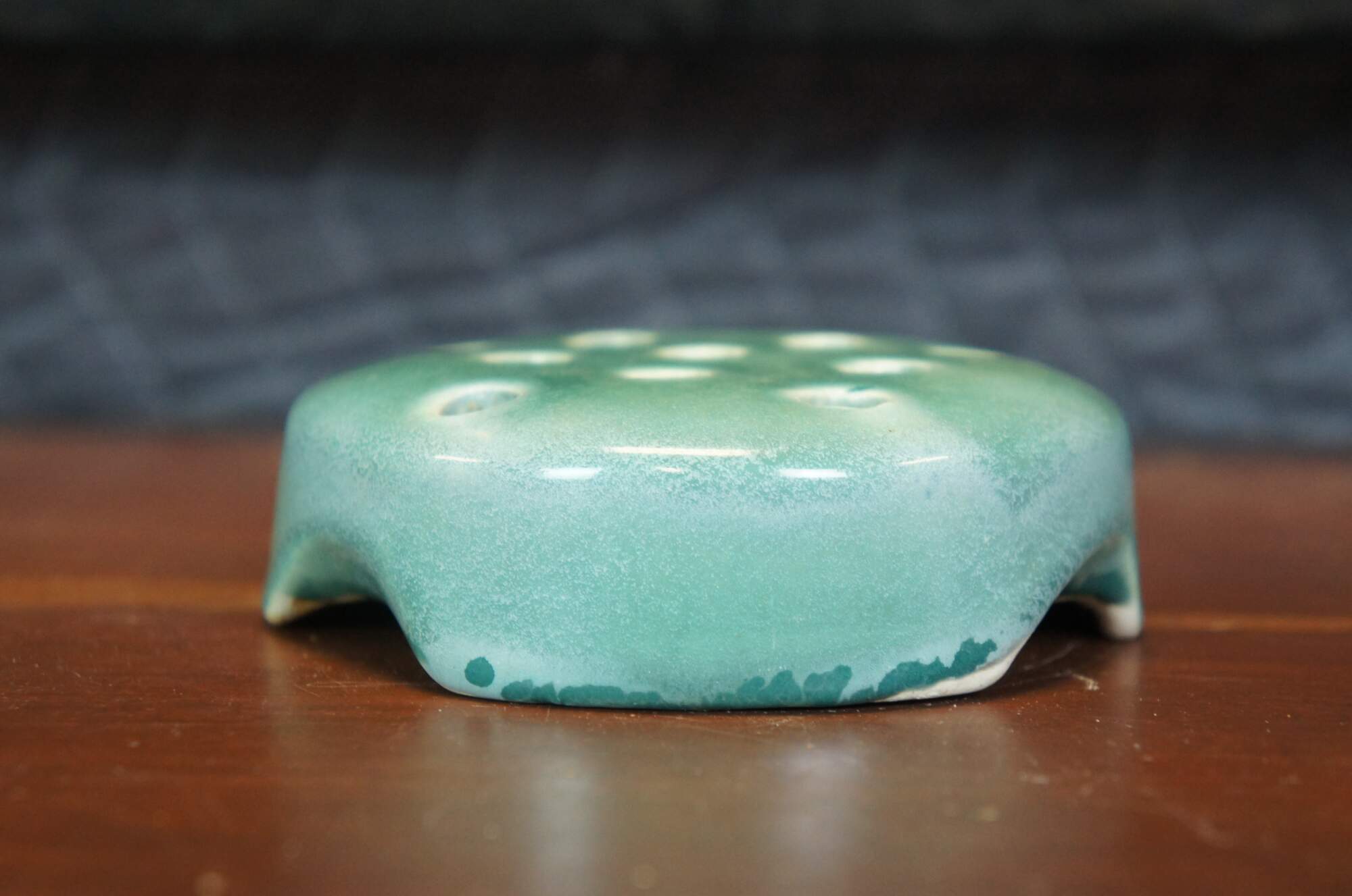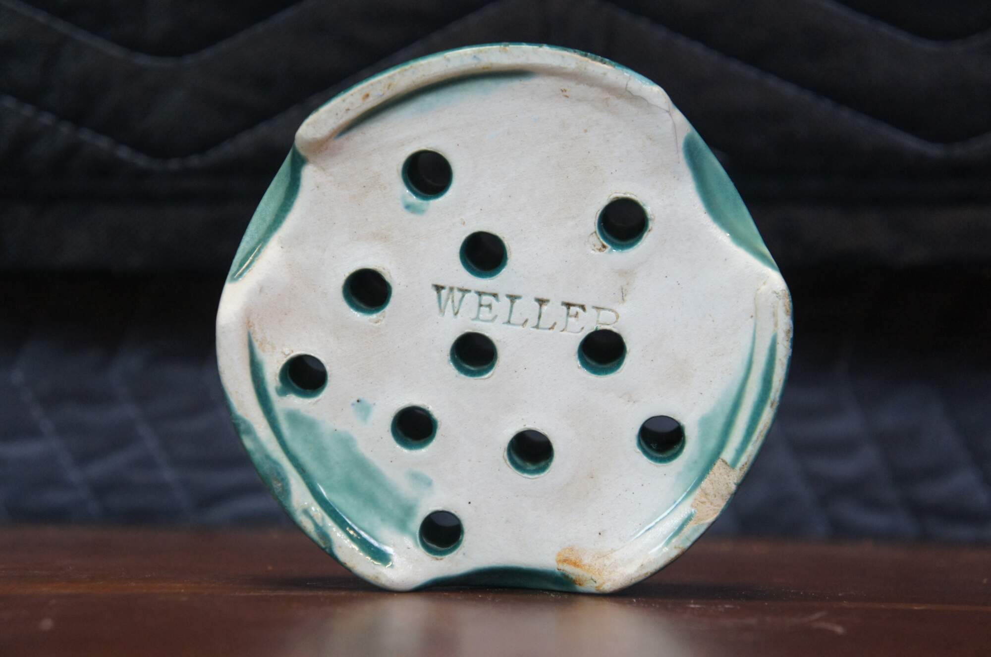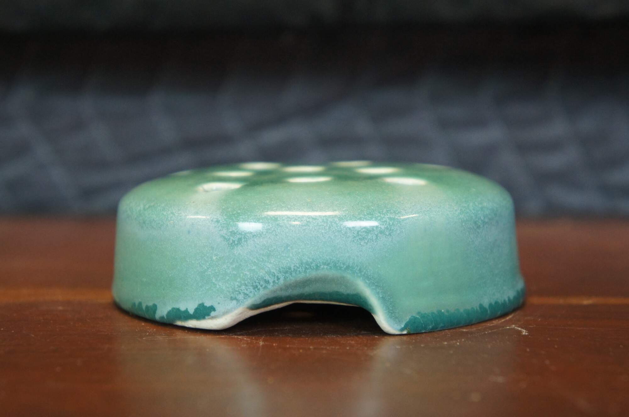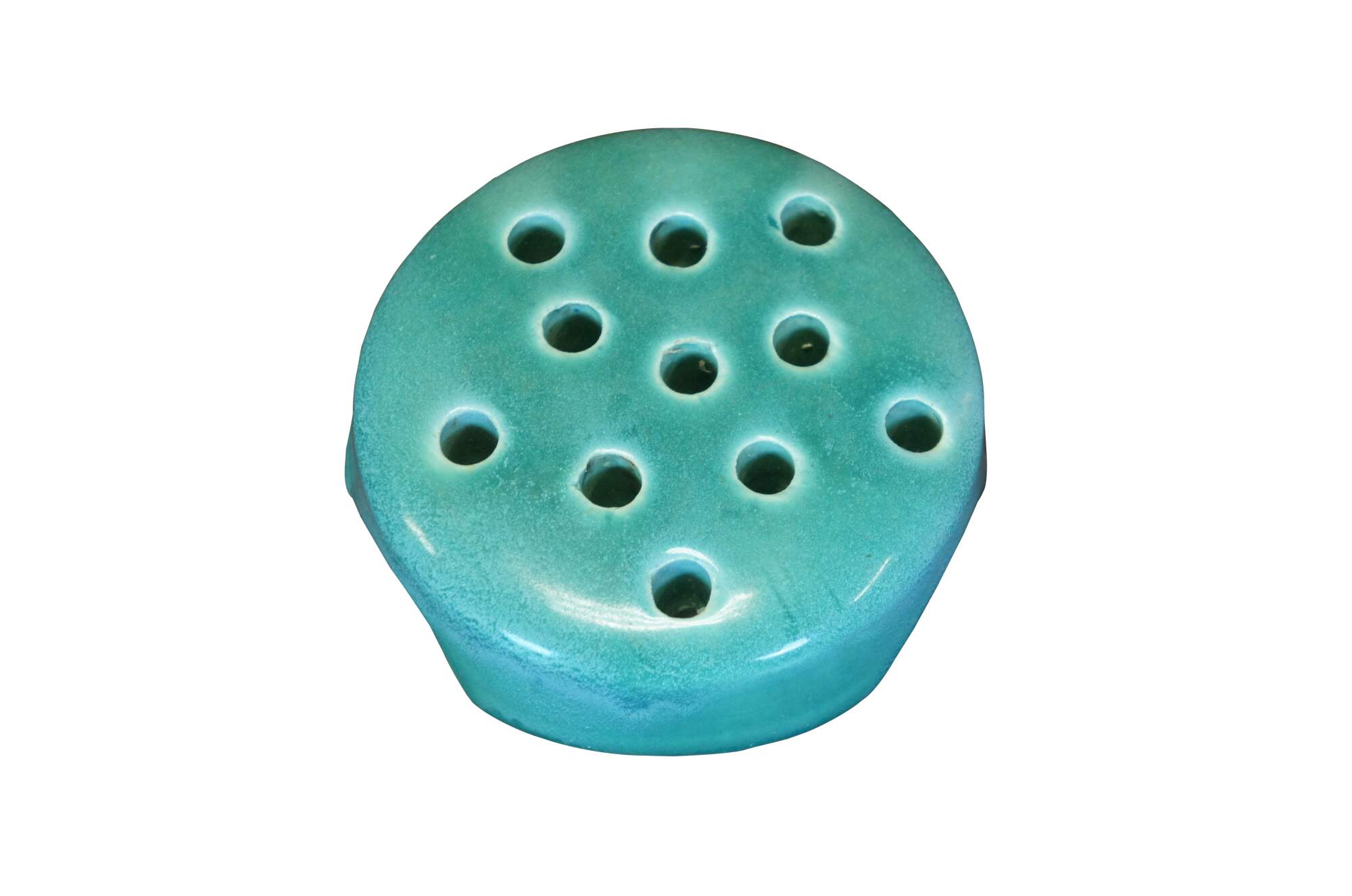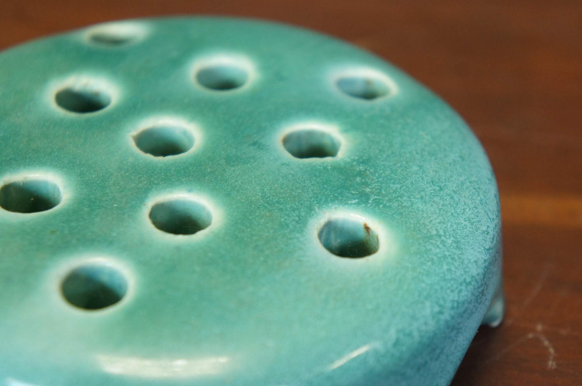 Vintage 11 hole round flower frog by Weller Pottery, finished in a turquoise green glaze.