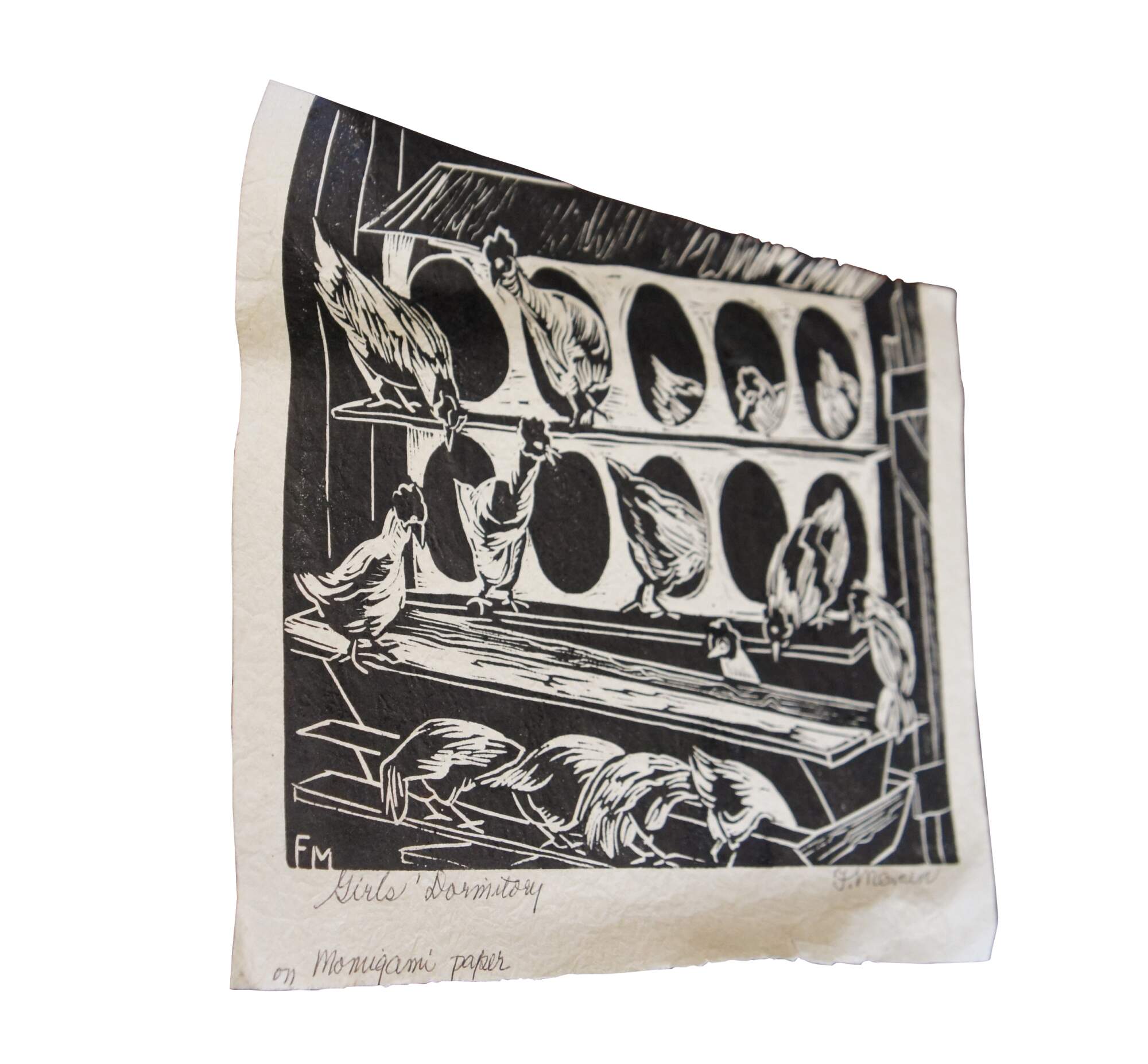 Mid 20th century folk art woodblock print titled "Girls' Dormitory," depicting a flock of chickens at their nesting boxes and feeding trough in a coop. Black ink on Momigami paper. Titled and signed by Fannie Mennen.