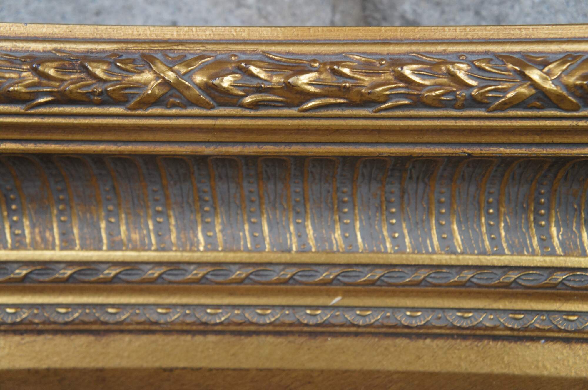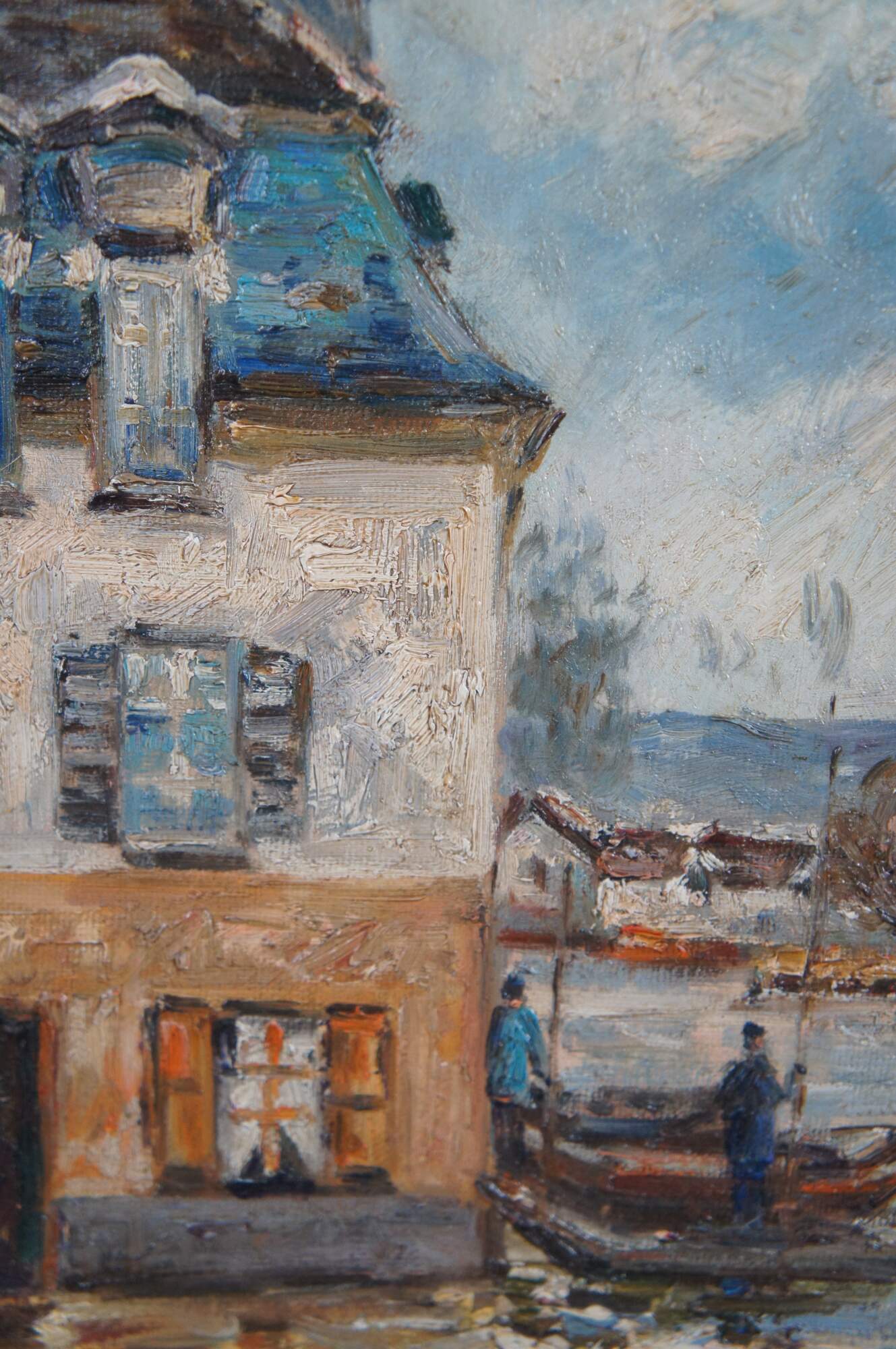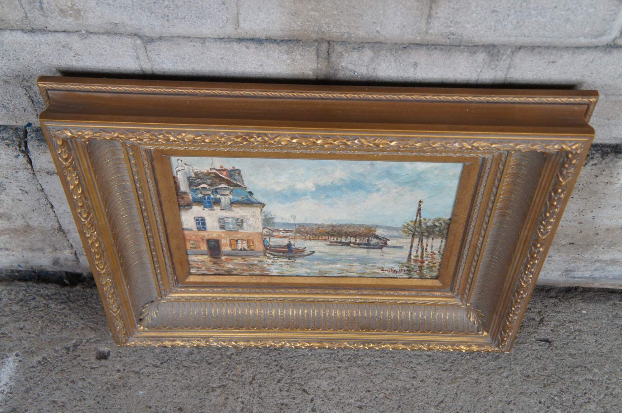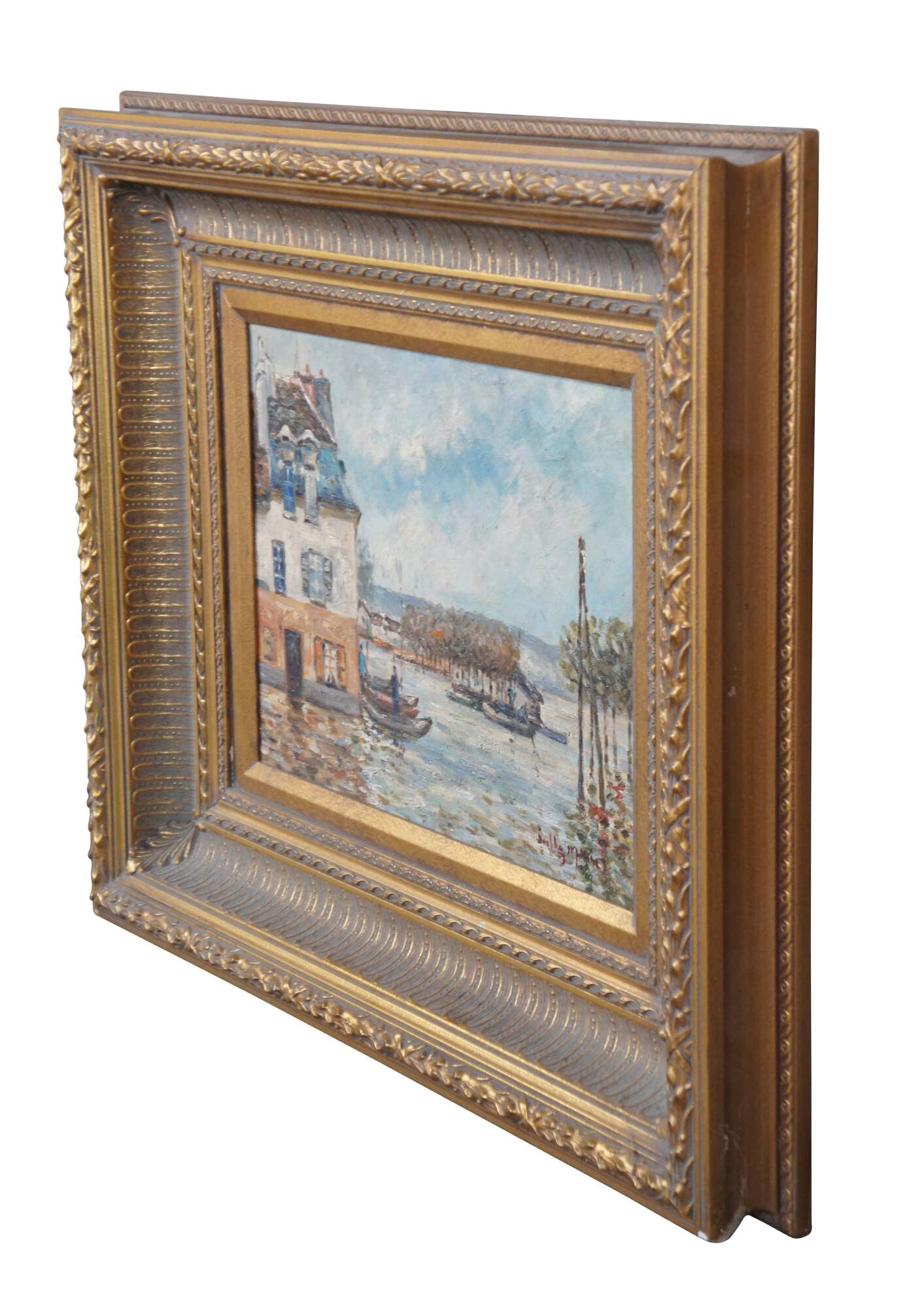 An original oil painting replicating the "Flood at Port-Marly" after Alfred Sisley. The painting is on canvas and signed lower right by an artist with the first name Sally. Framed in a neoclassical style wood frame with gold finish and ribboned gesso.