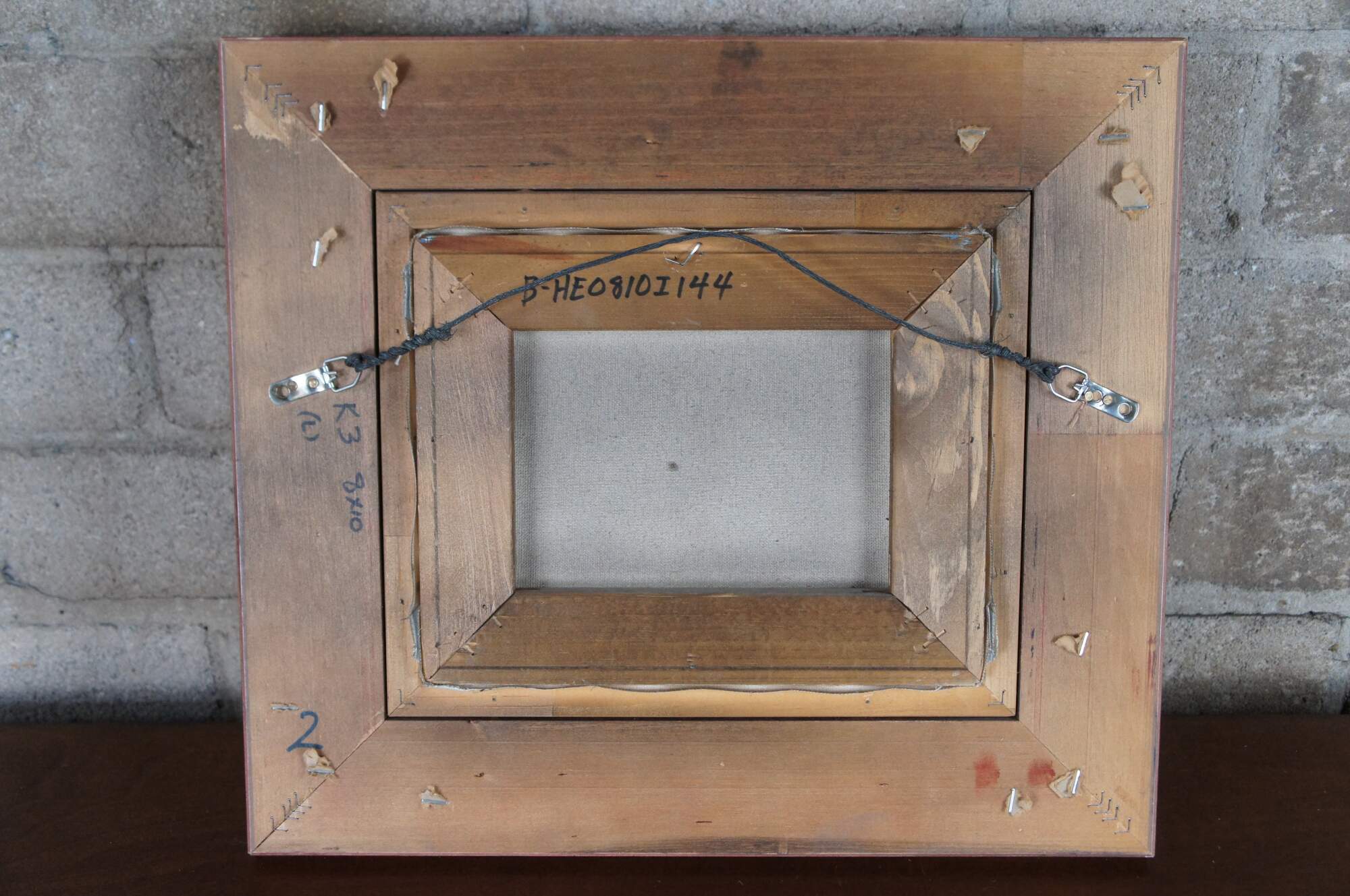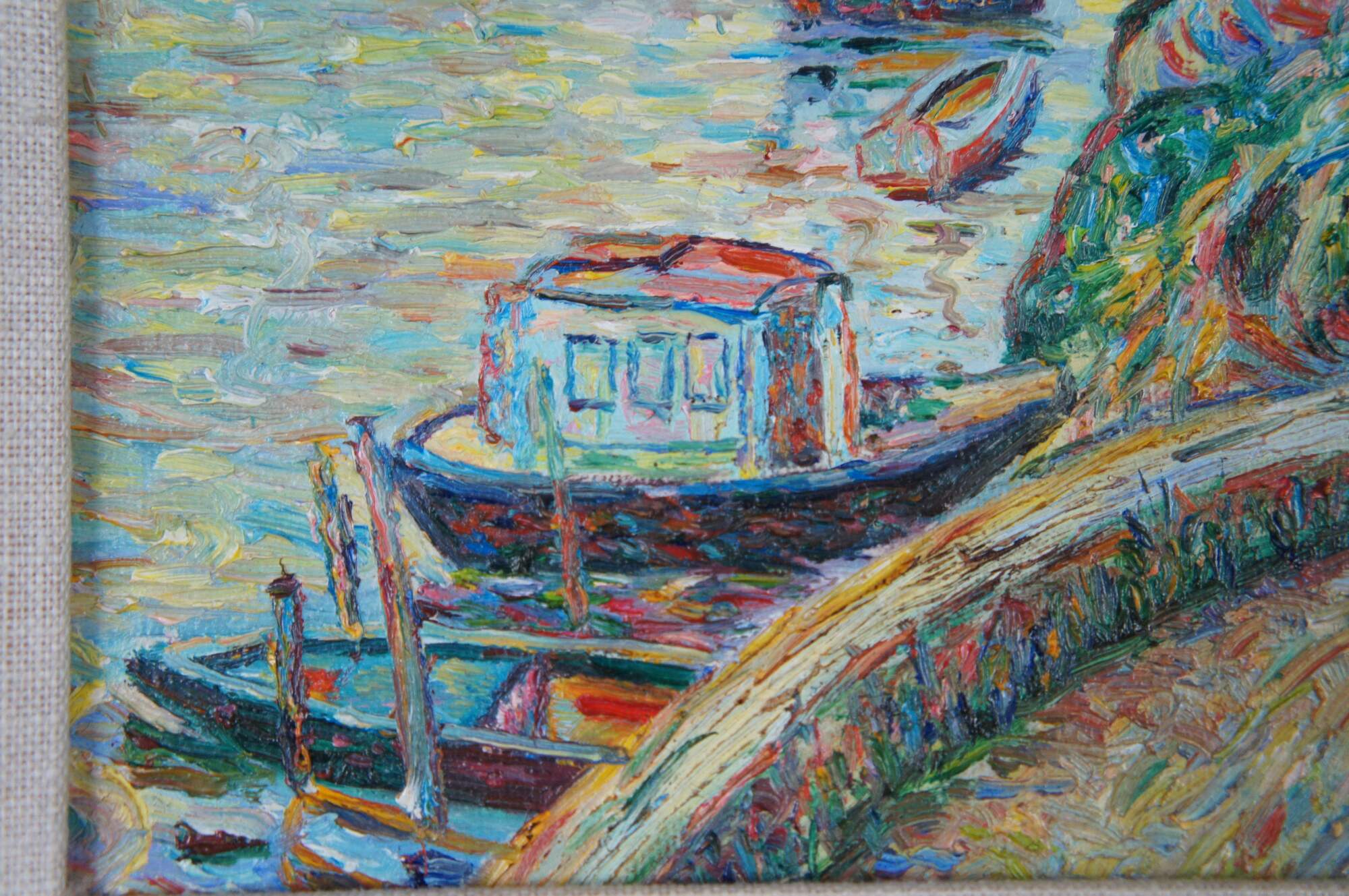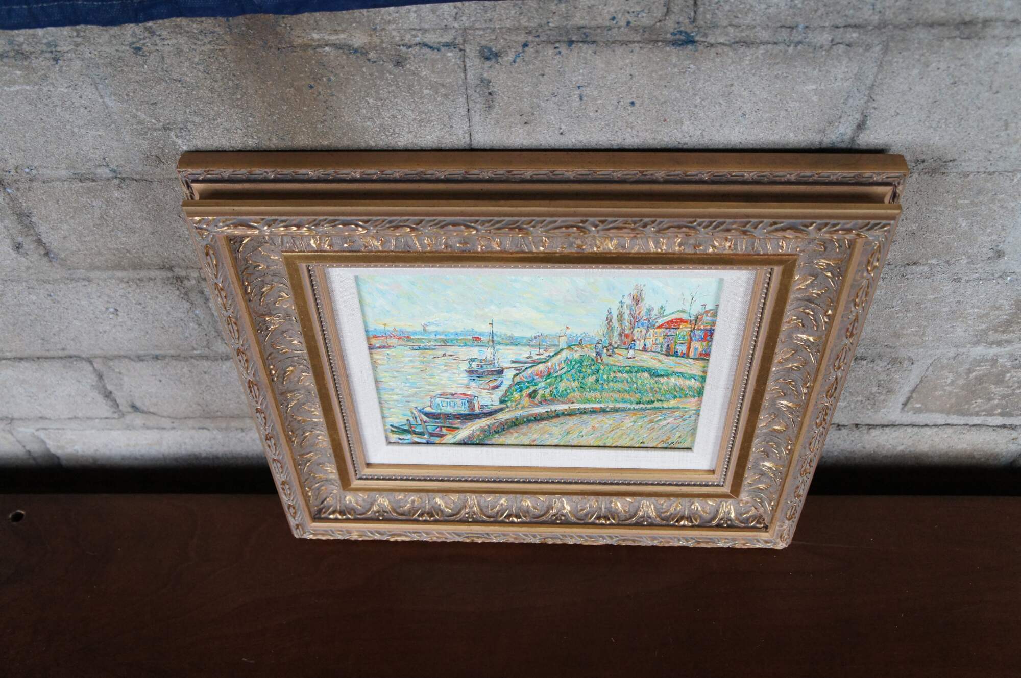 Colorful vintage Impressinoist canal landscape, Signed Harlo, second half 20th century. An oil on canvas with thick brush strokes showcasing a busy canal with boats, and figures by a walking path. The cityscape can be seen in the background. The canvas is framed in a French / Neoclassical style gold wooden frame with acanthus relief.