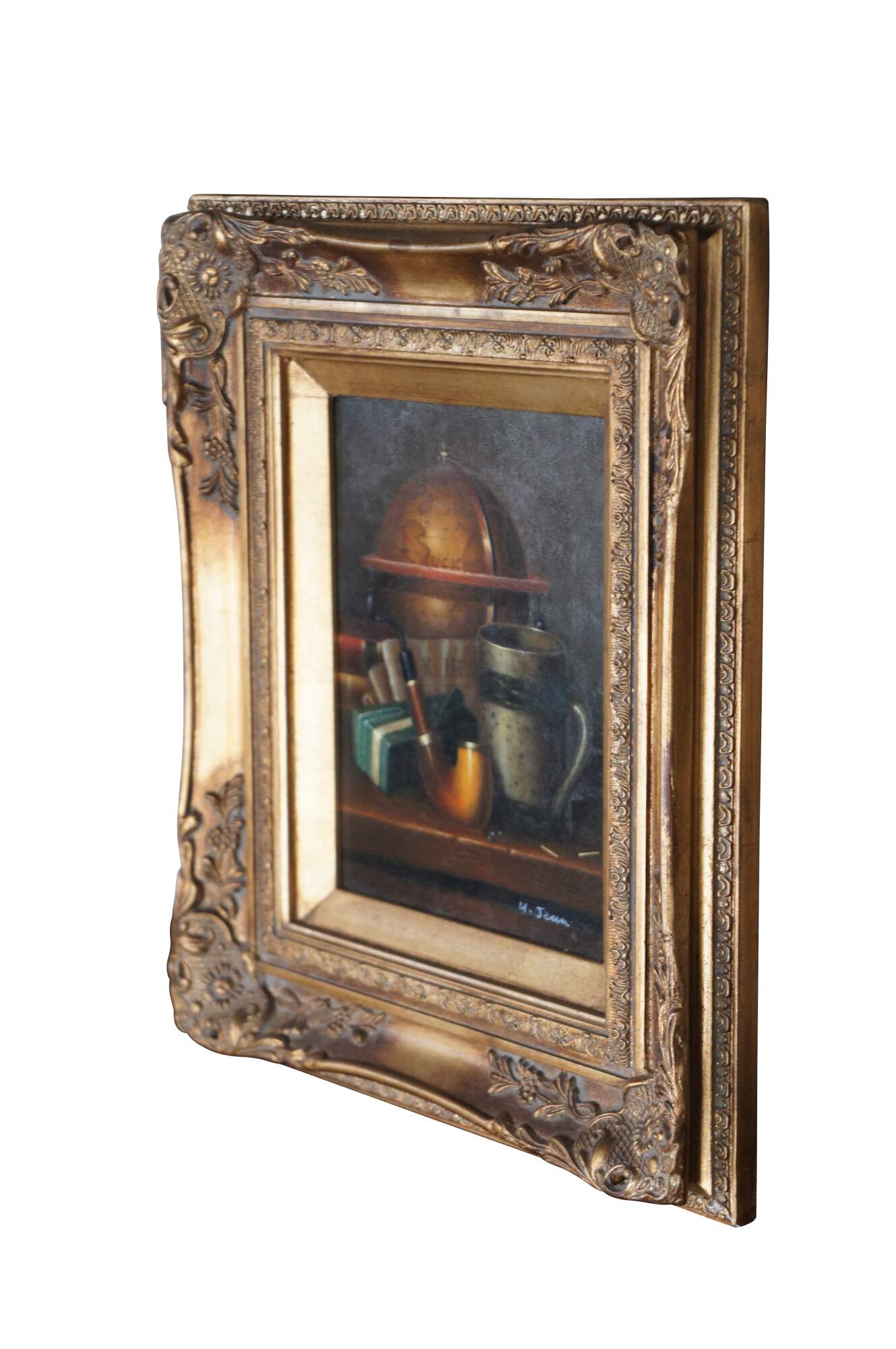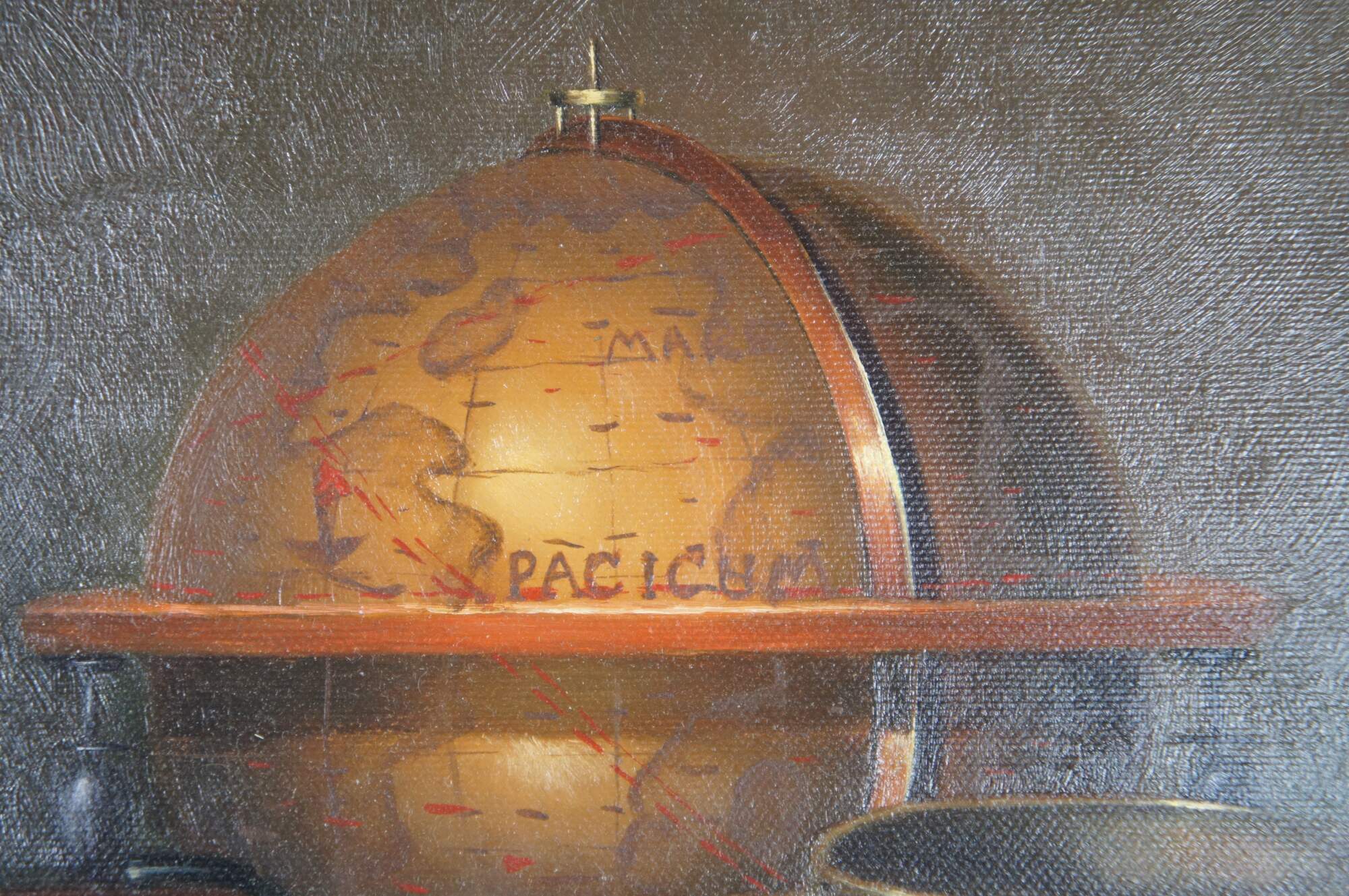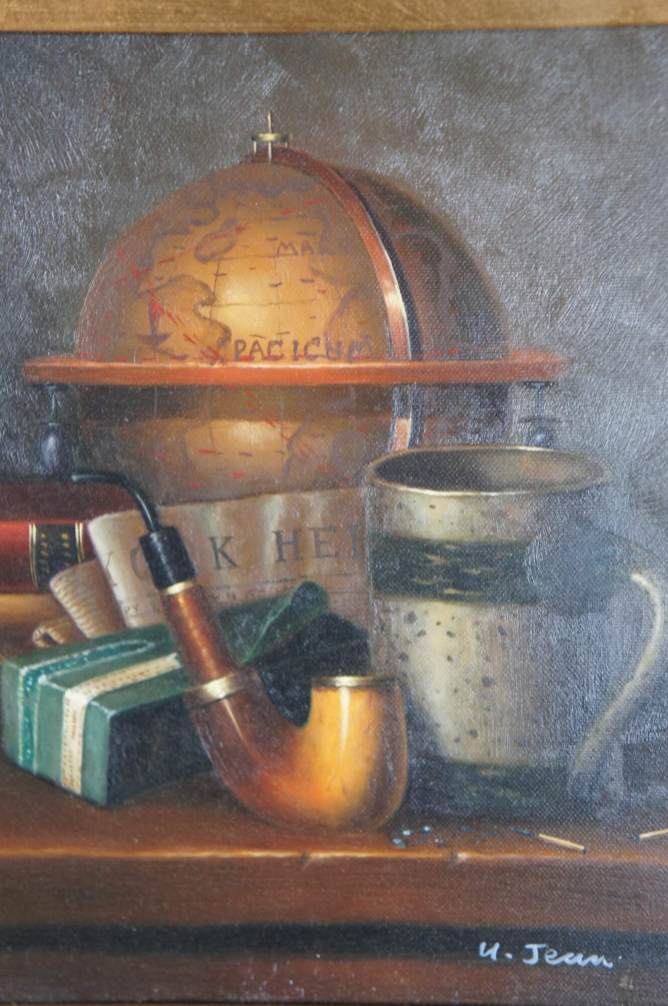 Late 20th Century Still Life Oil Painting on Canvas, signed lower right. Features a globe with the pacific ocean facing out on a desk behind books, newspaper, a pewter mug and sherlock. The painting is Signed by M. Jean and framed in Baroque Manner.