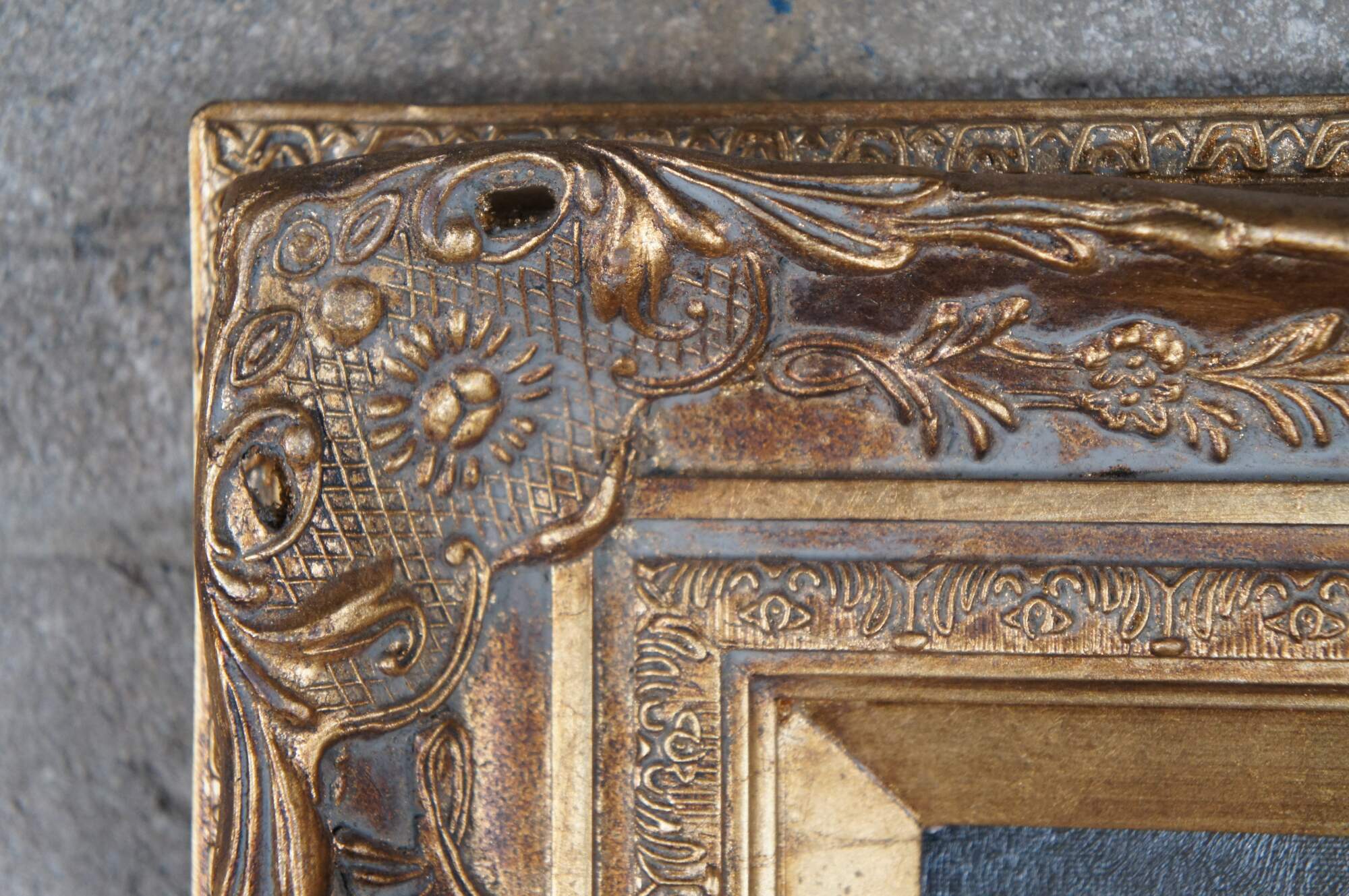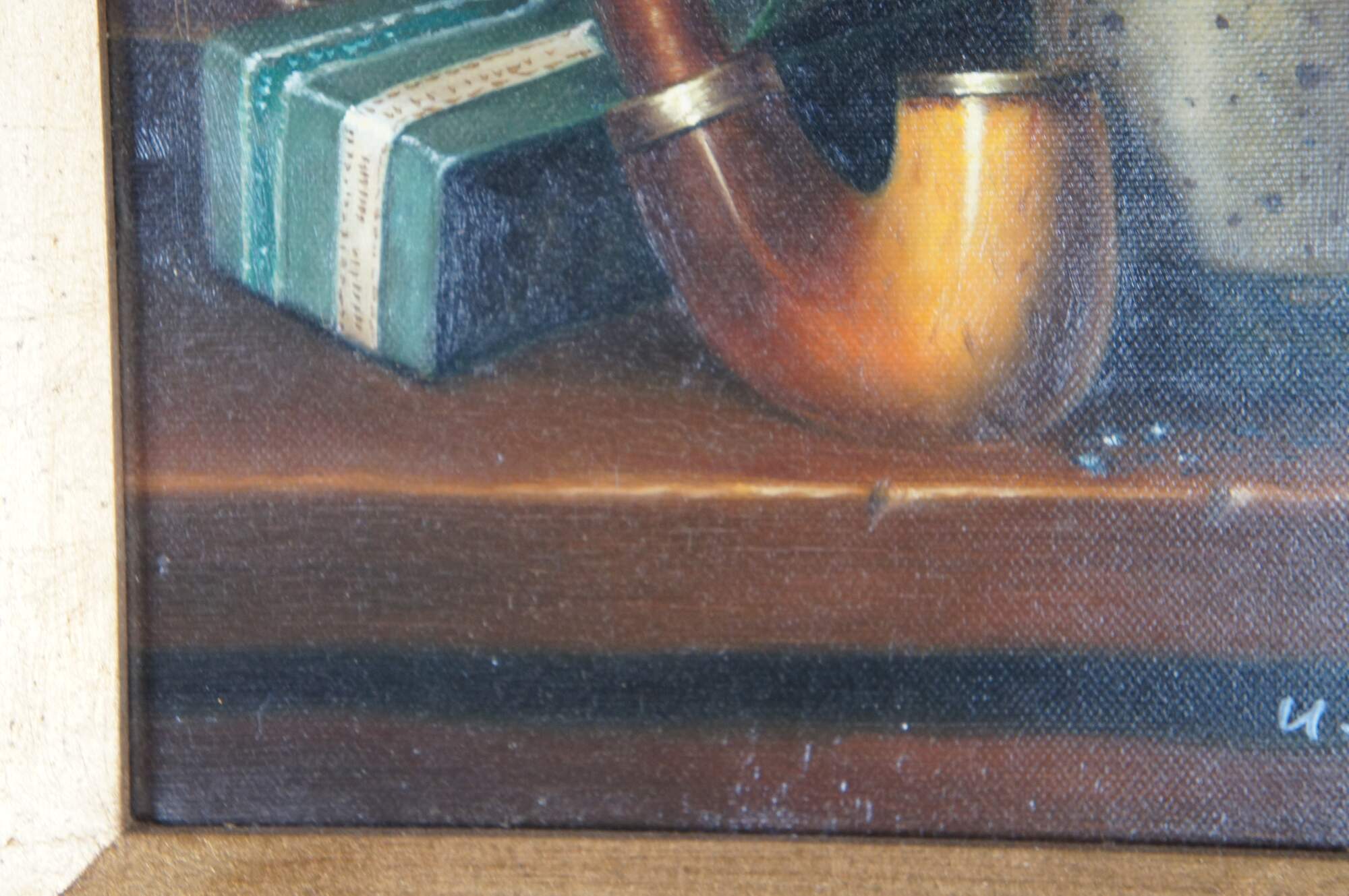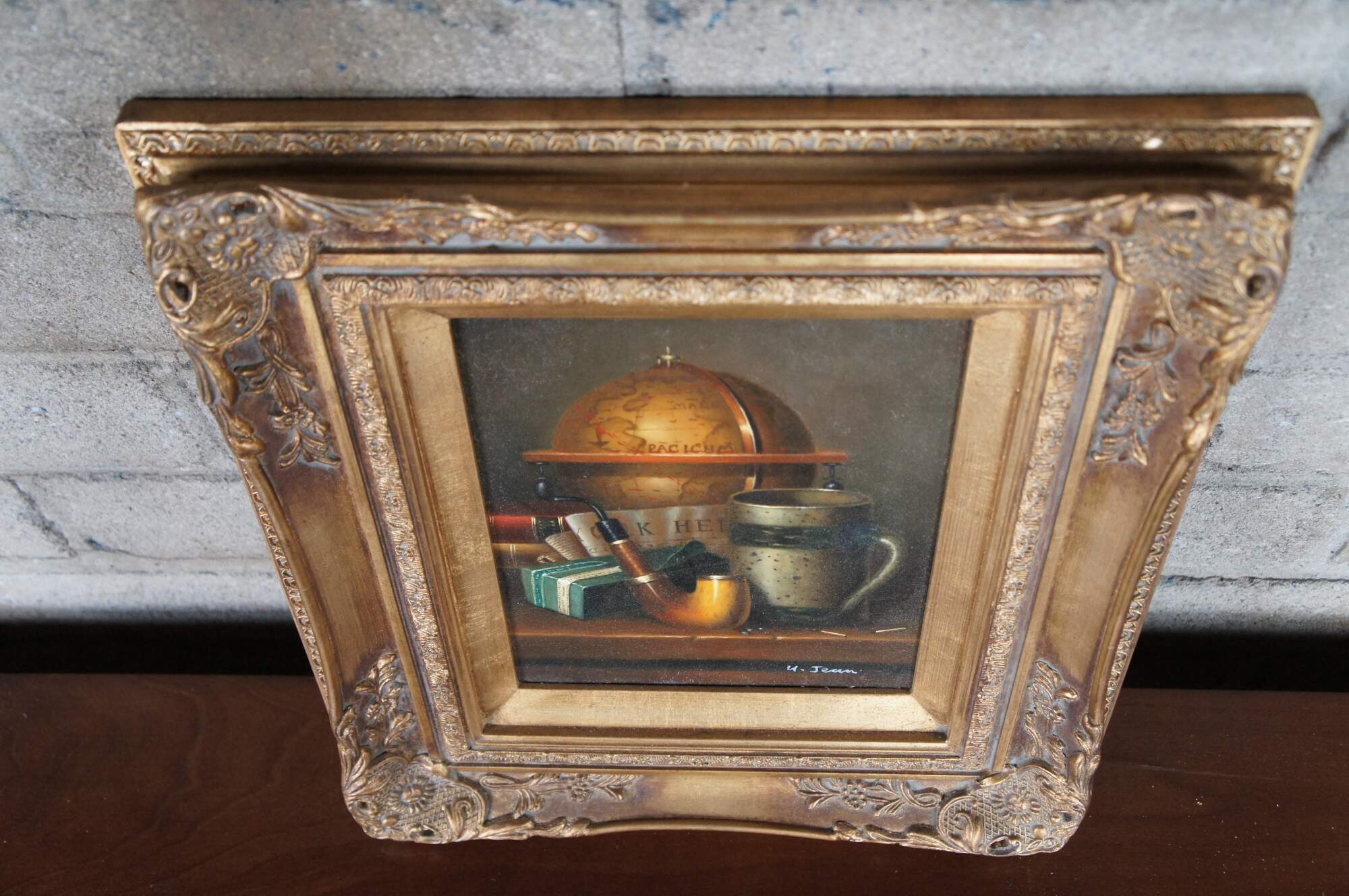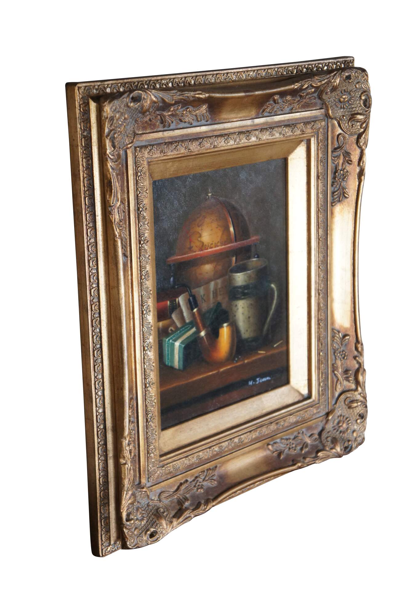 Late 20th Century Still Life Oil Painting on Canvas, signed lower right. Features a globe with the pacific ocean facing out on a desk behind books, newspaper, a pewter mug and sherlock. The painting is Signed by M. Jean and framed in Baroque Manner.