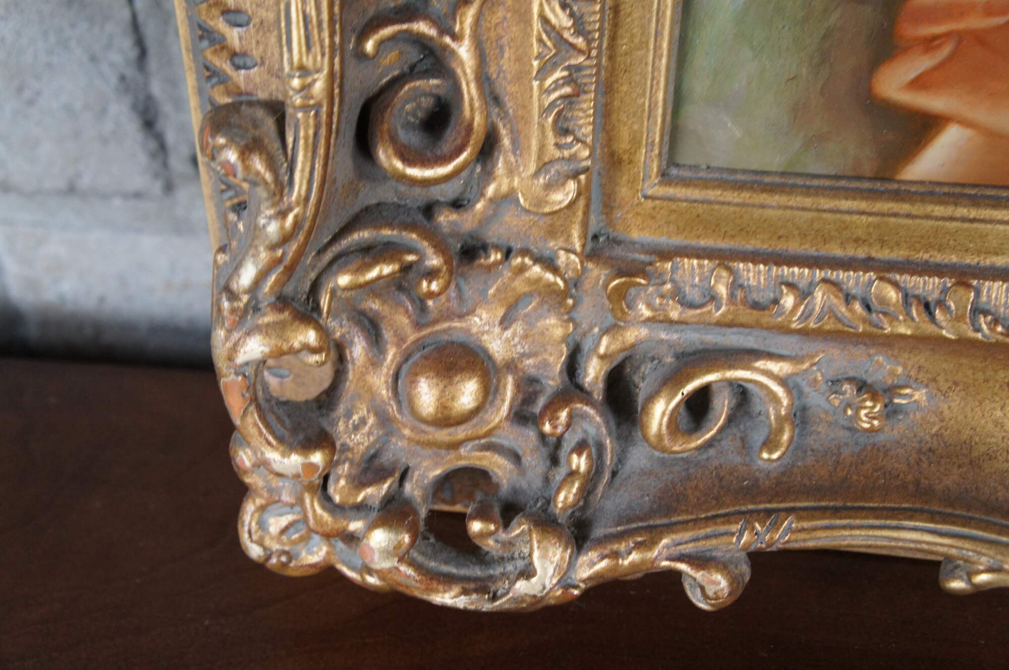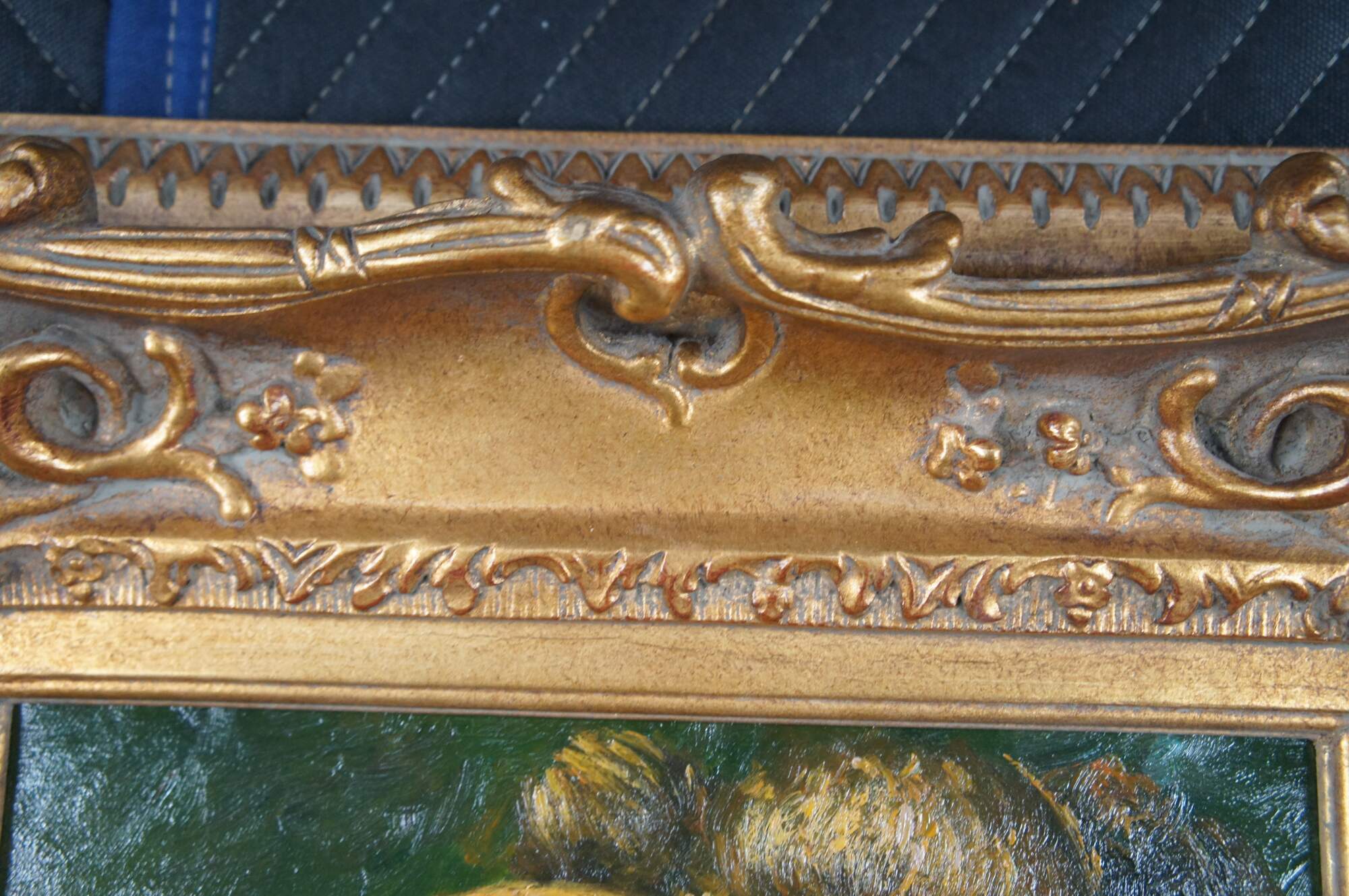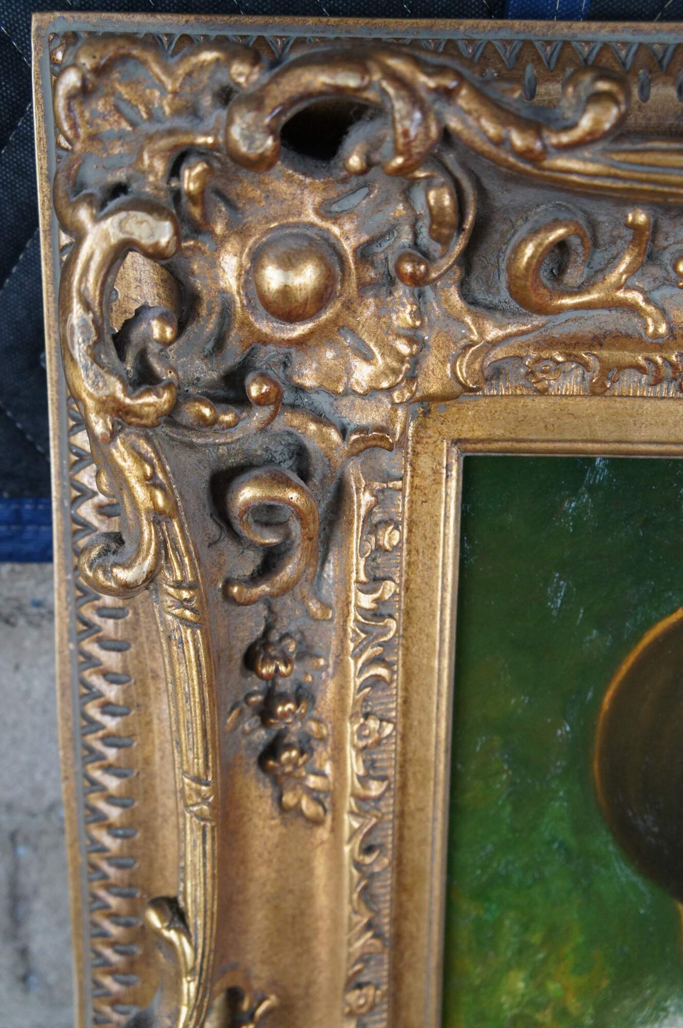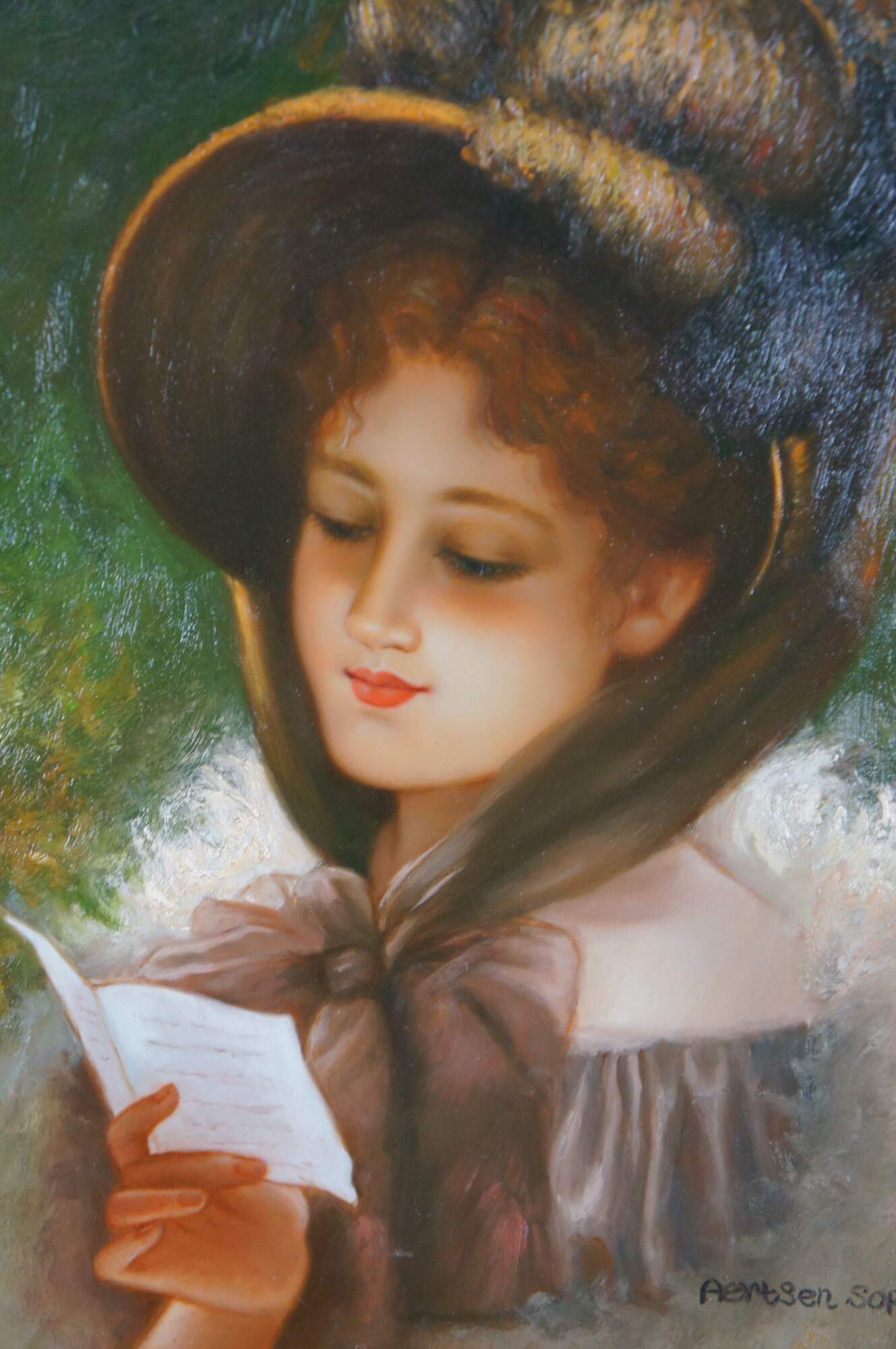 Late 20th Century Portrait After Pieter Aertsen, aptly titled Sophie. Features a young woman with bonnet and letter in hand. Framed in wood, French Style with a gold finish The oil painting is on canvas and signed lower right.