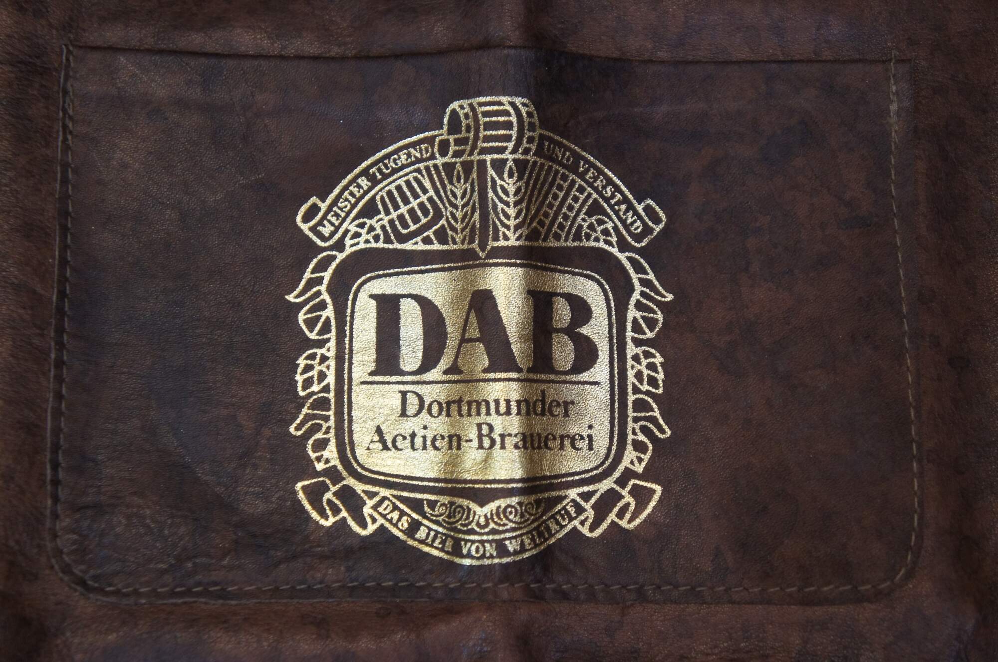 Pair of vintage German beer company aprons - on pleather Schwaben Brau in white and silver with neck loop and waist ties, and one DAB / Dortmunder Actien-Brauerei half round brown leather with waist chain.