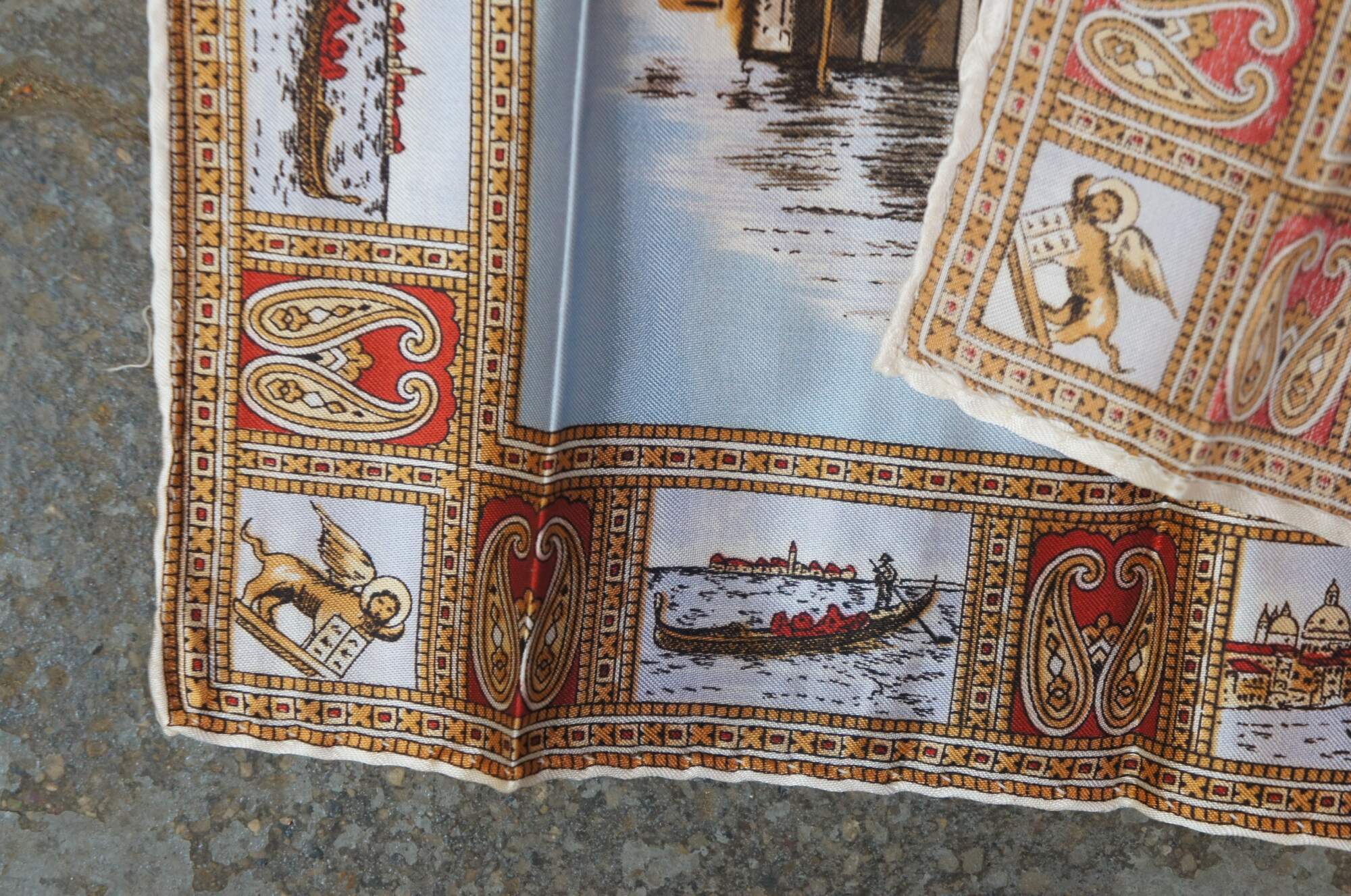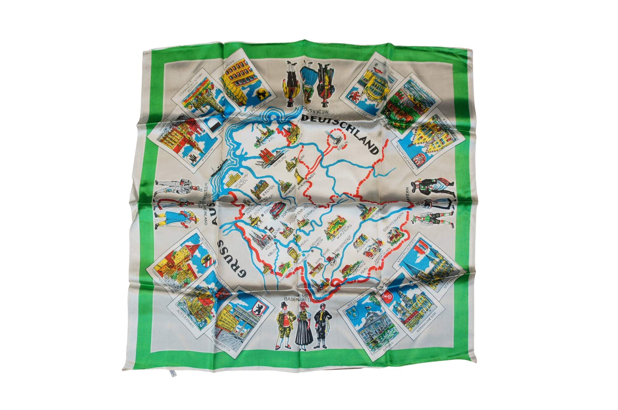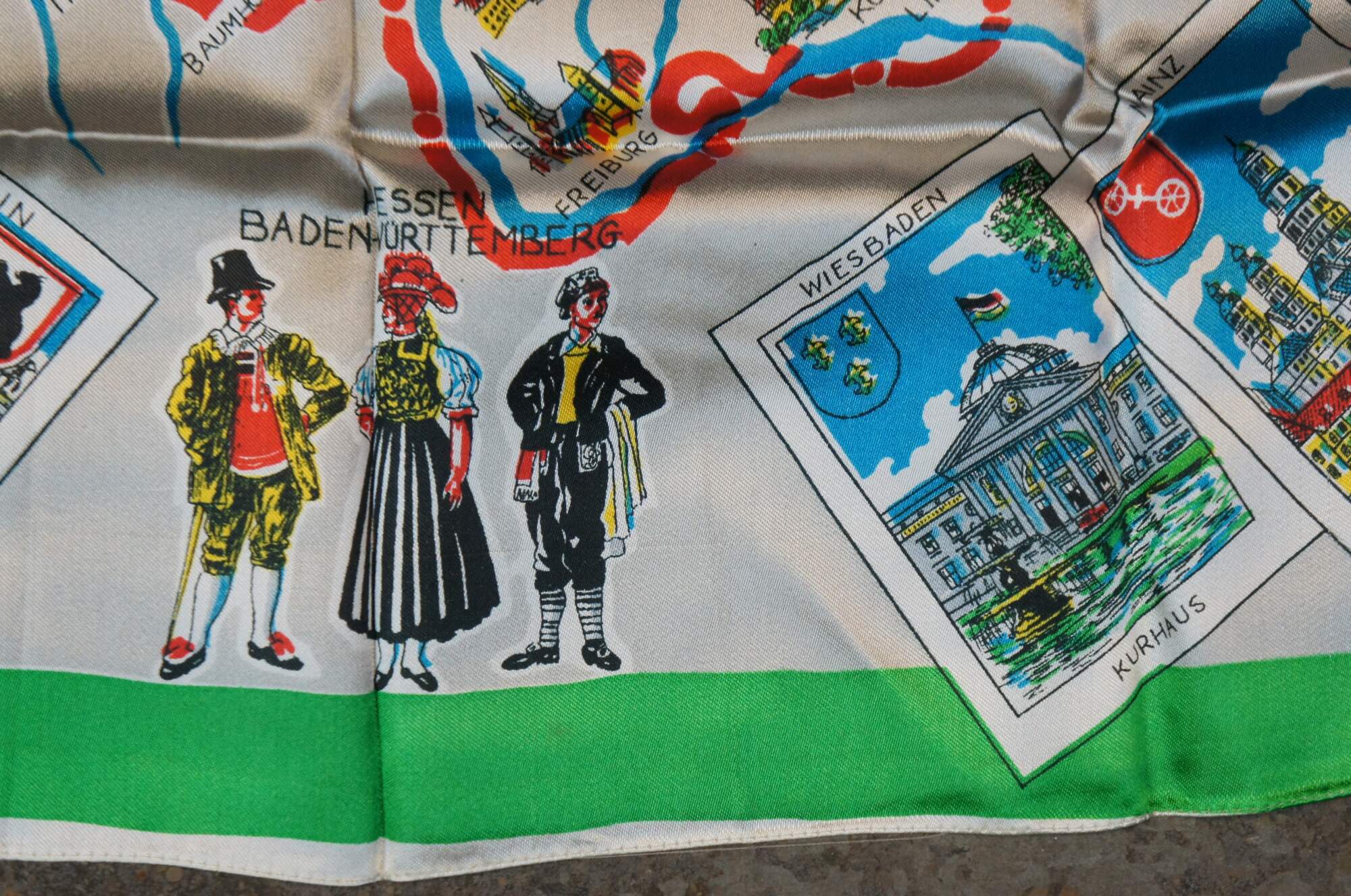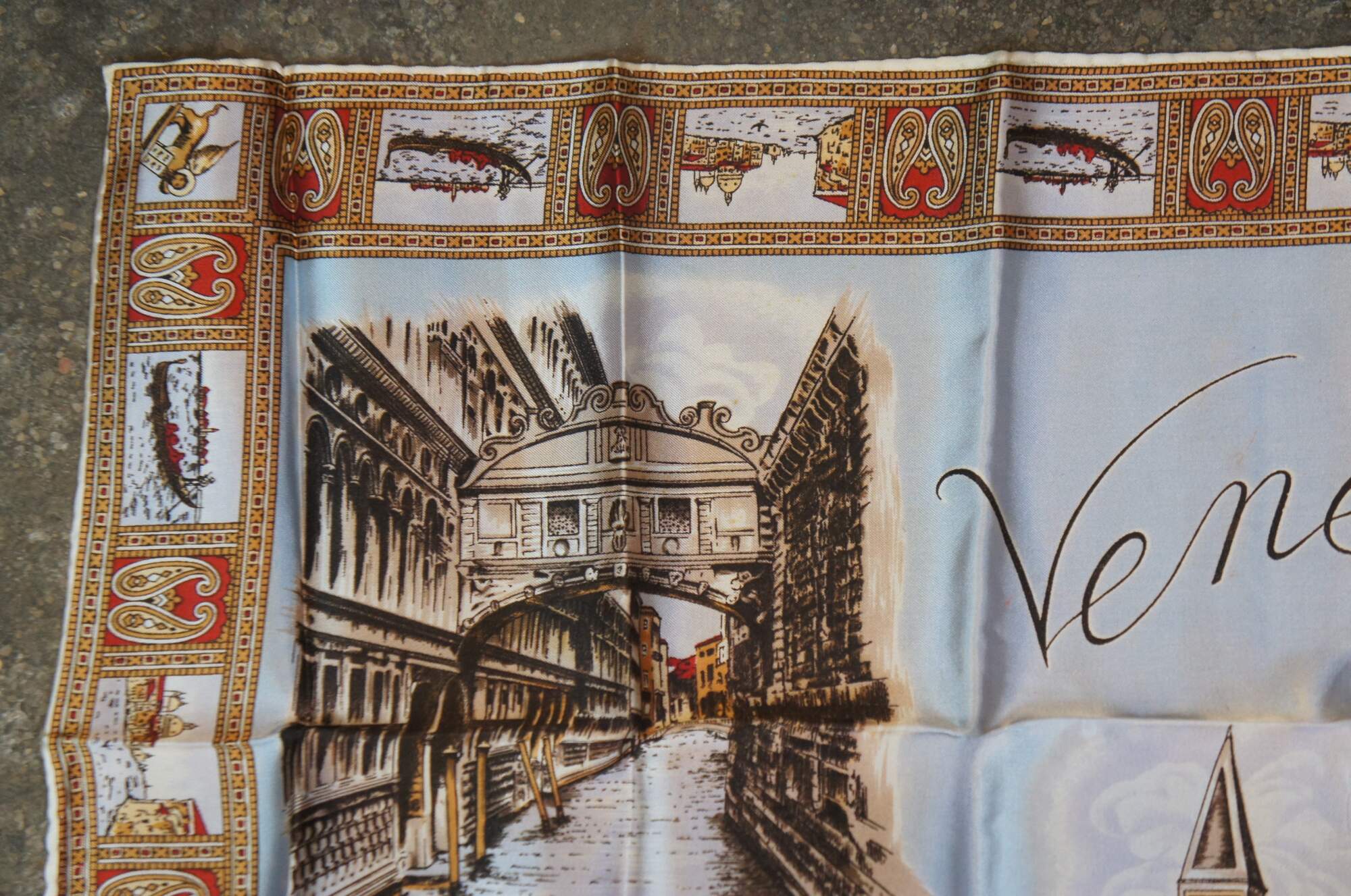 Set of three mid to late 20th century souvenir scarves / each scarf depicting the landmarks of Venice, Italy (Venezia), landmarks and city map of Paris, France (by Lydia, Paris - 100% Polyester Made in Italy), and landmarks and major cities of Germany (Gruss aus Deutschland - Greetings from Germany - KD6 Copyright EH).