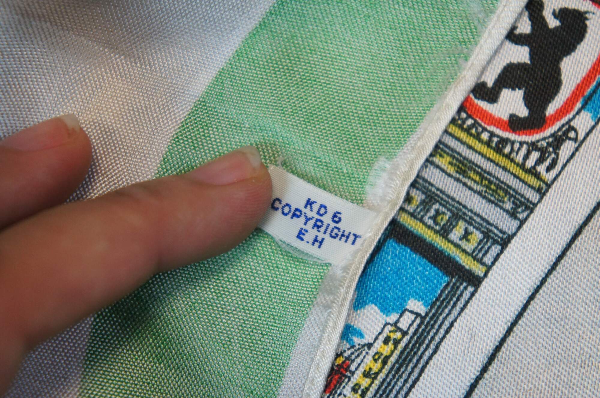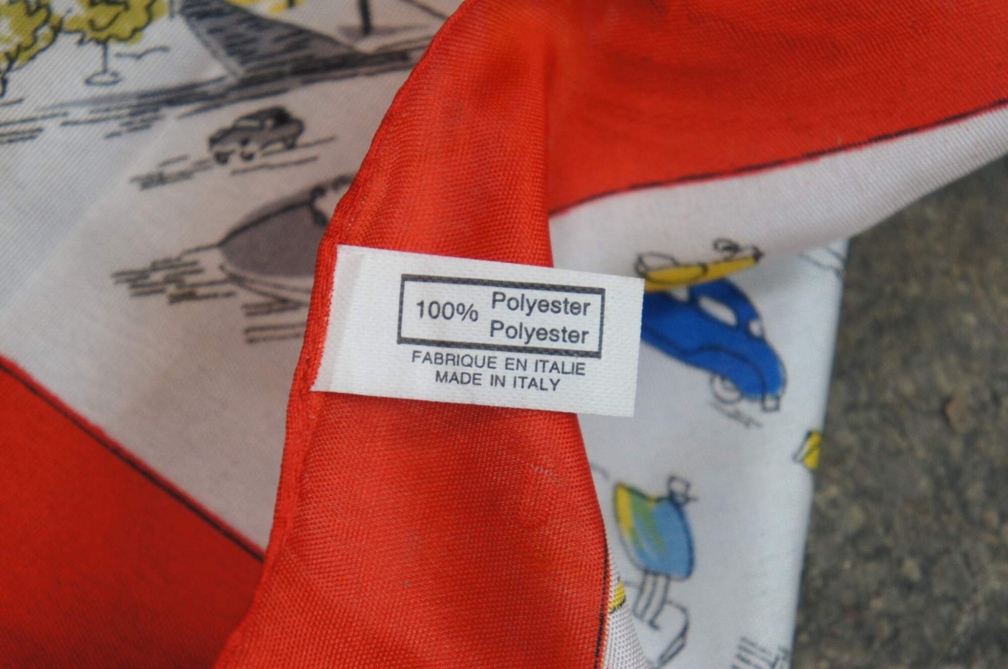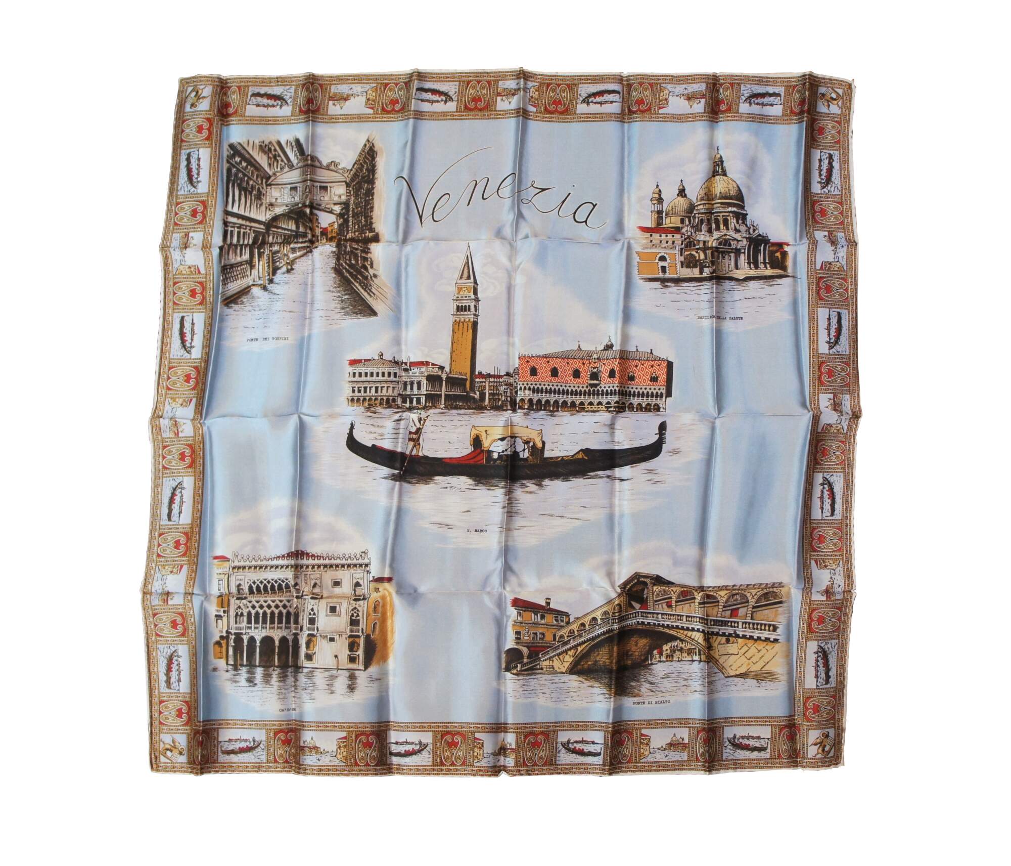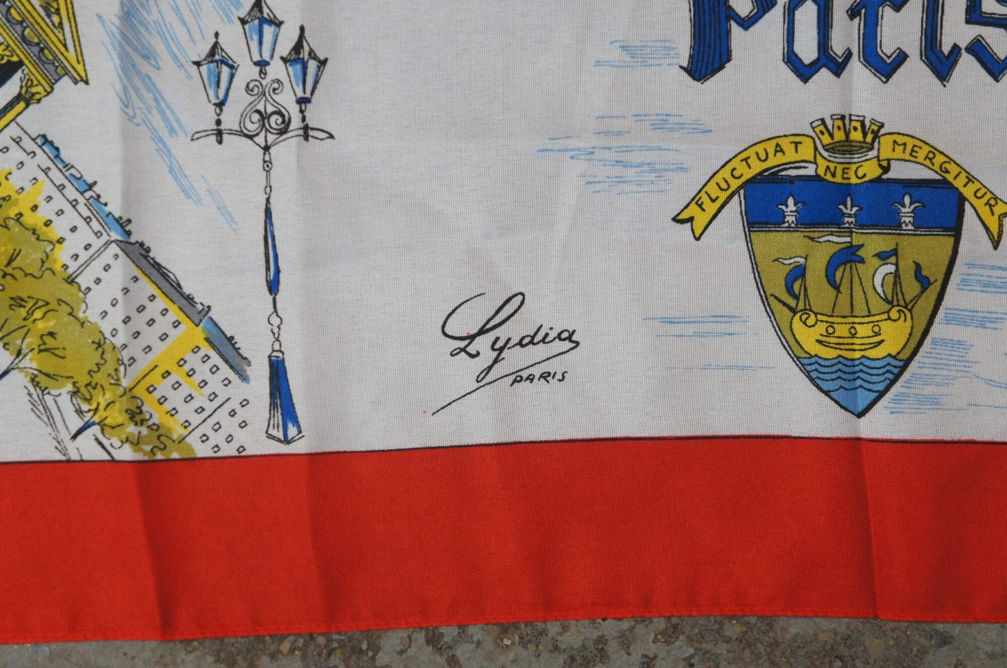 Set of three mid to late 20th century souvenir scarves / each scarf depicting the landmarks of Venice, Italy (Venezia), landmarks and city map of Paris, France (by Lydia, Paris - 100% Polyester Made in Italy), and landmarks and major cities of Germany (Gruss aus Deutschland - Greetings from Germany - KD6 Copyright EH).