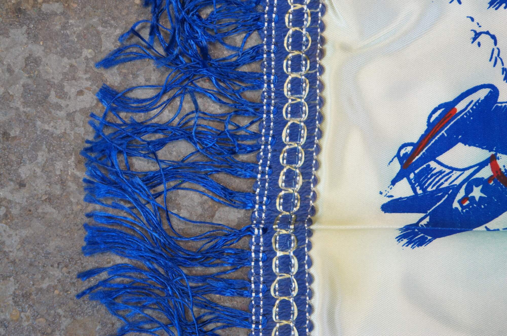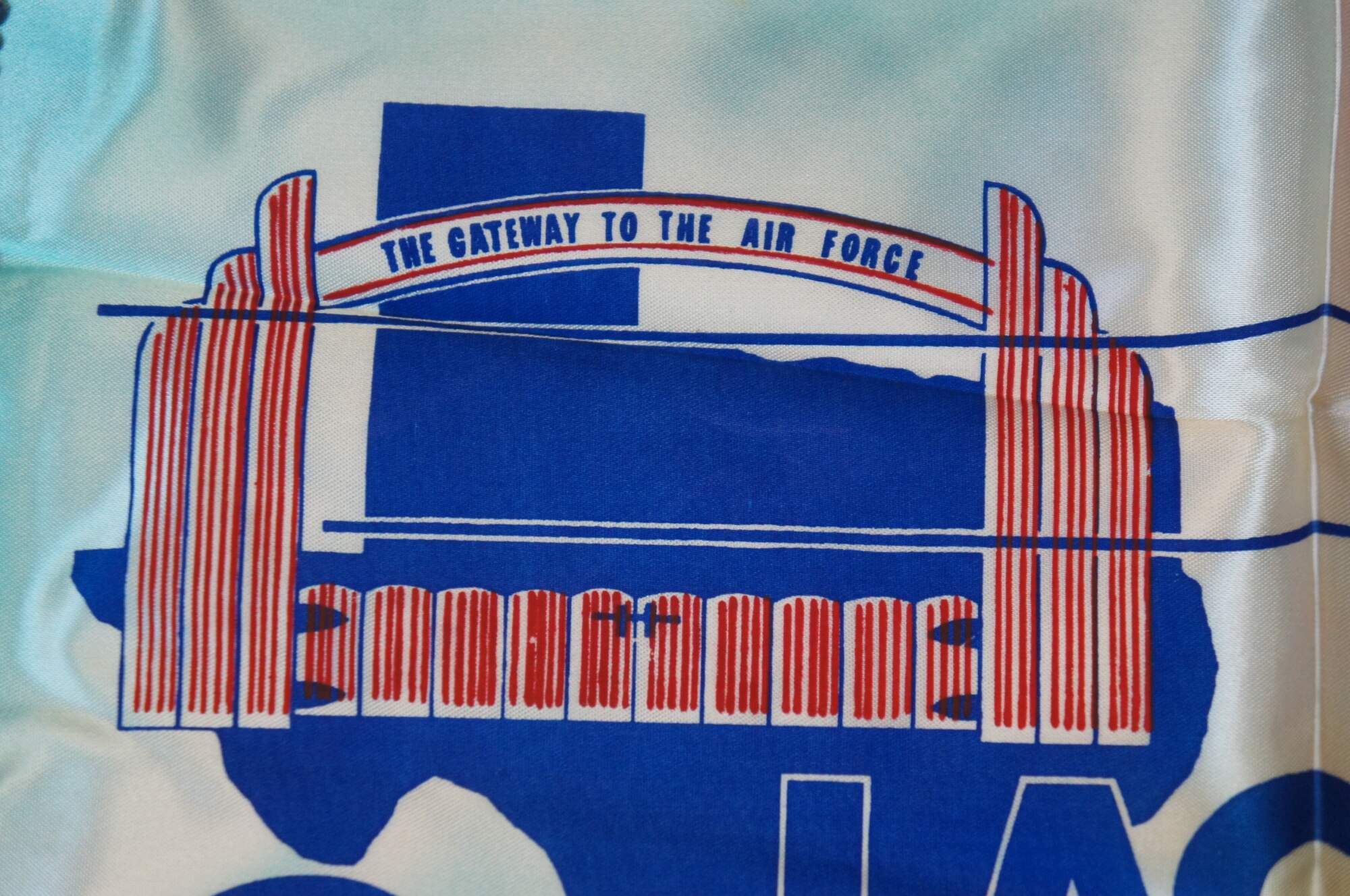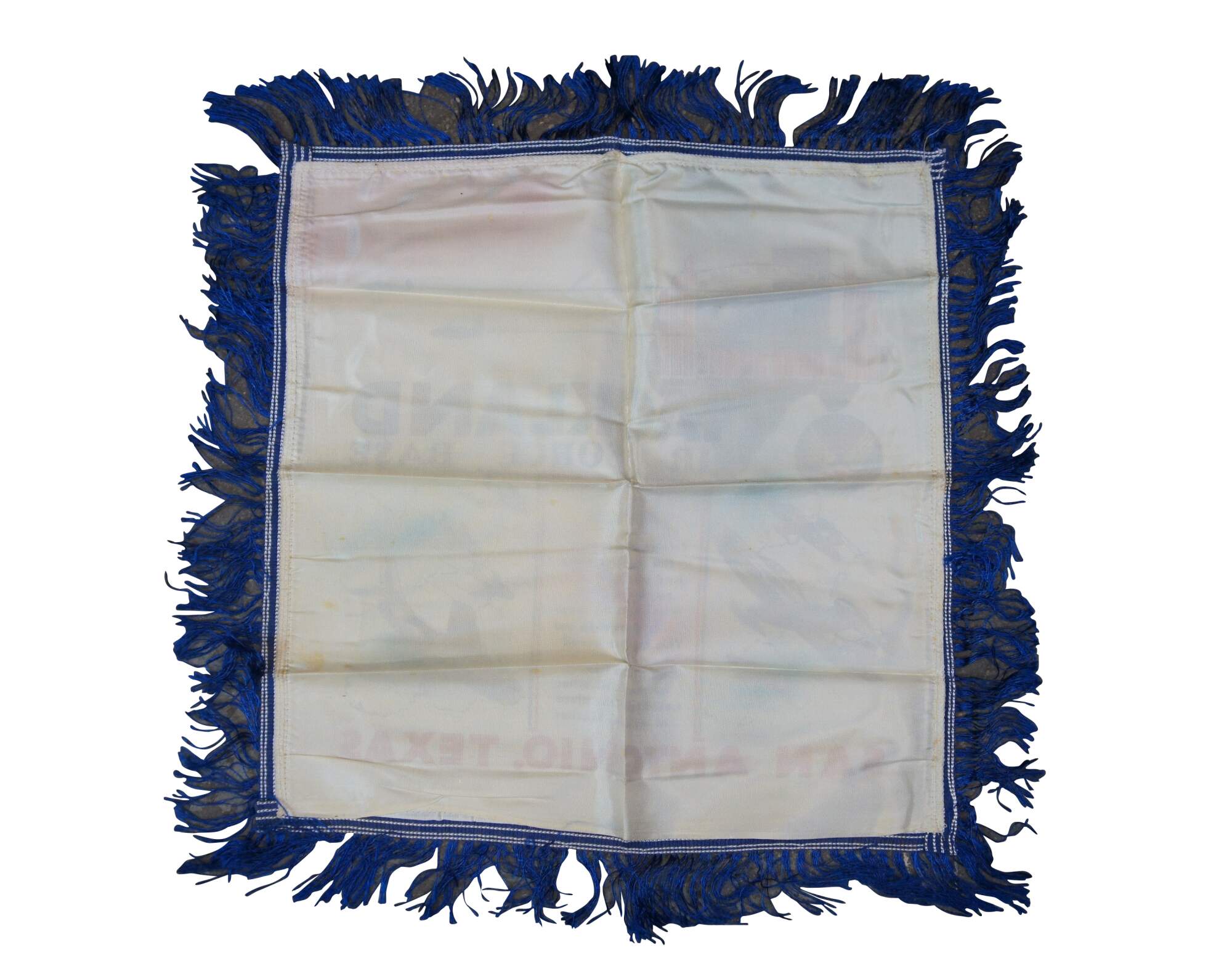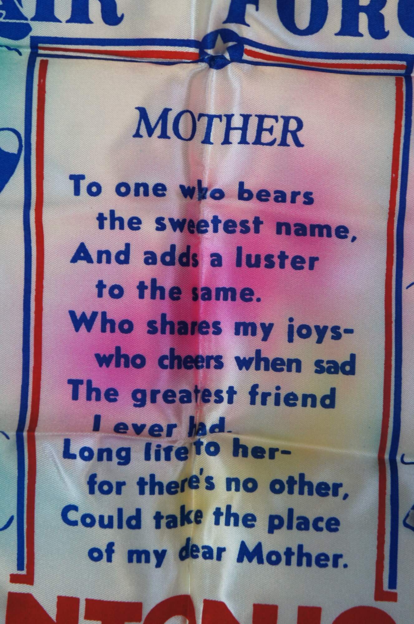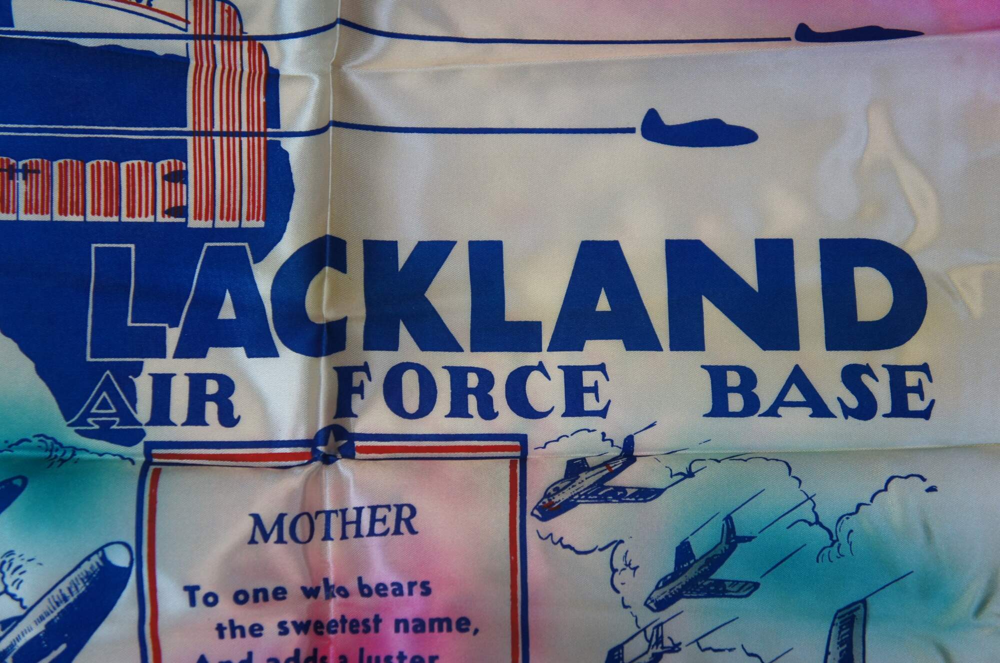 Mid 20th century silky pillow case / cover / sham from Lackland Air Force Army Base in San Antonio, Texas, featuring a poem dedicated to Mothers. Blue and white printed square shape with watercolor accents and braided / fringe trim. Includes original, unused carboard mailing box.