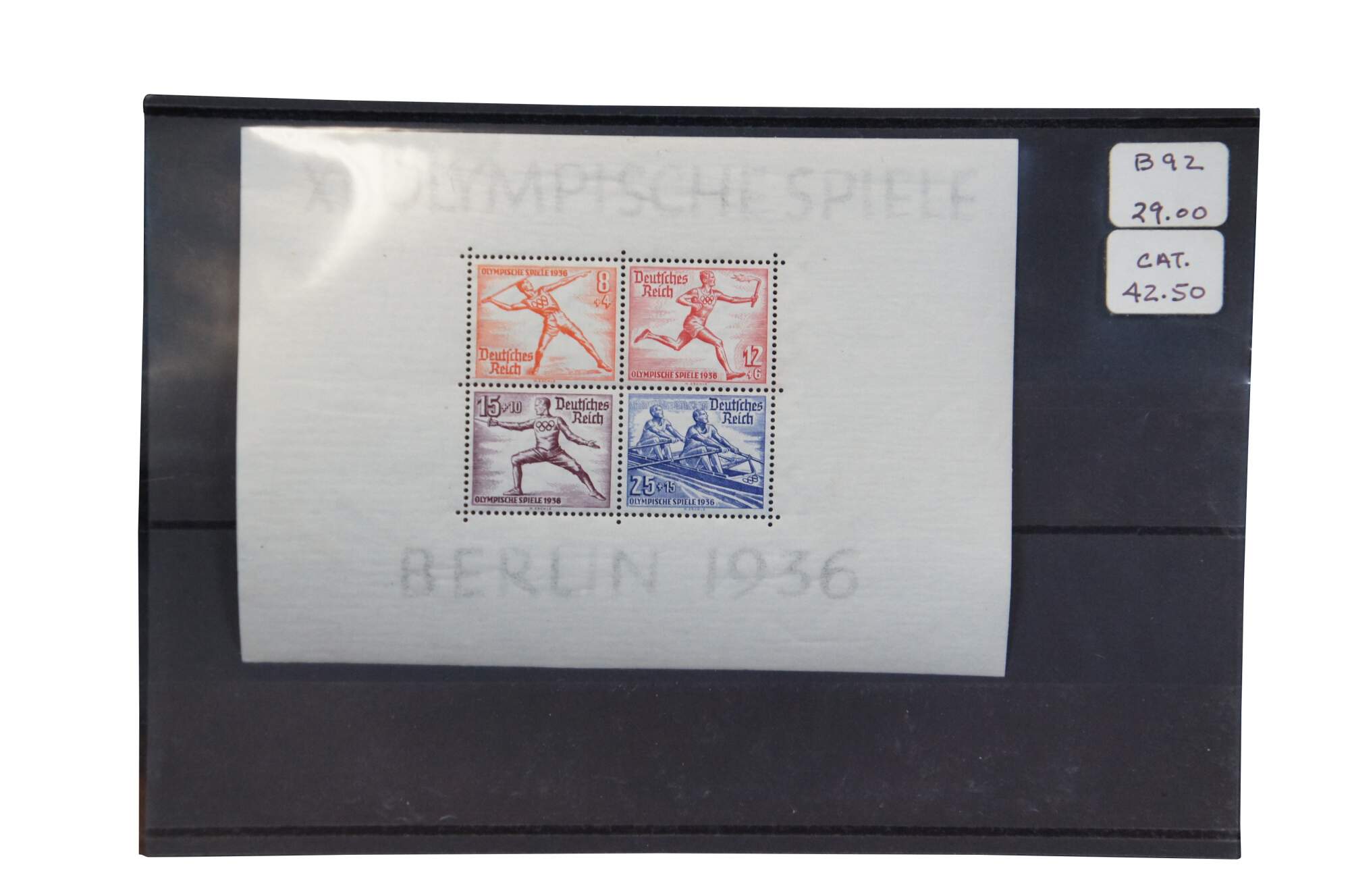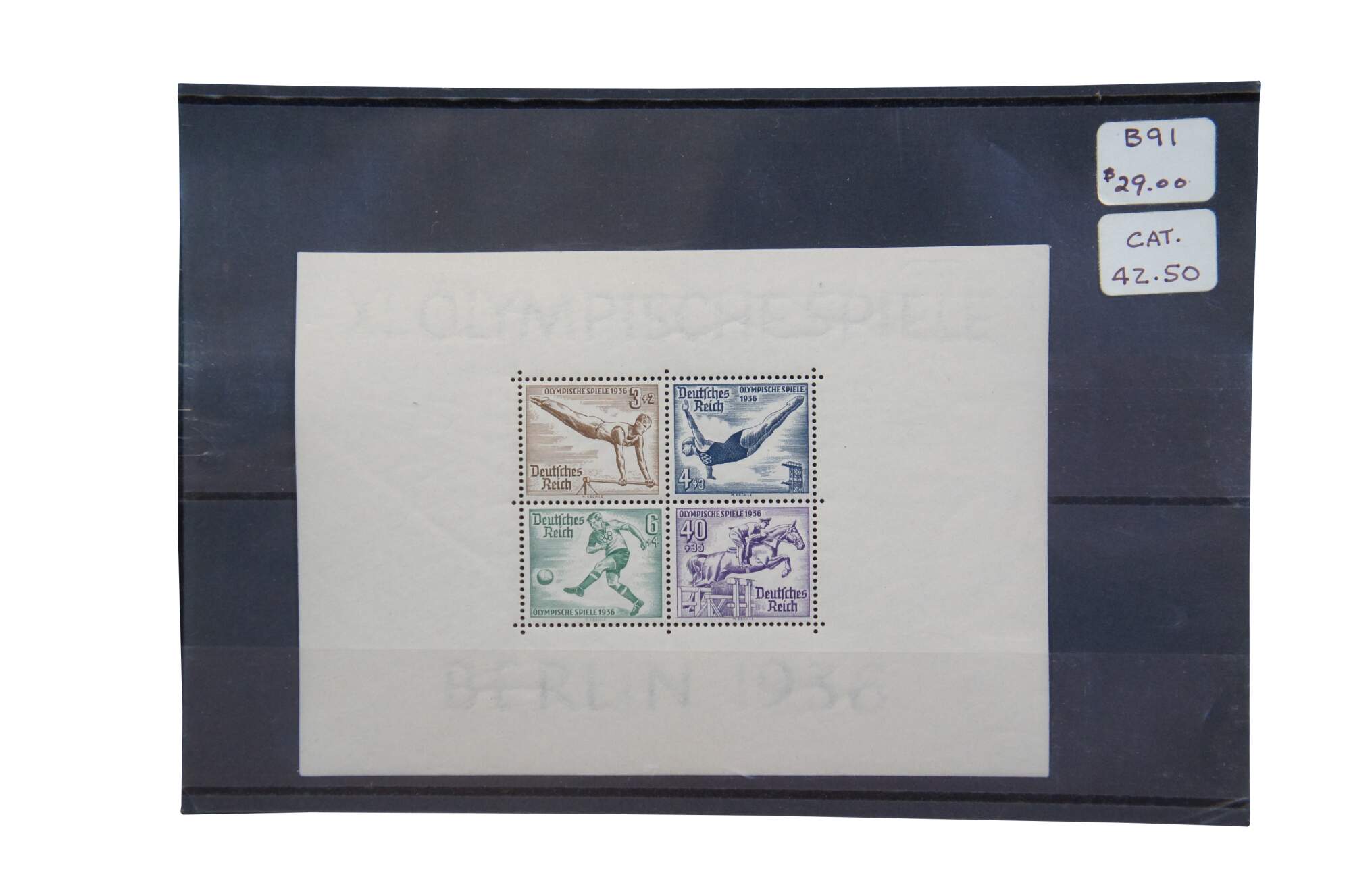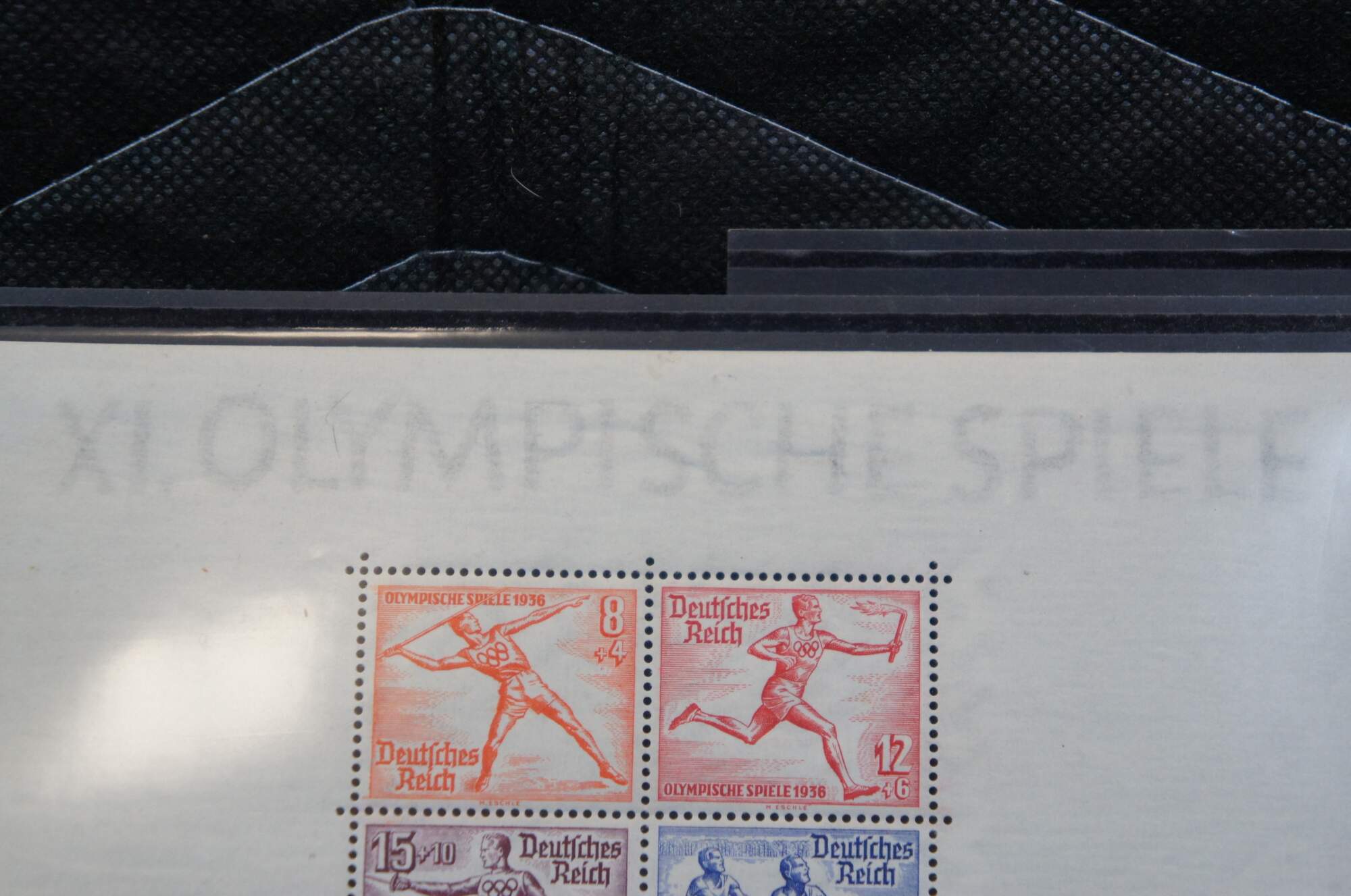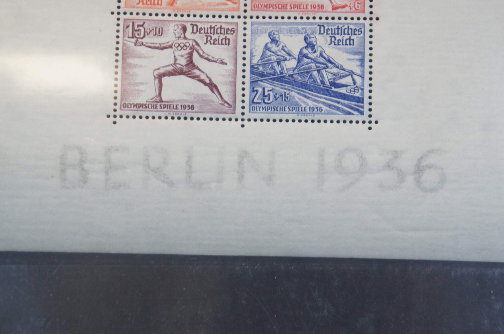 2 intact sheets of four 1936 Olympiche Spiele Berlin 1936 Olympic Games commemorative postage stamps. Printed in multicolored inks of white paper. Includes protective covers.