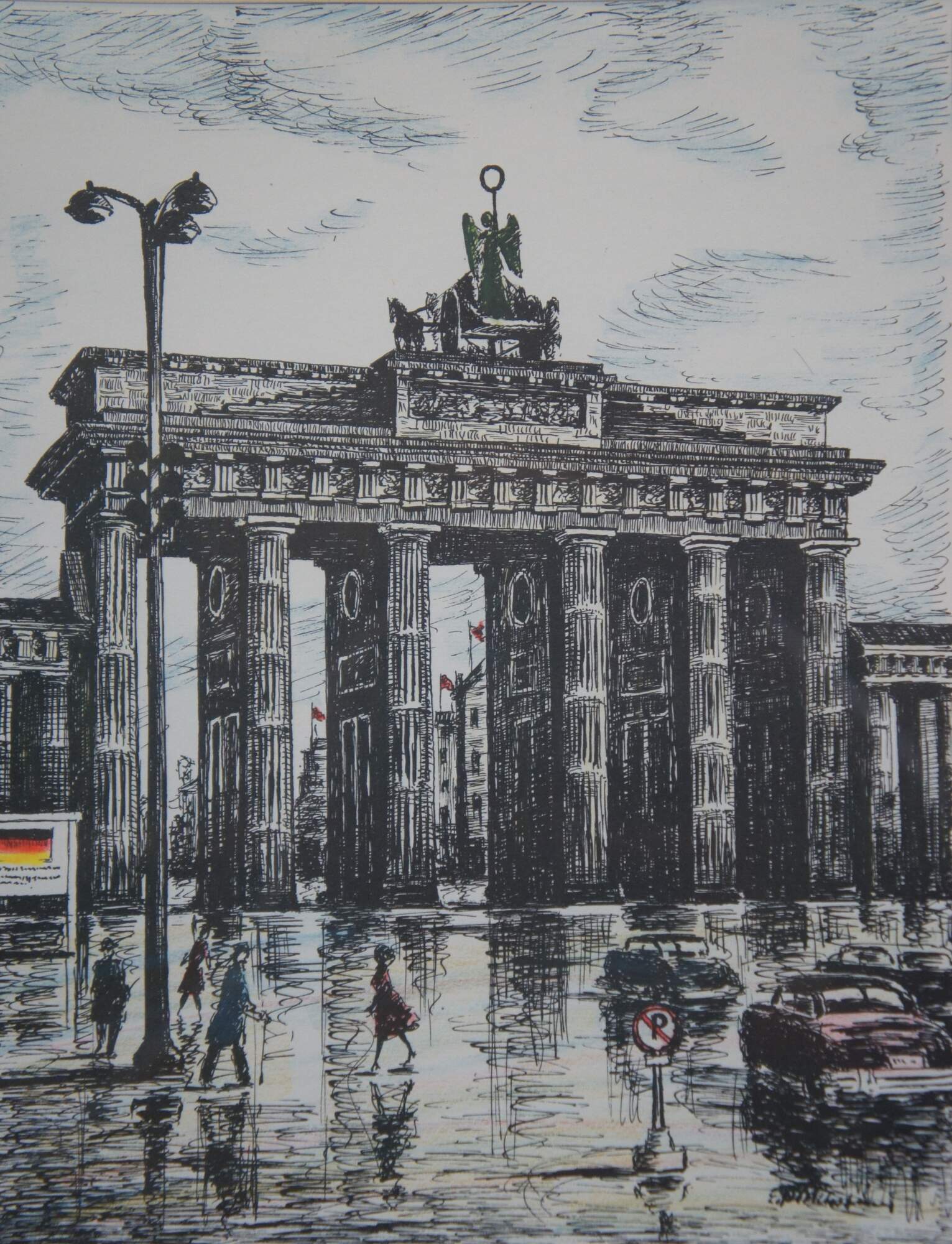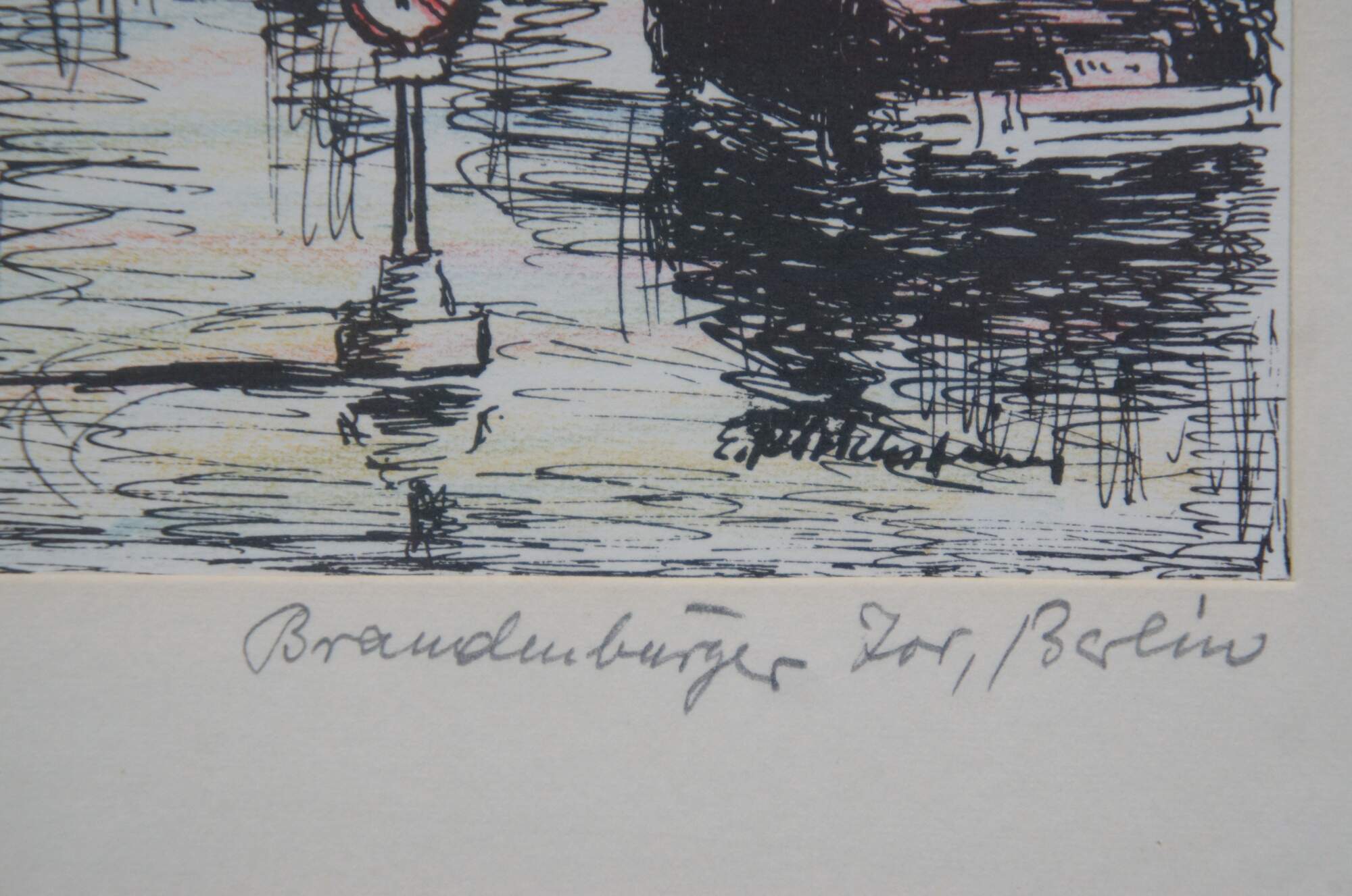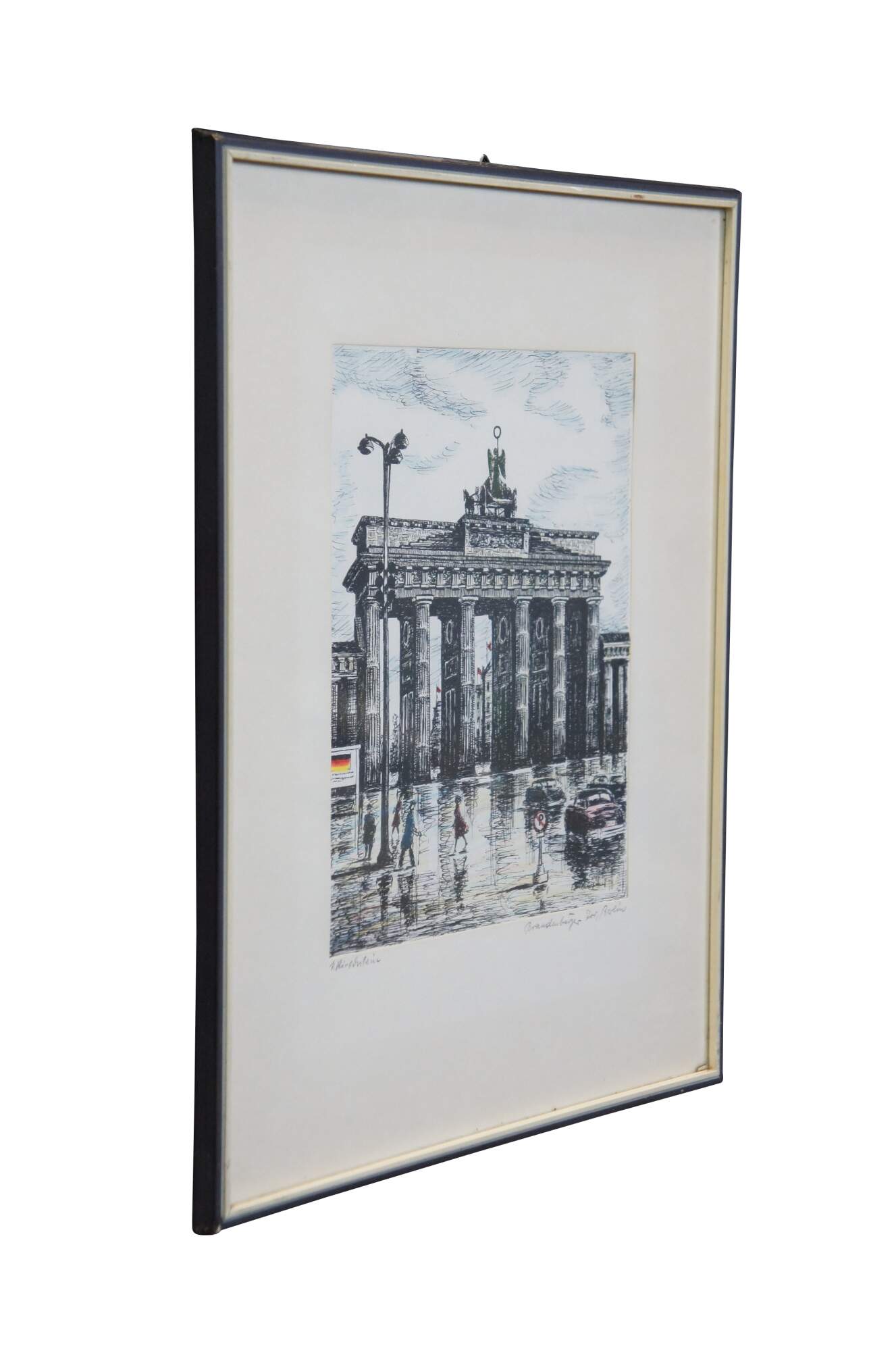 Mid 20th century framed etching of Berlin, Germany's Brandenburg Gate by Erhard Kirchstein (1920-1972). Pencil signed on mat. Black and white beveled frame; white mat.