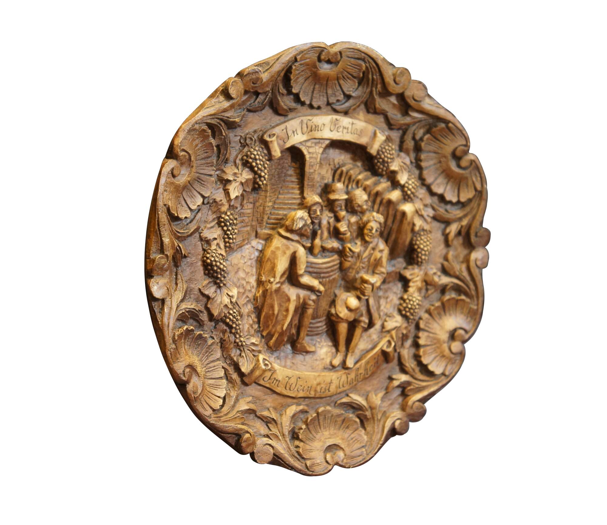Mid to late 20th century Black Forest style resin wall plate, carved in relief with a scallop, foliate and grape vine border around a group of men drinking in a tavern with the dual language (Latin and German) legend "In Vino Veritas - Im Wein ist Wahrheit" (There is truth in wine). Painted to resemble wood.