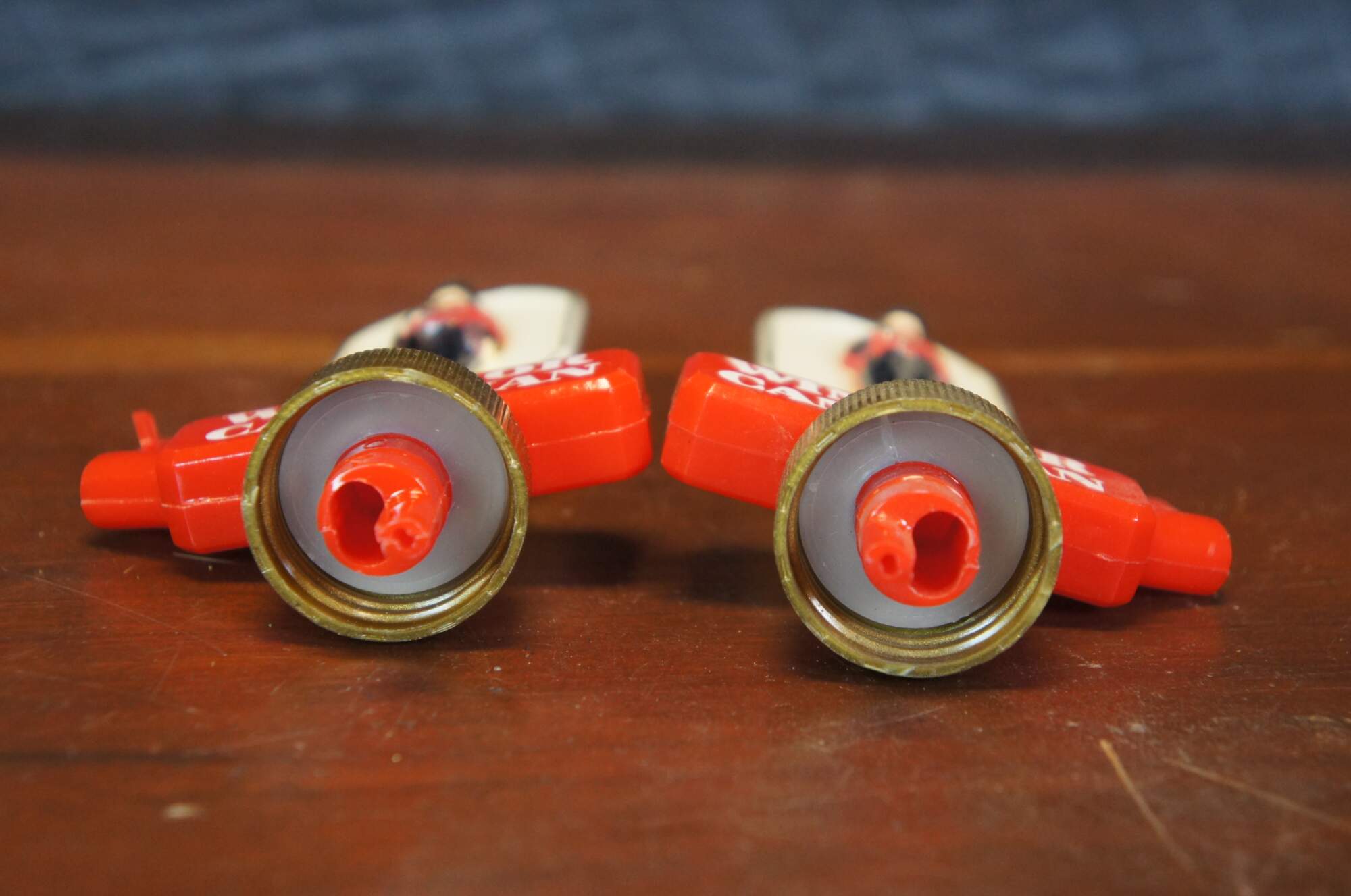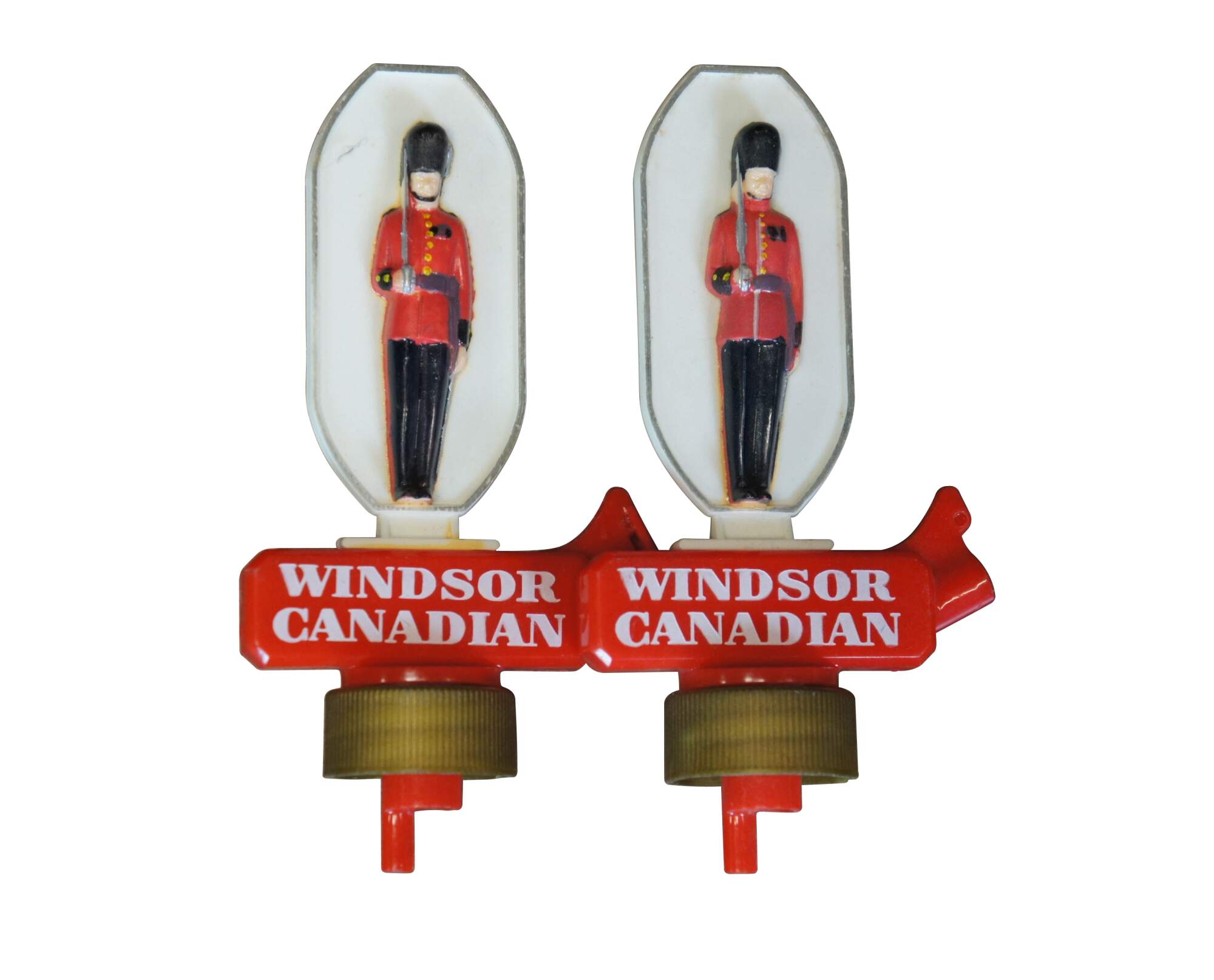 Pair of mid 20th century platic bottle toppers / pourers representing Windsor Candaian whiskey. Gold and red screw top / spout topped with a red coat and fur hat wearing Canadian Grenadier on a white oval. Made in USA by Perfection Plastics - Philadelphia 32.