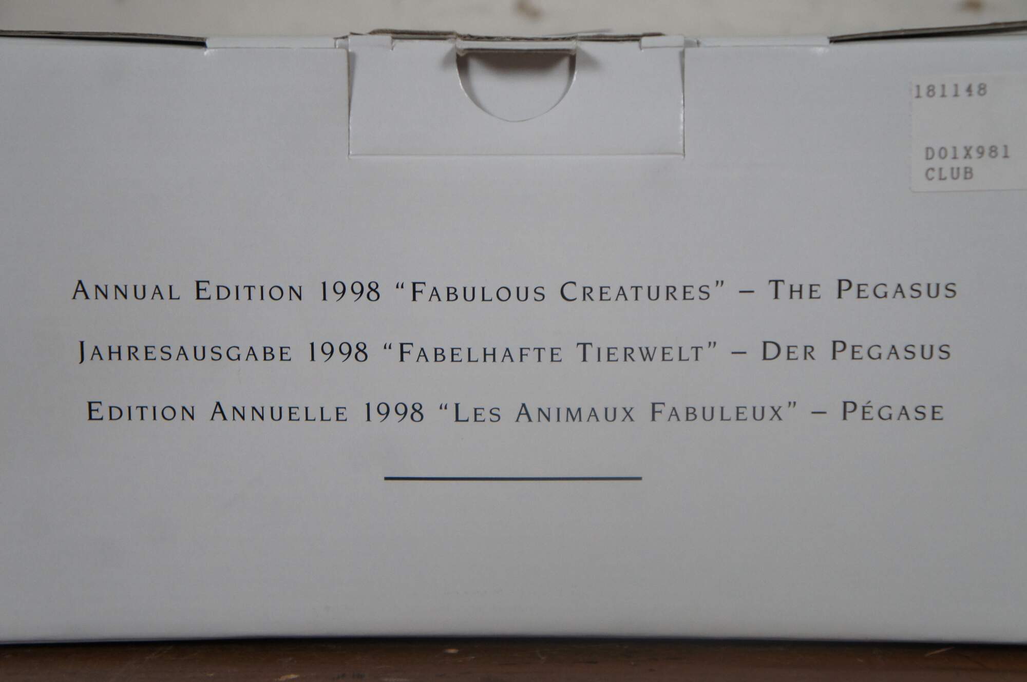 Swarovski Collectors Society 1998 Annual Edition, Fabulous Creatures series, The Pegasus Horse. Clear crystal figurine in the shape of a Greek pegasus with frosted mane / tail, and dark eyes. Includes original packaging. Made in Austria.