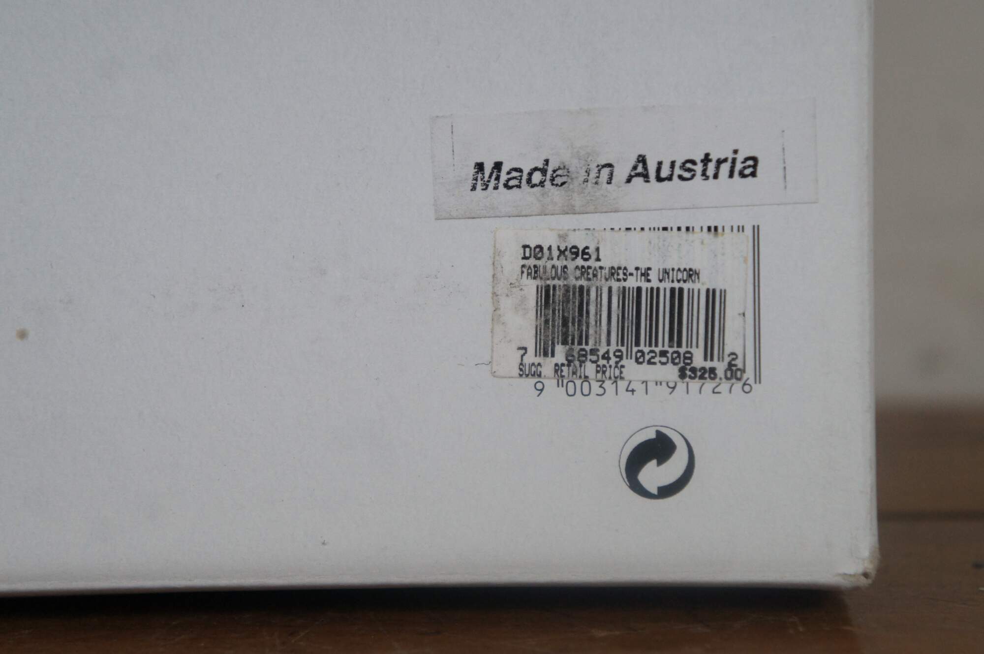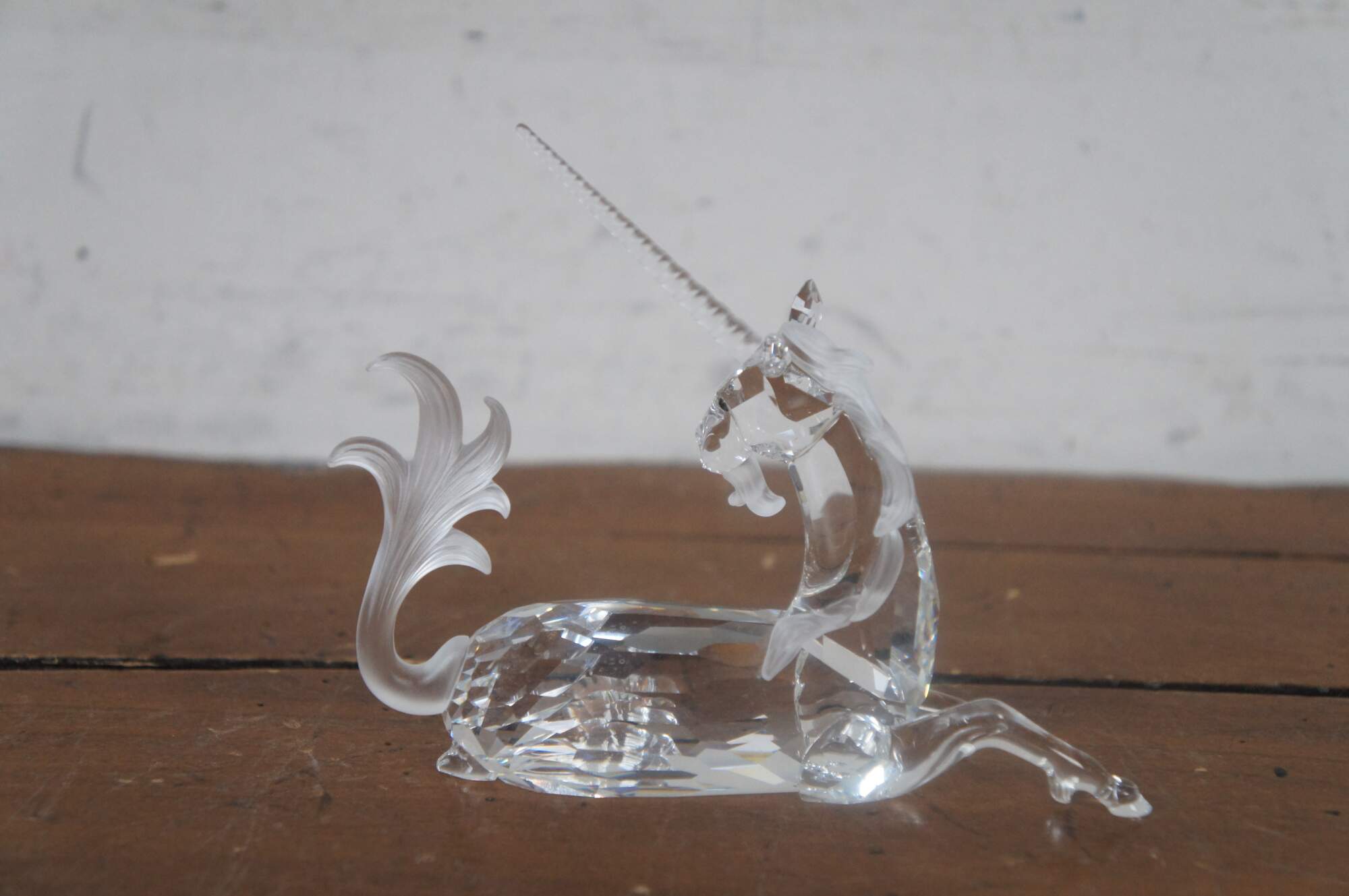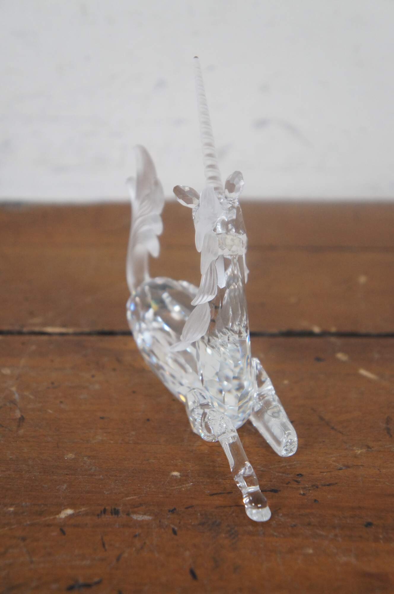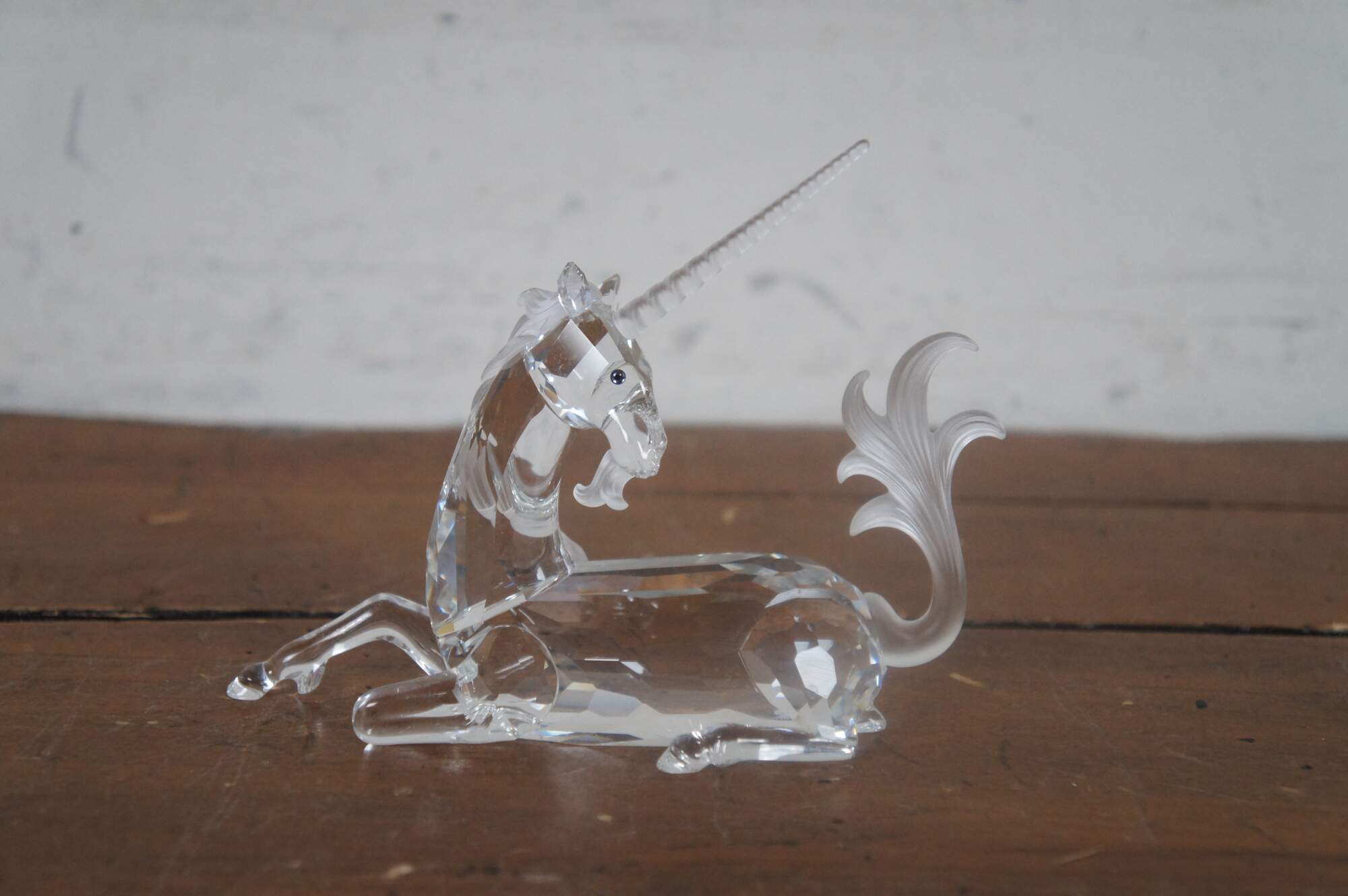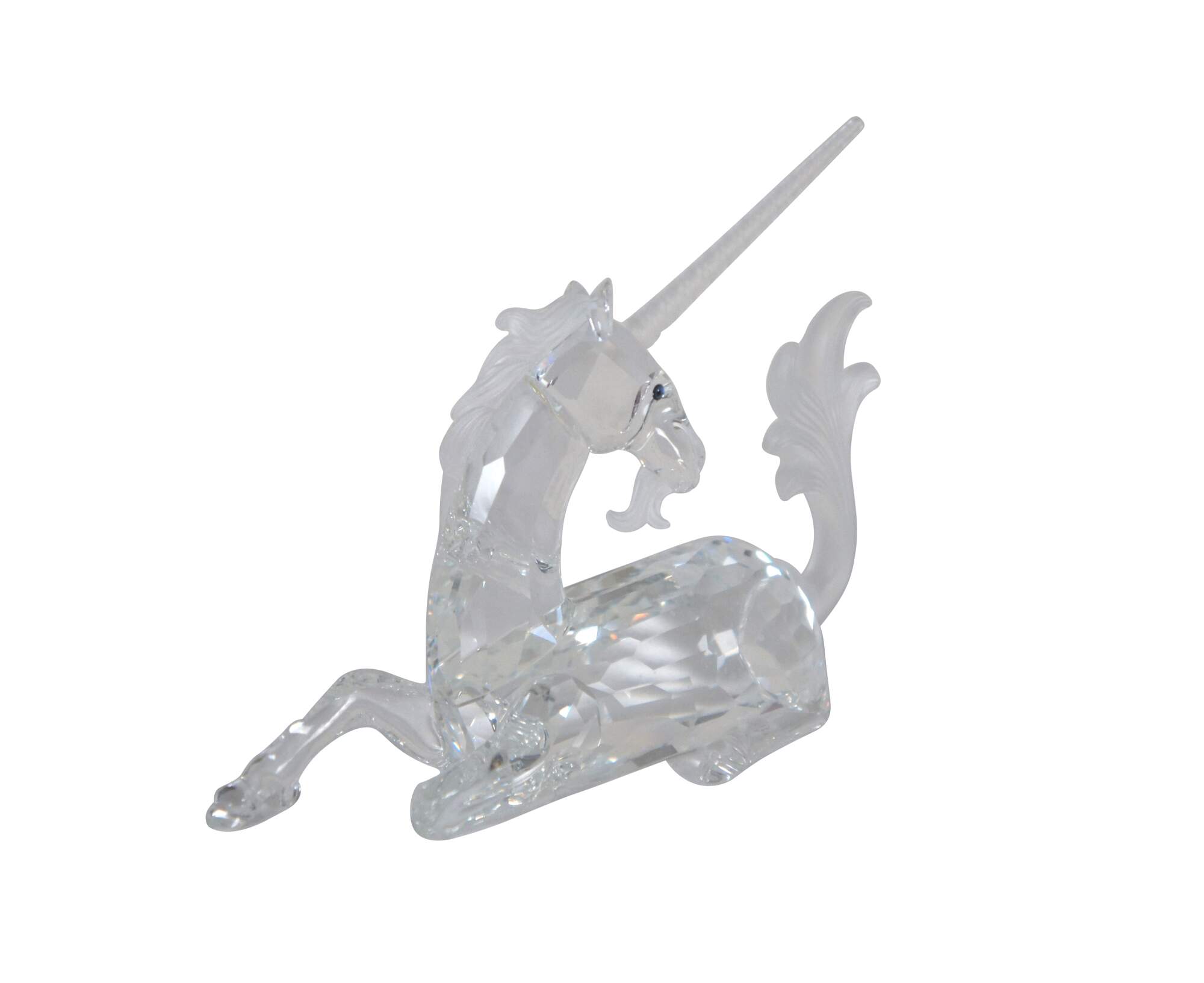 Swarovski Collectors Society 1996 Annual Edition, Fabulous Creatures series, The Unicorn. Clear crystal figurine in the shape of a unicorn, inspired by the 15th century tapestry series "Hunt of the Unicorn," with frosted horn / tail and blue eyes. Made in Austria. Includes original packaging.