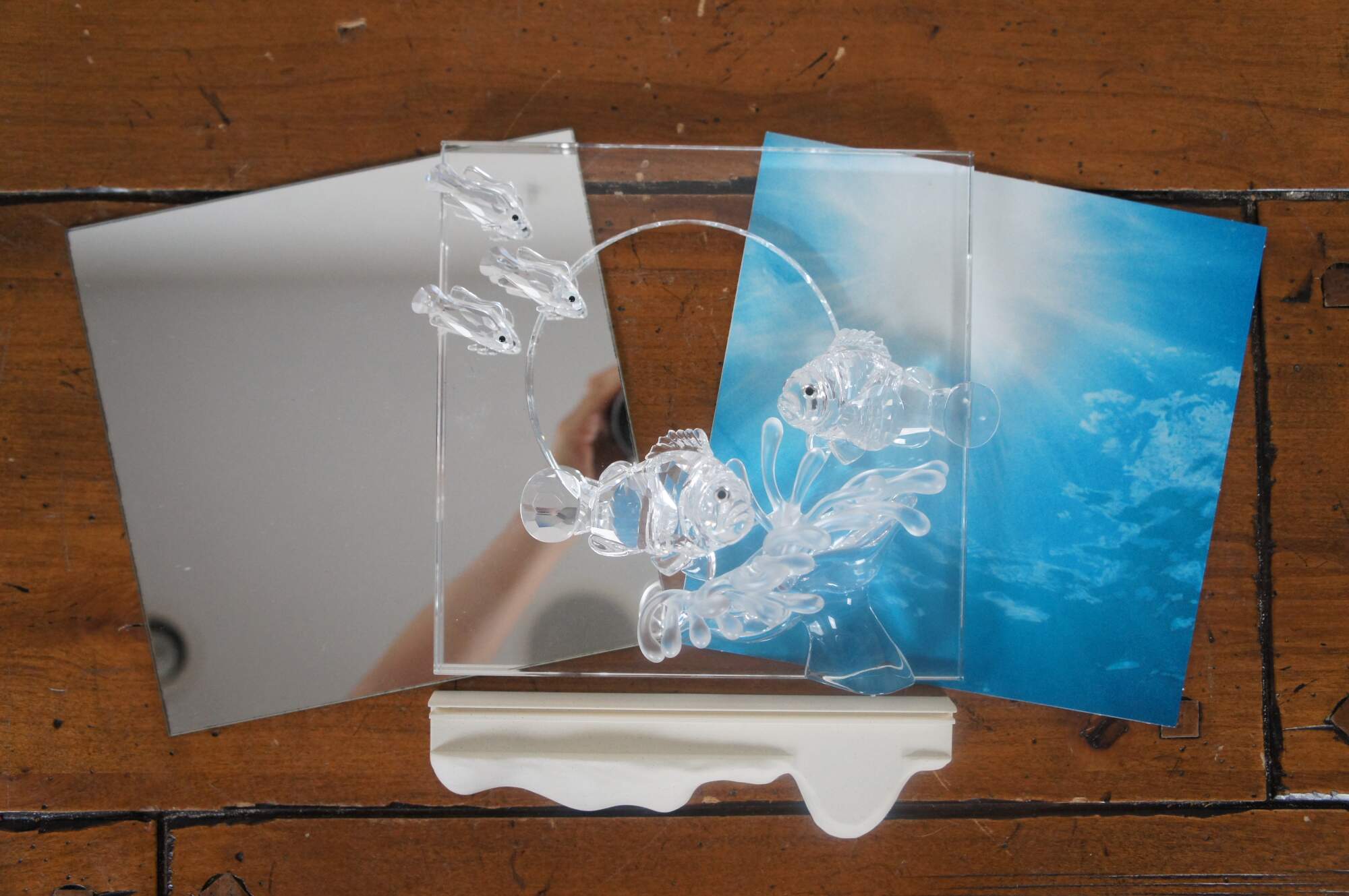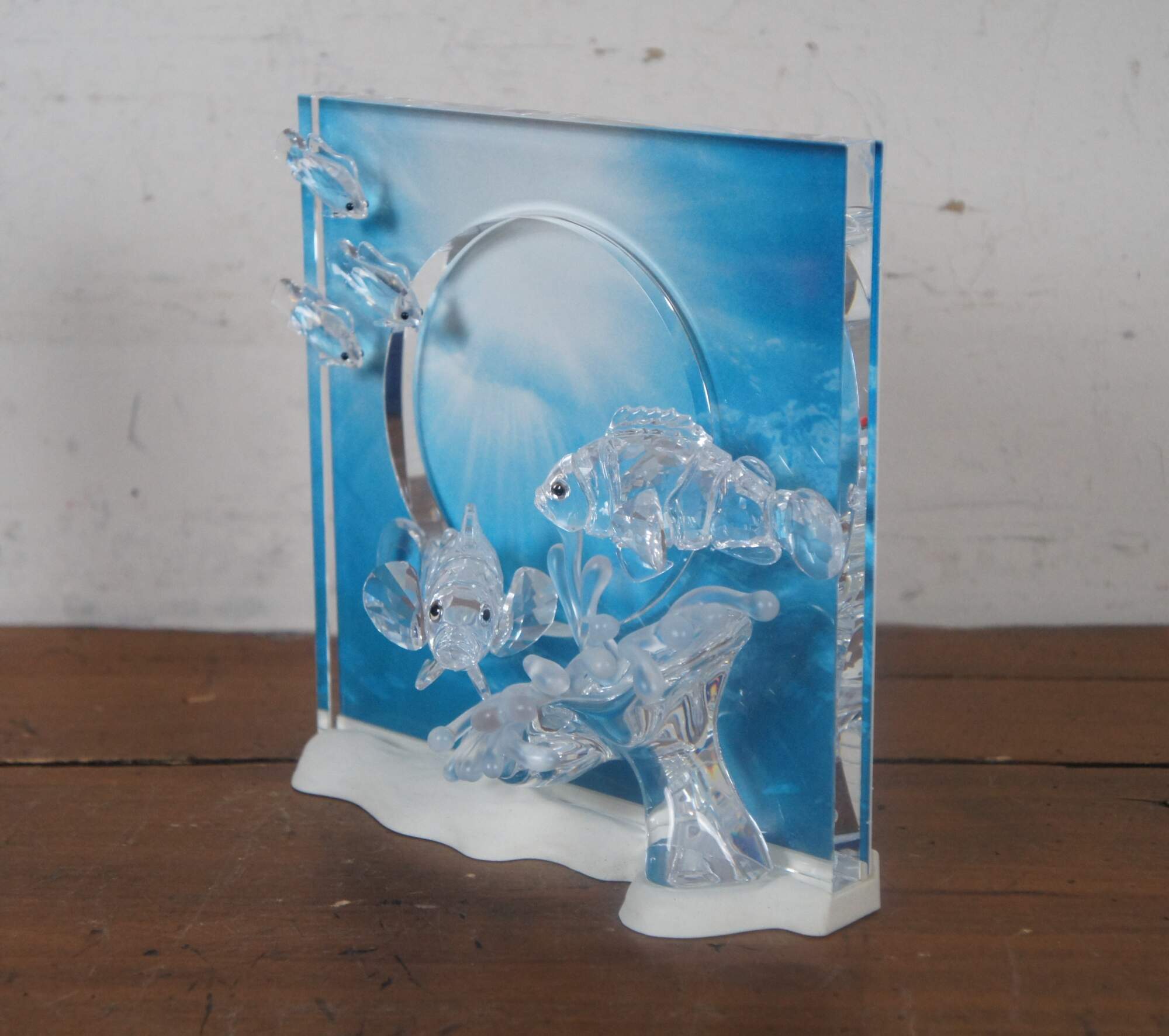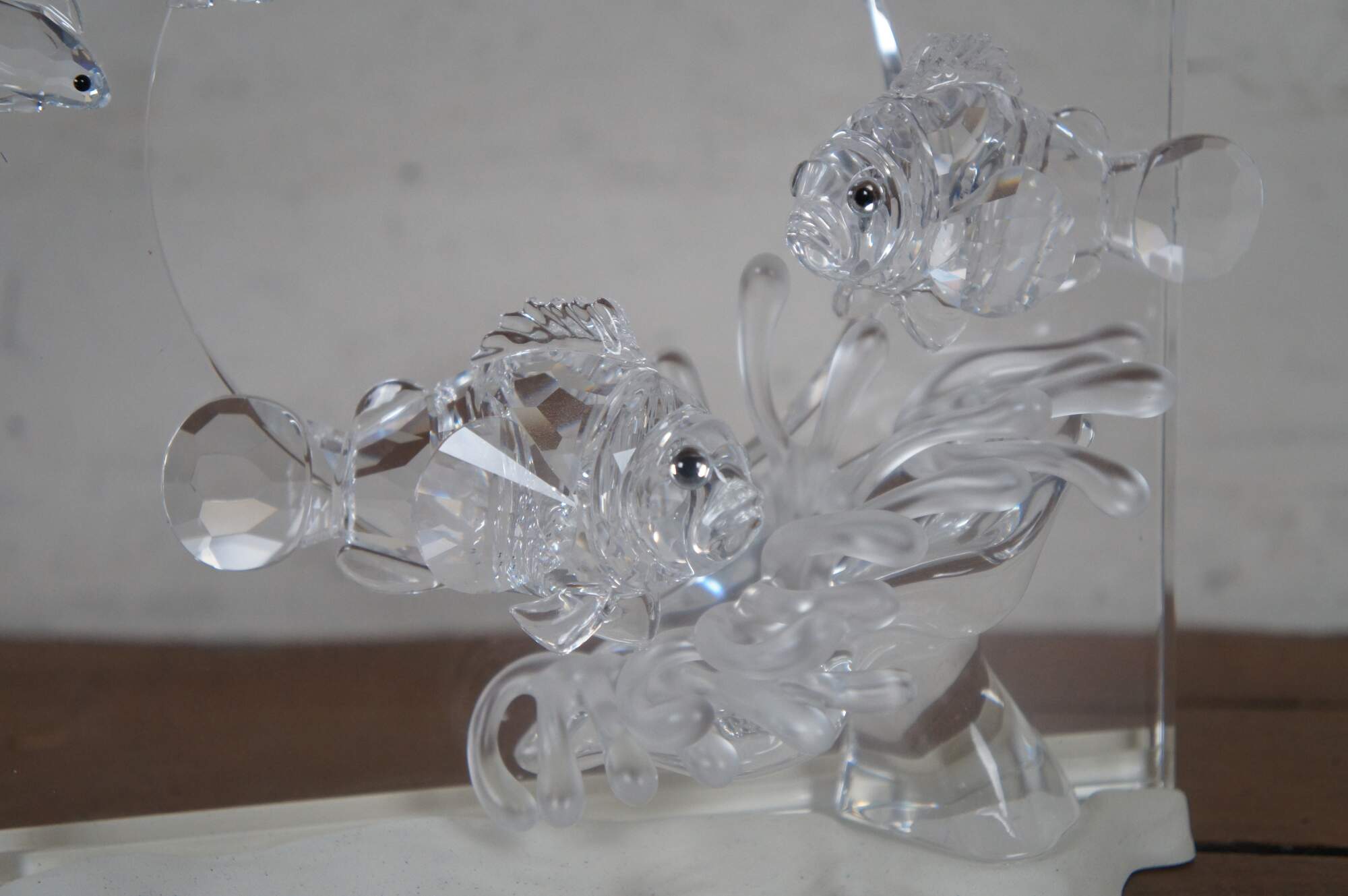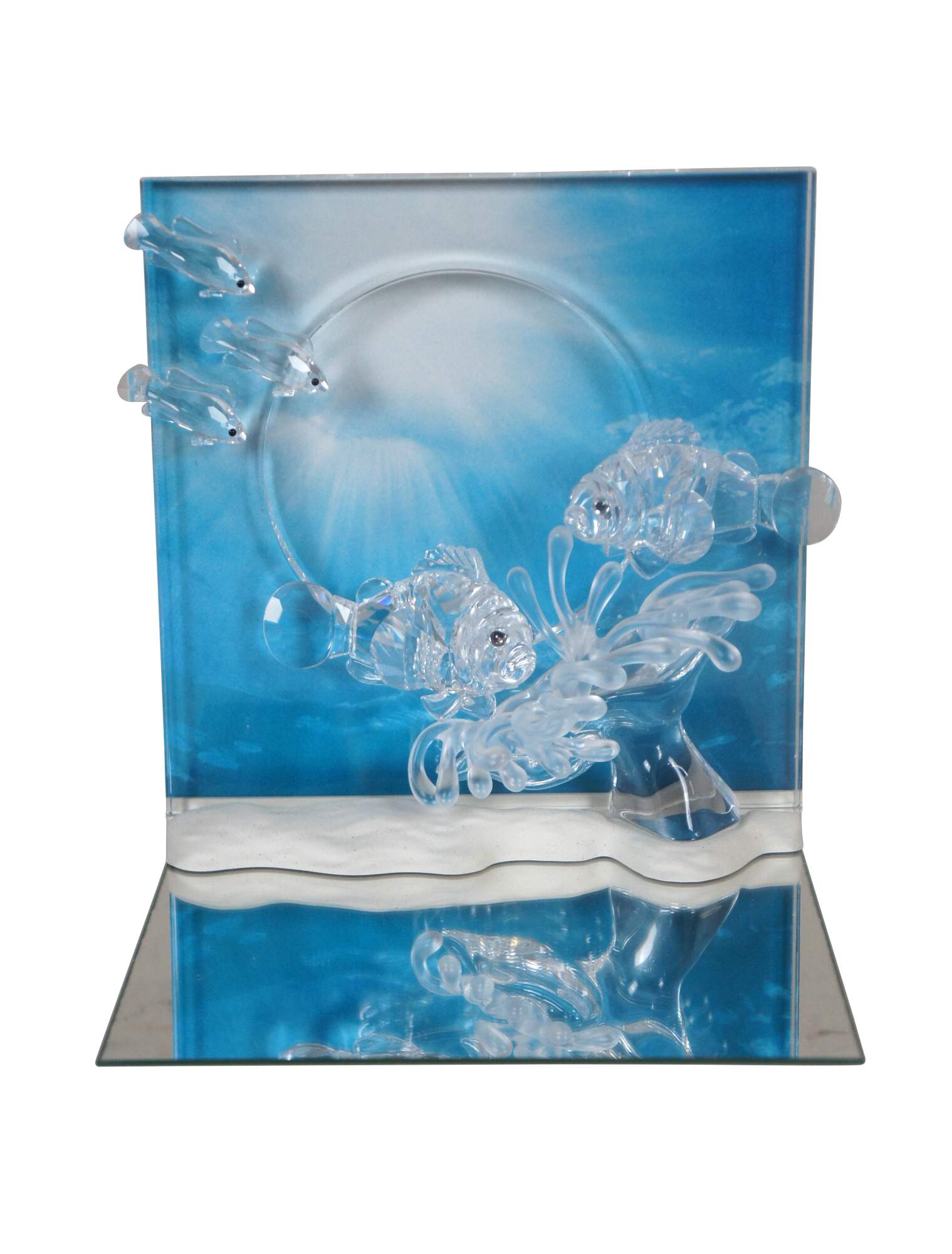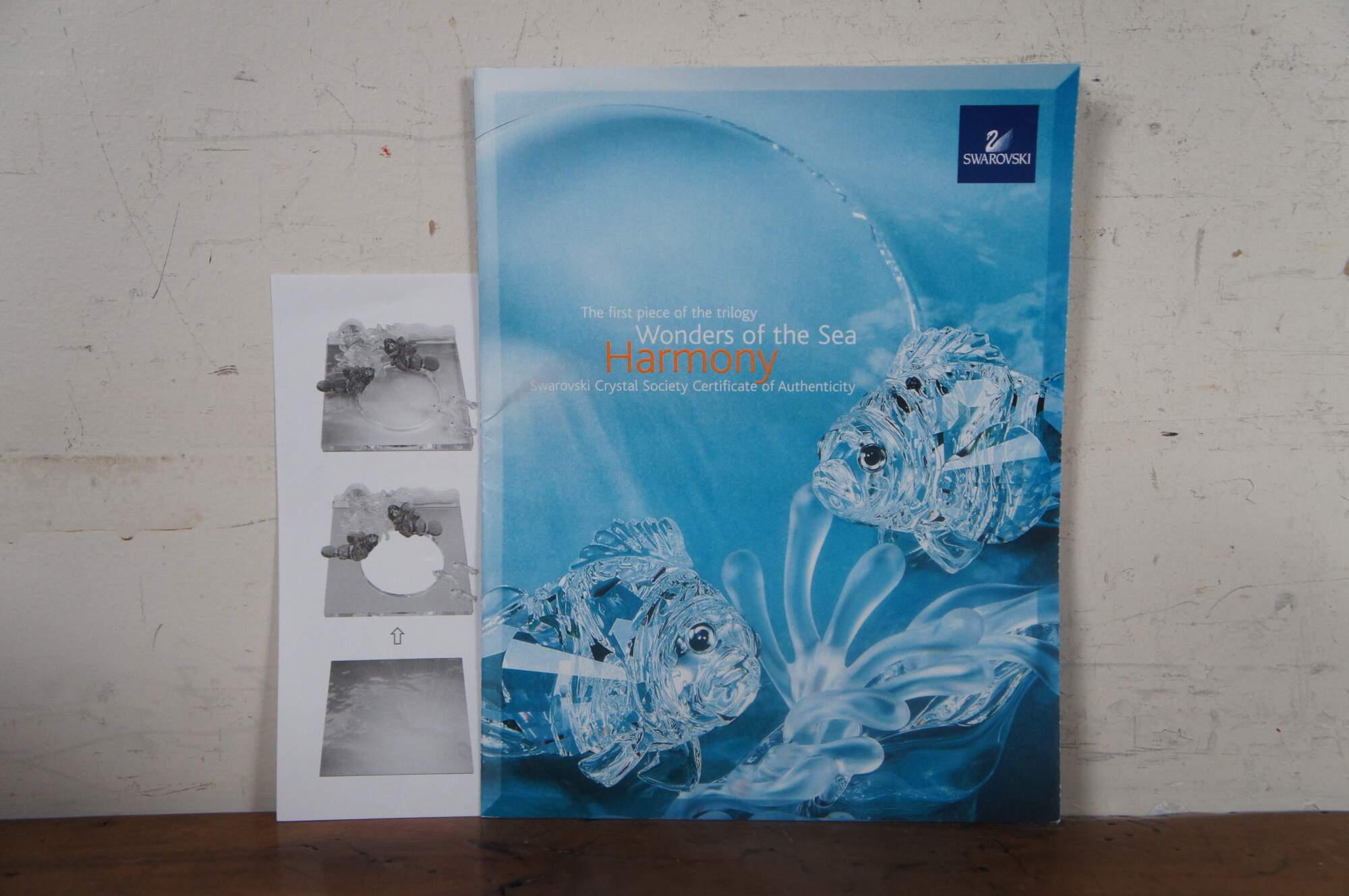 Swarovski Collectors Society 2005, the first piece of the triology Wonders of the Sea, Harmony. Clear crystal figurine depicting clown fish and coral on a circle pierced crystal block, and including sand shaped base / stand, mirror, and ocean backdrop for multiple display possibilities. Includes Certificate of Authenticity and original packaging. Made in Austria.