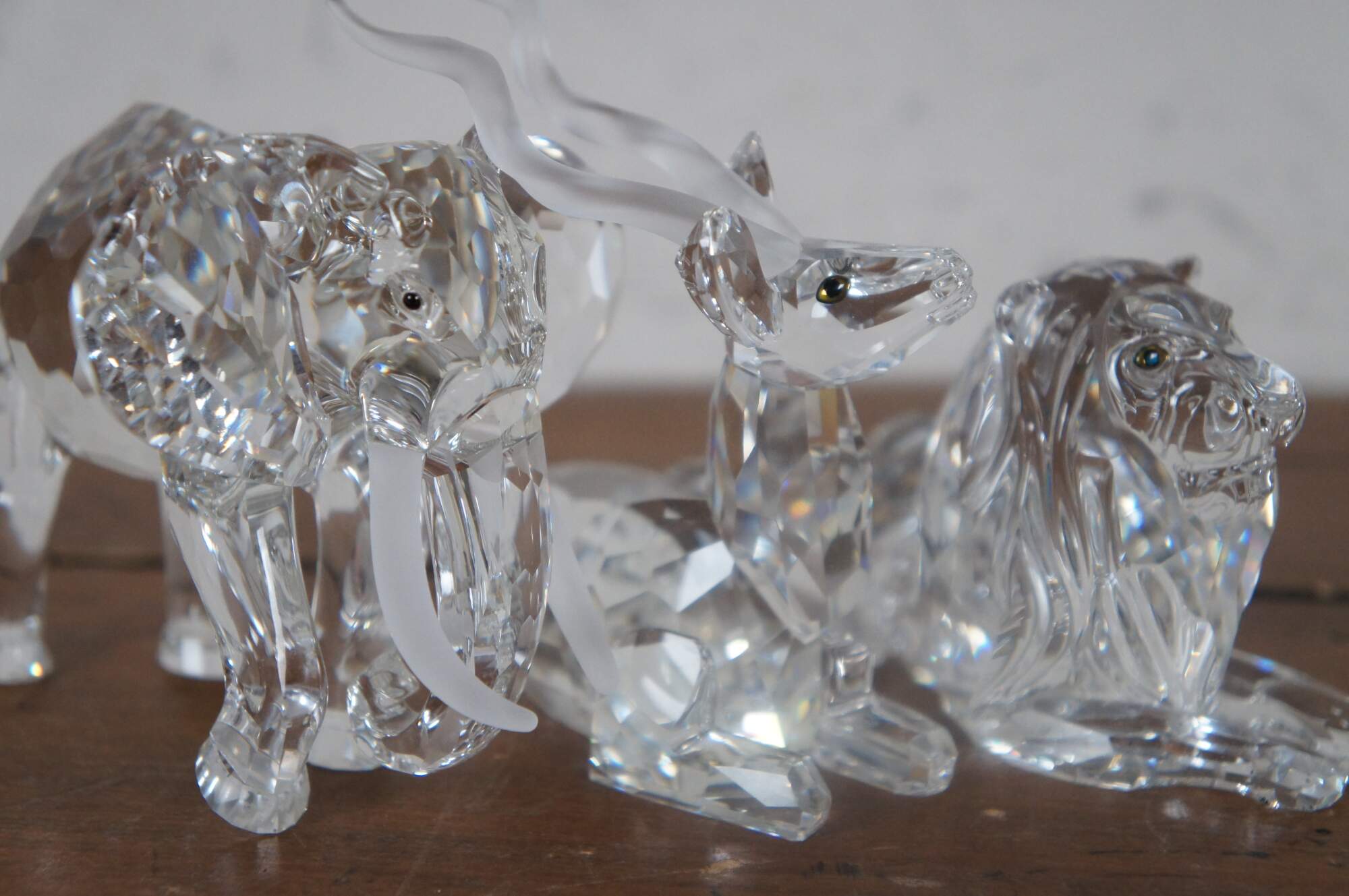 Swarovski Collectors Society Annual Edition Inspiration Africa taxidermy series trilogy including 1993 - The Elephant, 1994 - The Kudu, and 1995 - The Lion. Clear crystal figurines with frosted accents and dark amber eyes. Includes Certificates of Authenticity and original packaging.