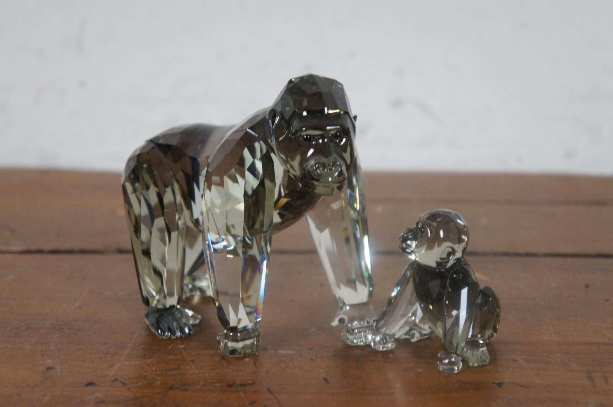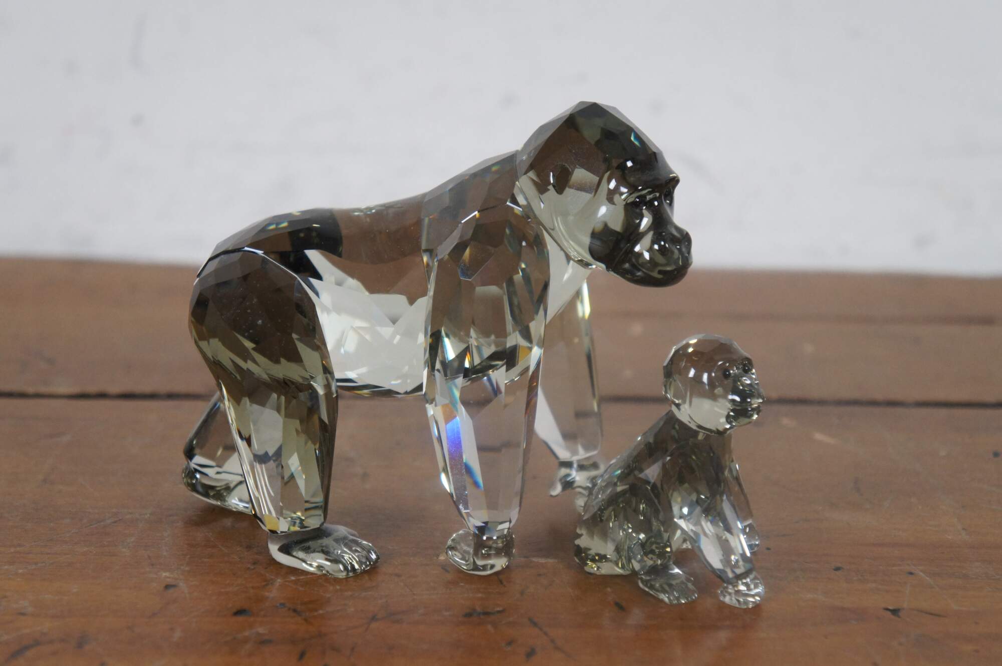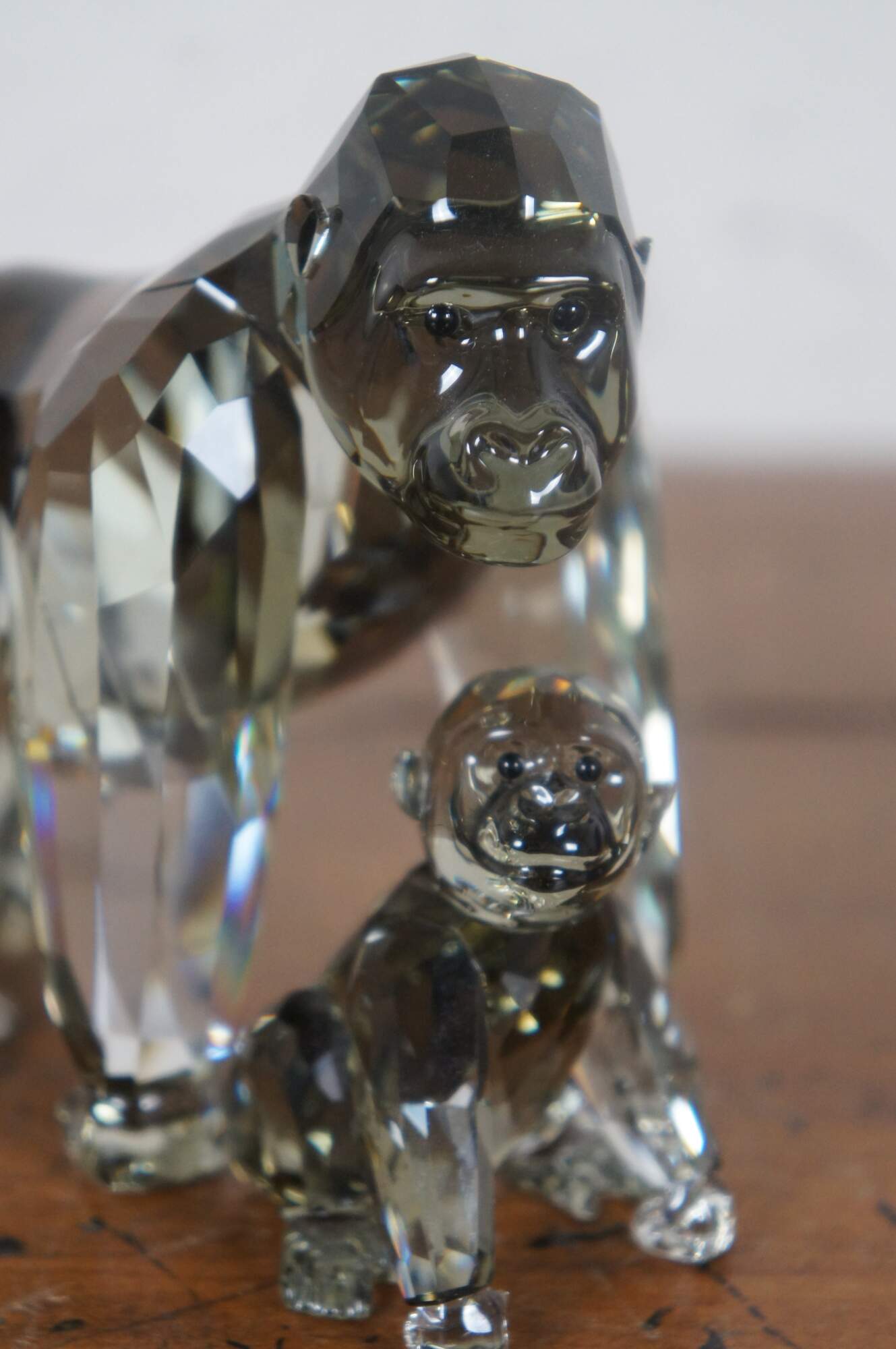 Swarovski Collectors Society 2009 Annual Edition Endangered Wildlife series, Gorillas. Gray crystal figurine pair in the shape of an adult / mother gorilla and a baby. Includes Certificate of Authenticity and original packaging. Made in Austria.
