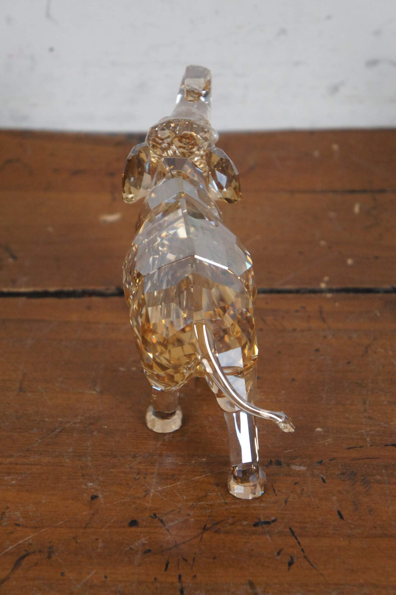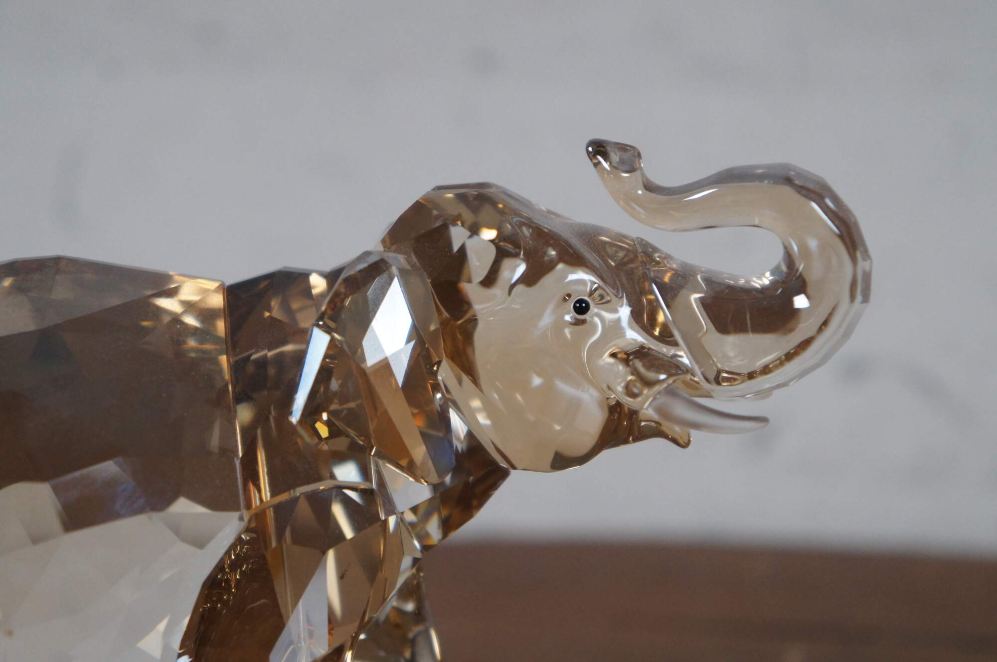 Swaroxski Collectors Society 2013 Annual Edition, Cinta Elephant. Light brown crystal figurine in the shape of an Indian elephant with frosted tusks and black eyes. Includes leafy shrub shaped plaque with signature of designer Elisabeth Adamer. Includes original packaging. Made in Liechtenstein.