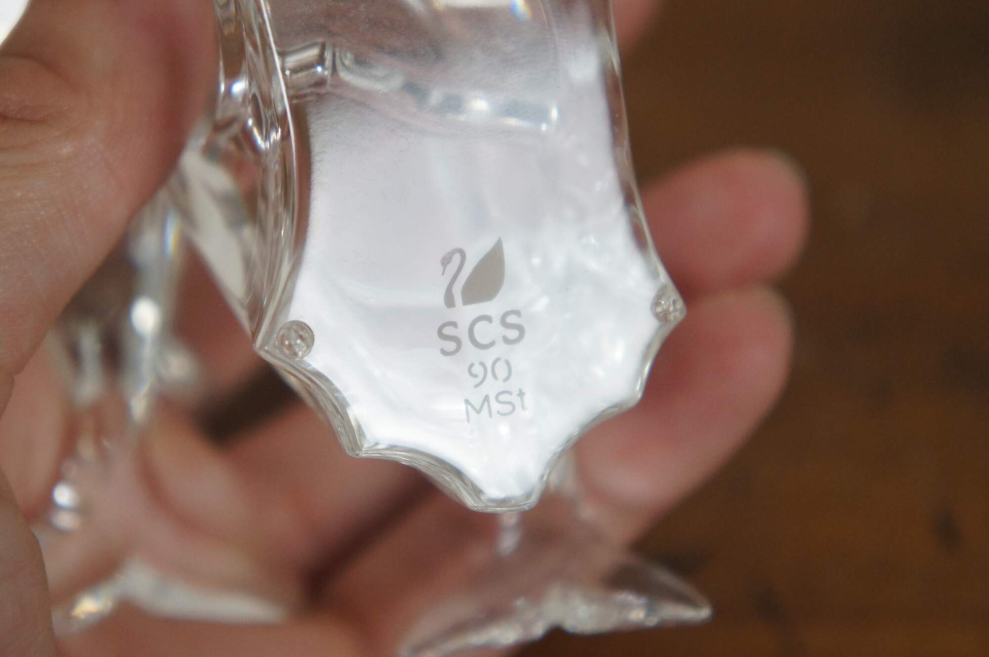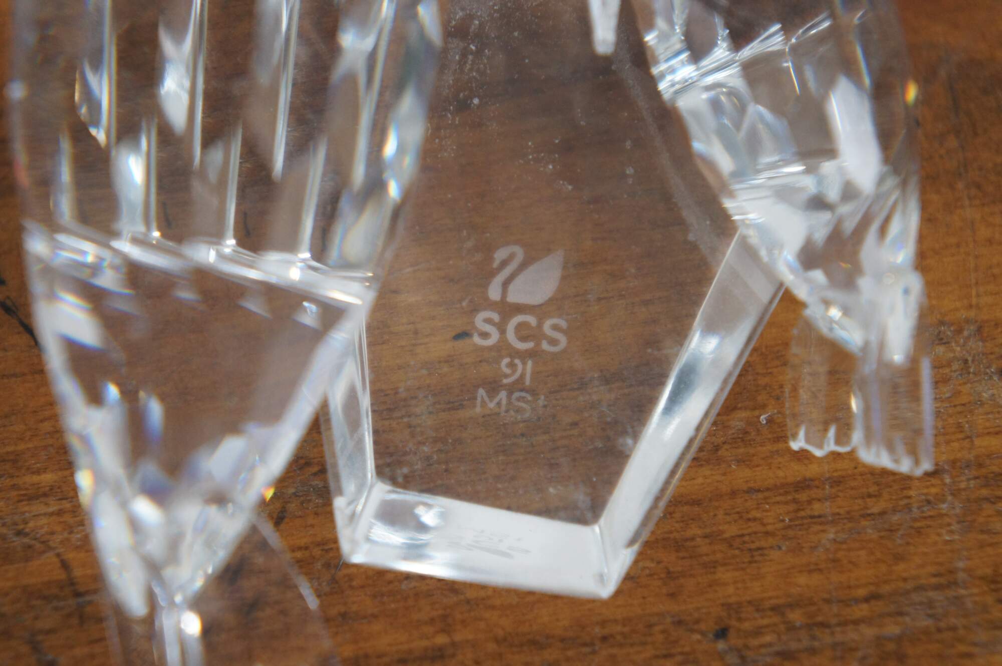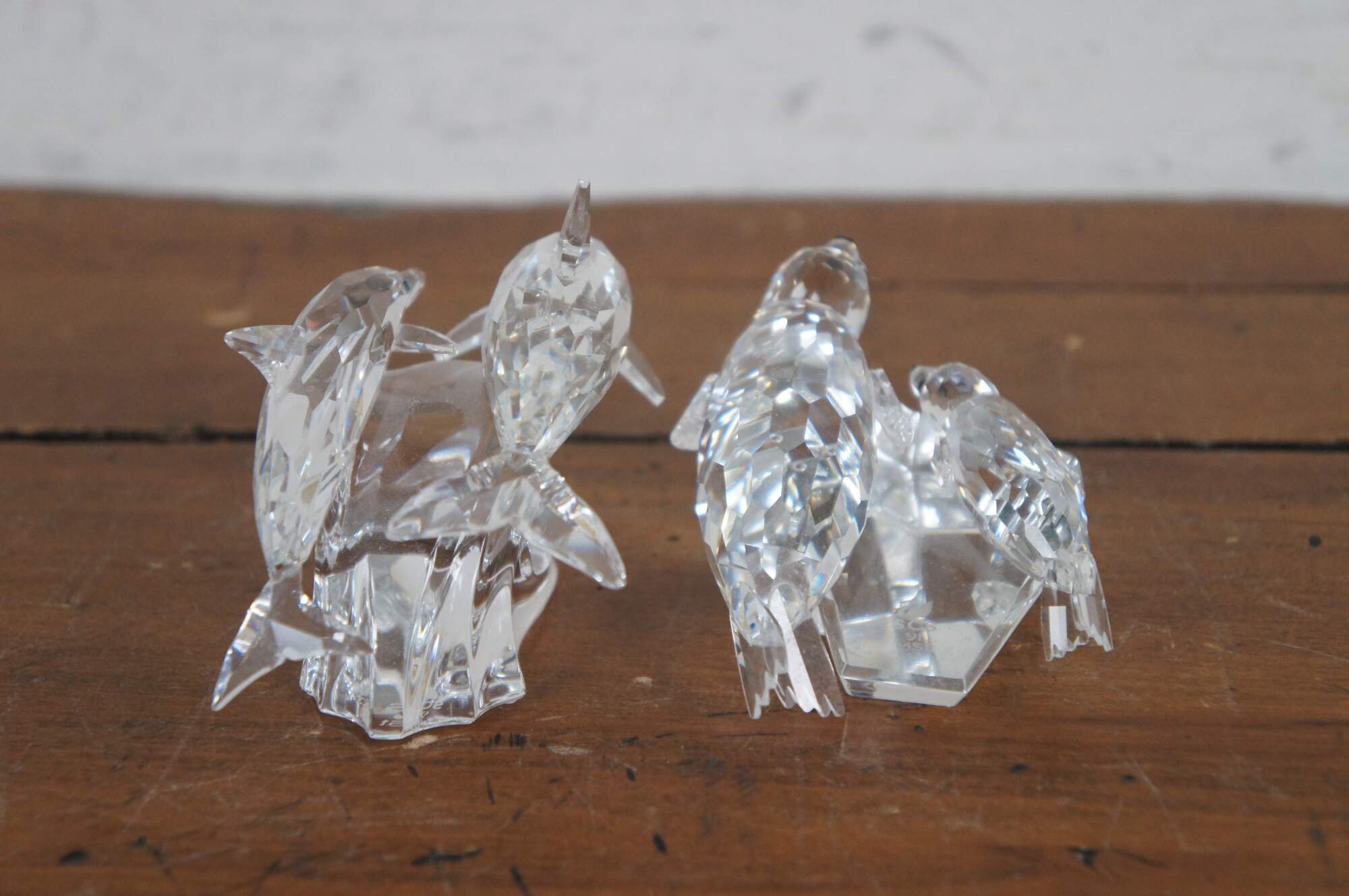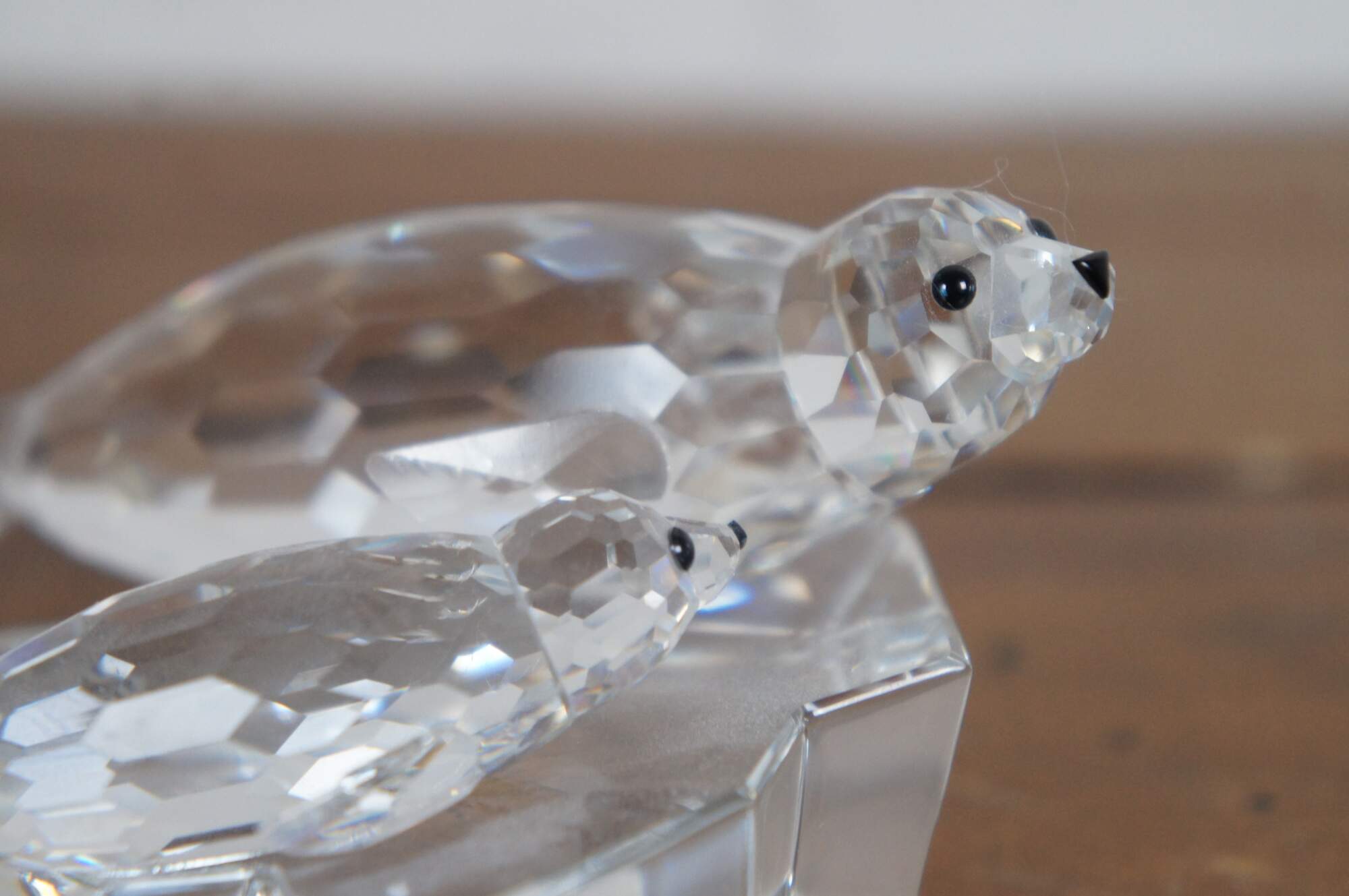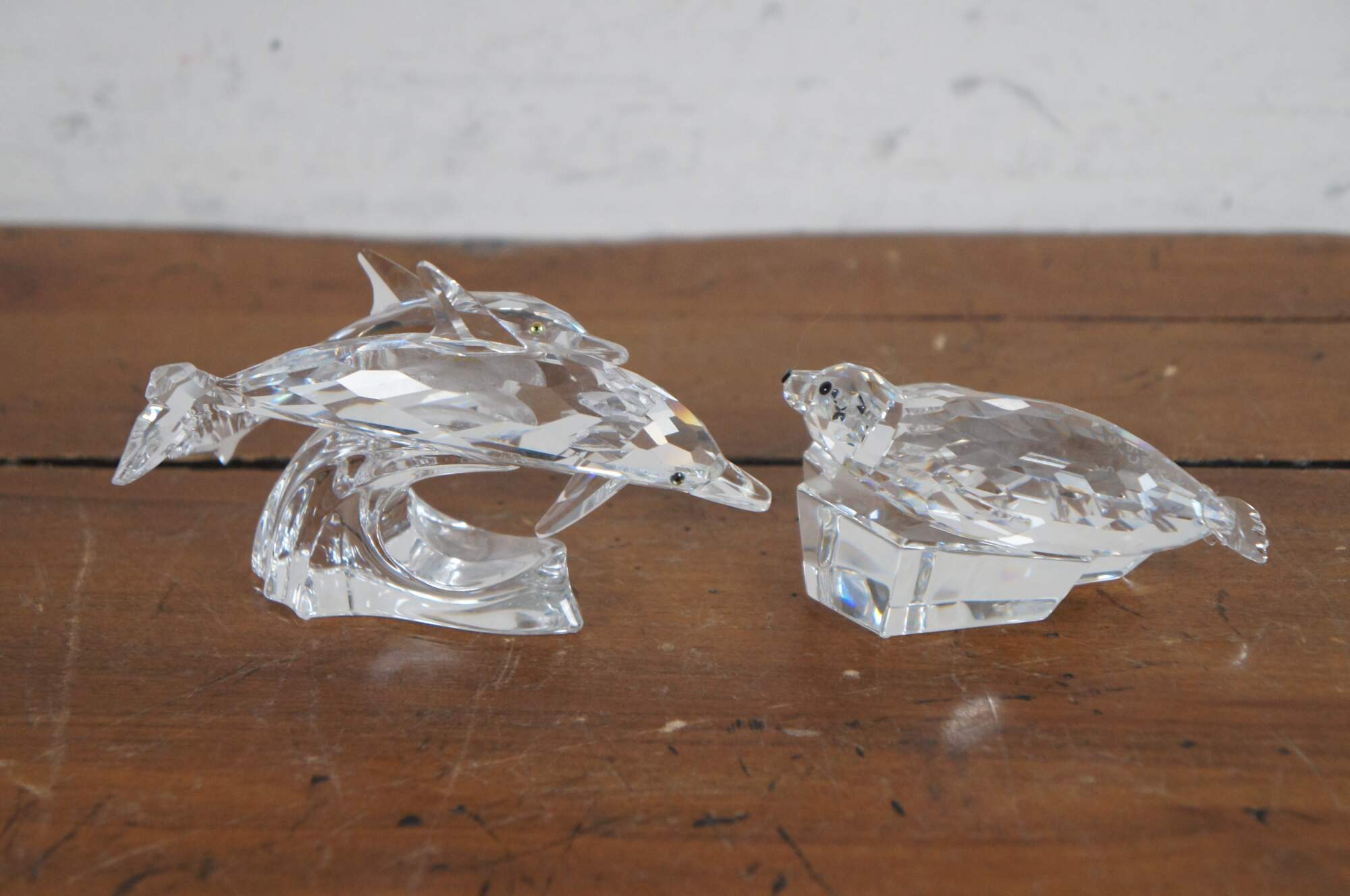 Swarovski Collectors Society Annual Edition 1990 - Lead Me - The Dolphins and 1991 - Save Me - Seals. Pair of clear crystal figurines with black eyes, depicting an adult / mother and baby dolphin on a wave and an adult / mother and baby seal / sea lion on an ice berg. Includes Certificate of Authenticity for the Dolphins.