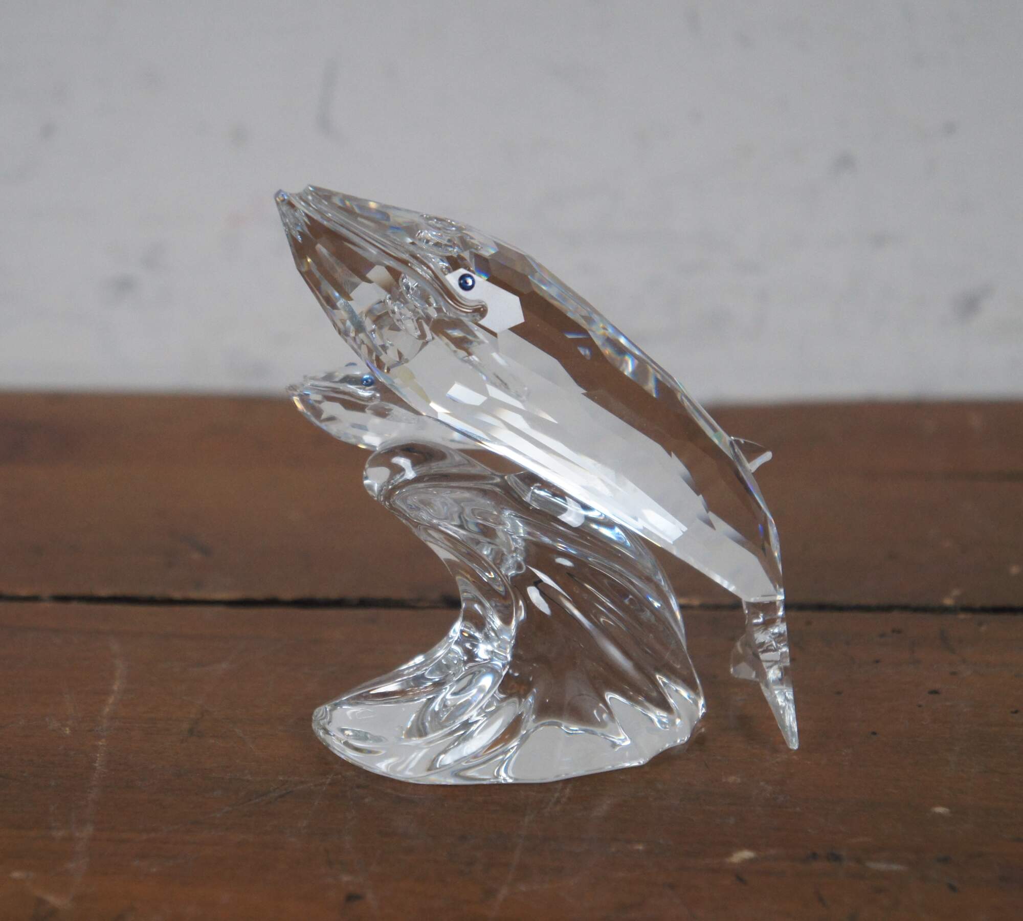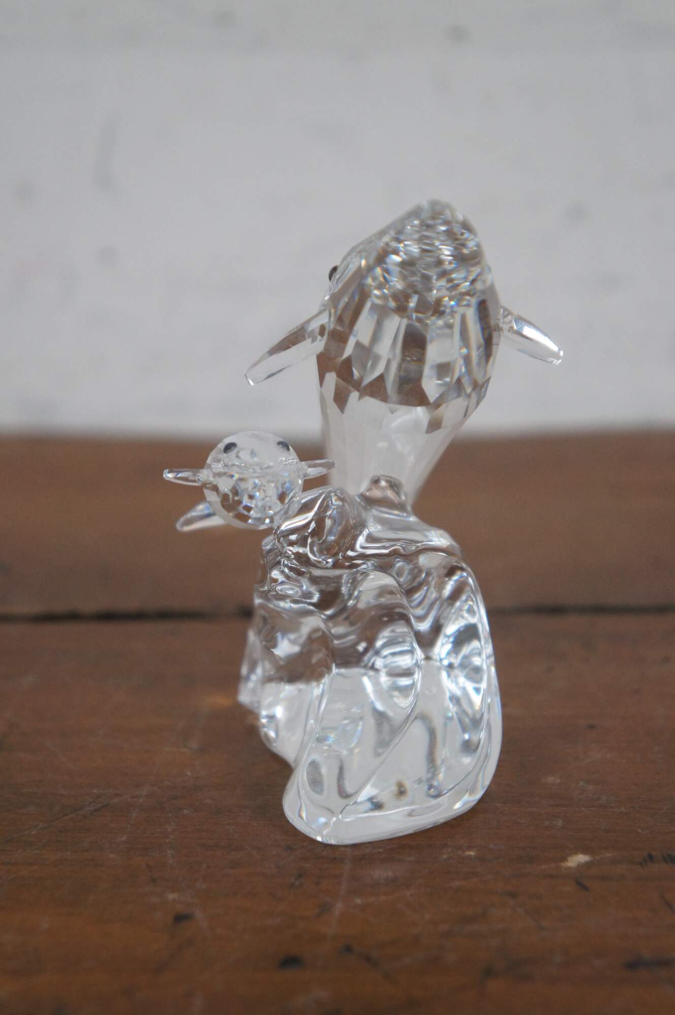 Swarovski Collectors Society 1992 Annual Edition, Care for Me - The Whales. Clear crystal figurine depicting an adult / mother and baby blue whale with blue eyes, perched on a wave. Includes original packaging. Made in Austria.