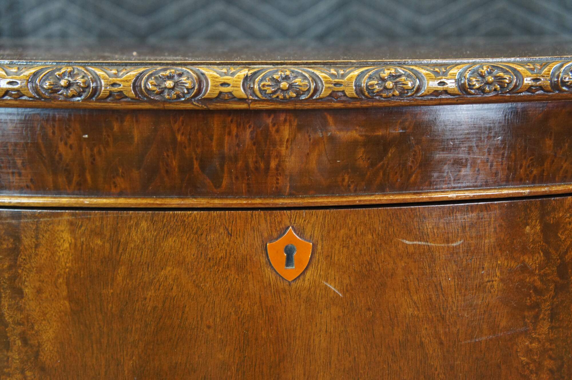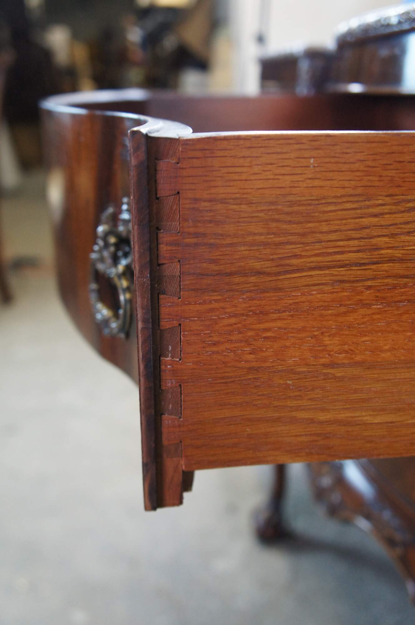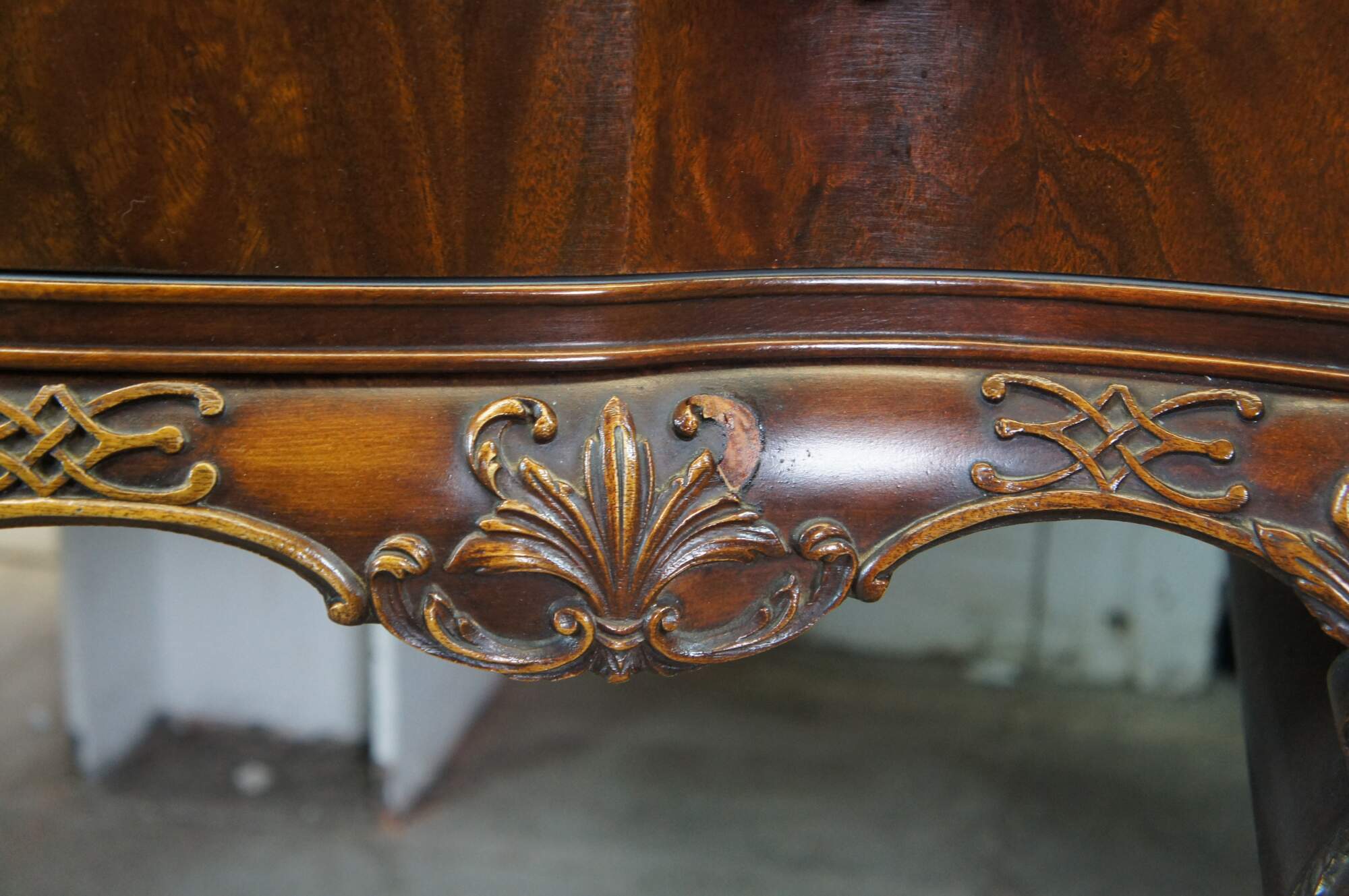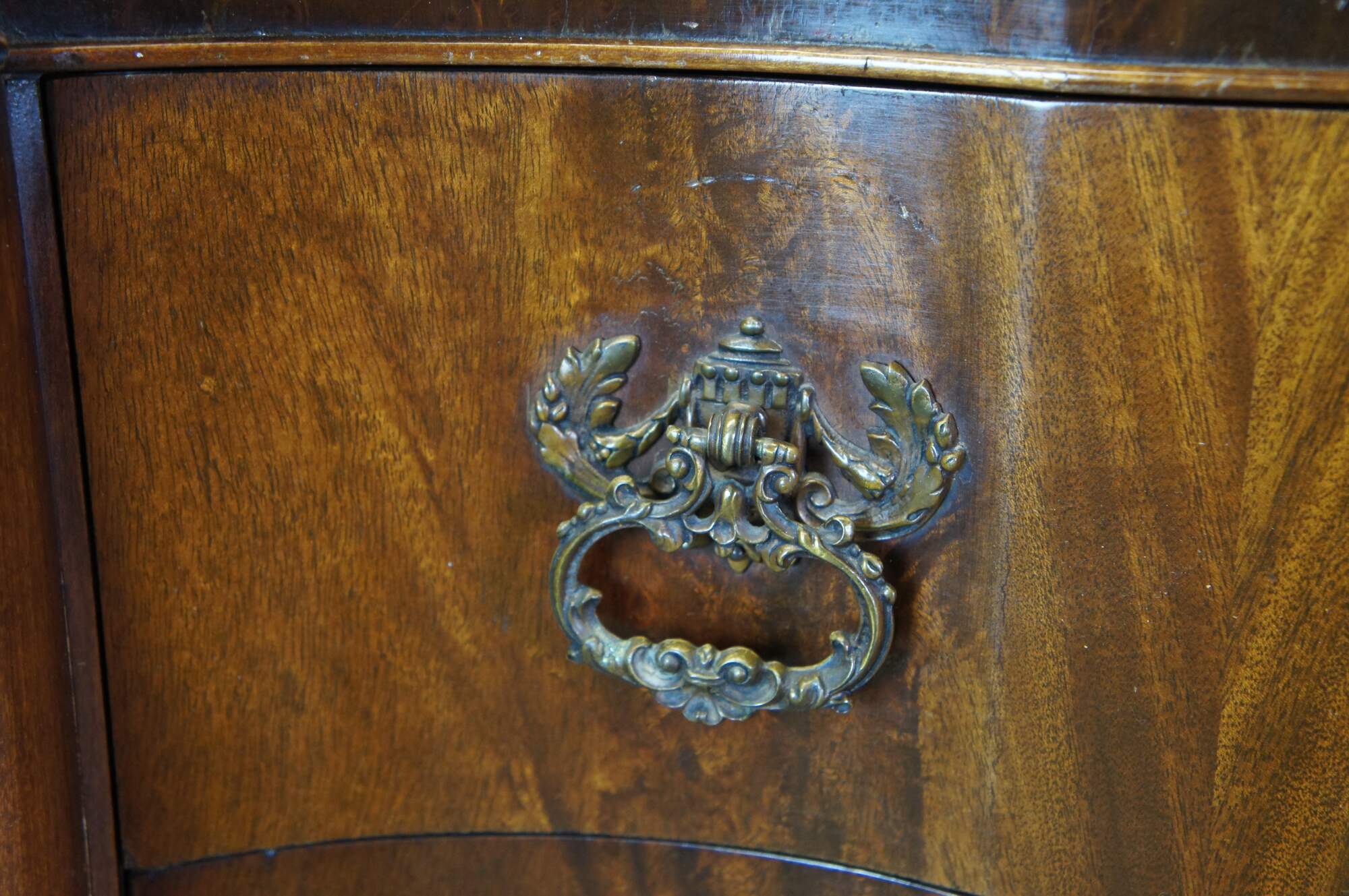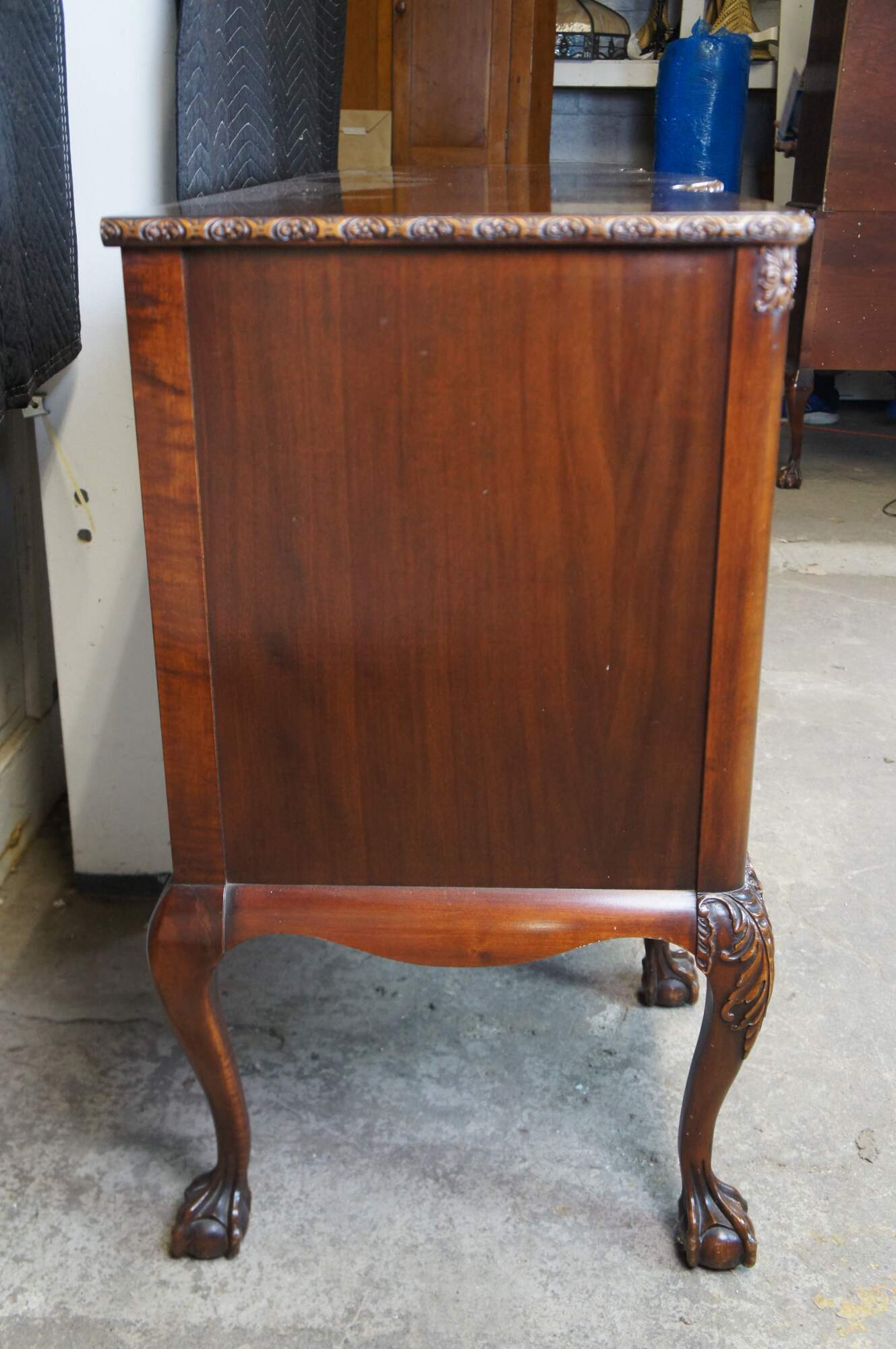 An early 20th Century English Chippendale / Georgian style sideboard by Romweber Industries. Circa 1920s. Made from mahogany with a serpentine bowfront featuring a beautifully carved edge over crotch mahogany cabinet / drawer surfaces. The buffet features two large central dovetailed drawers flanked by outer cabinets with shelves. Lower aprons are "C" scrolled, acanthus carved and scalloped. Drawers and cabinets open via ornate brass pulls. The case is supported by six cabriole legs carved at the knees with long acanthus leaves leading to distinguished ball and claw feet. Uppermost drawer is divided along the right side for silverware storage. Great for use as a buffet, sideboard, console table or credenza.