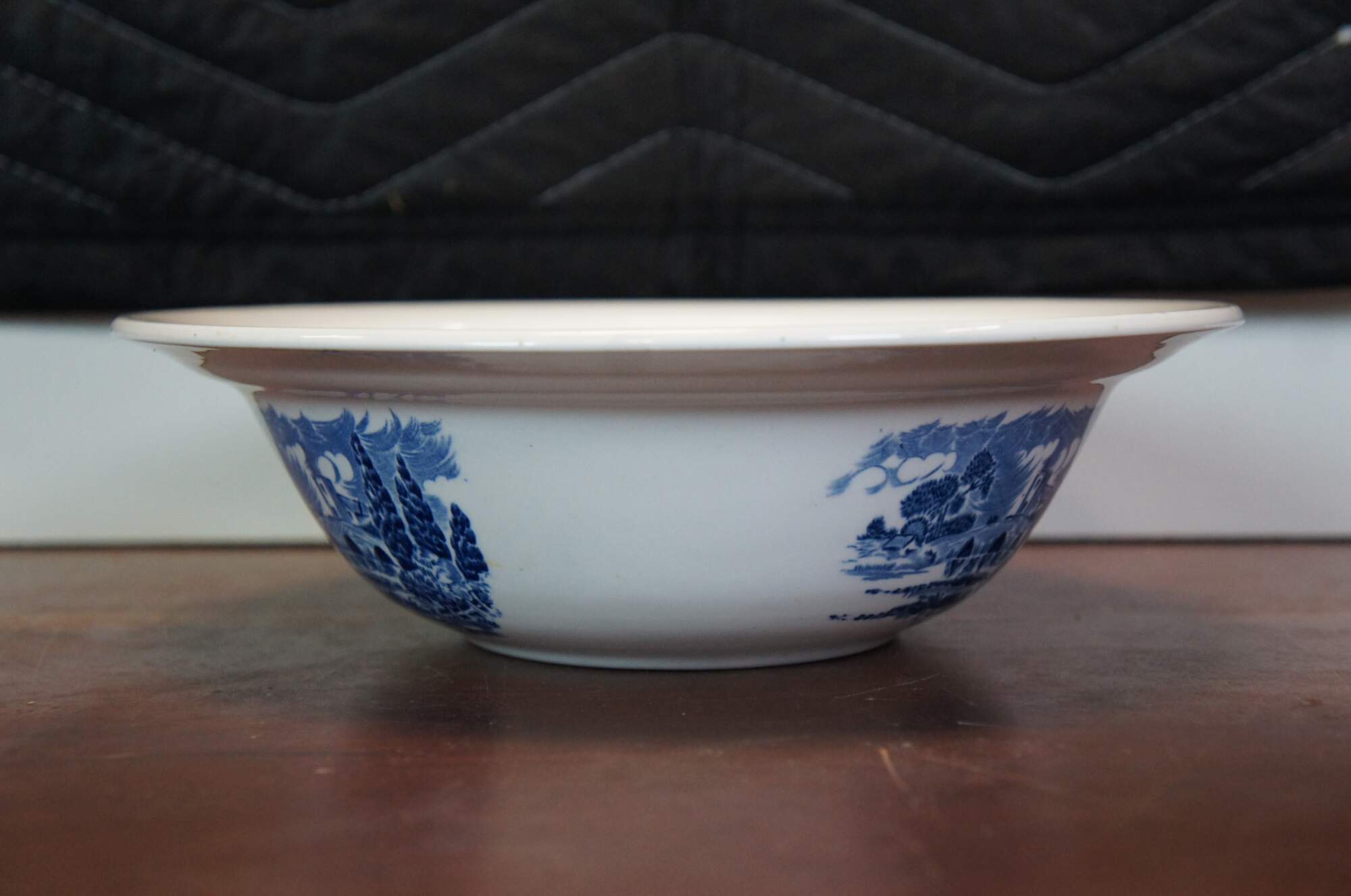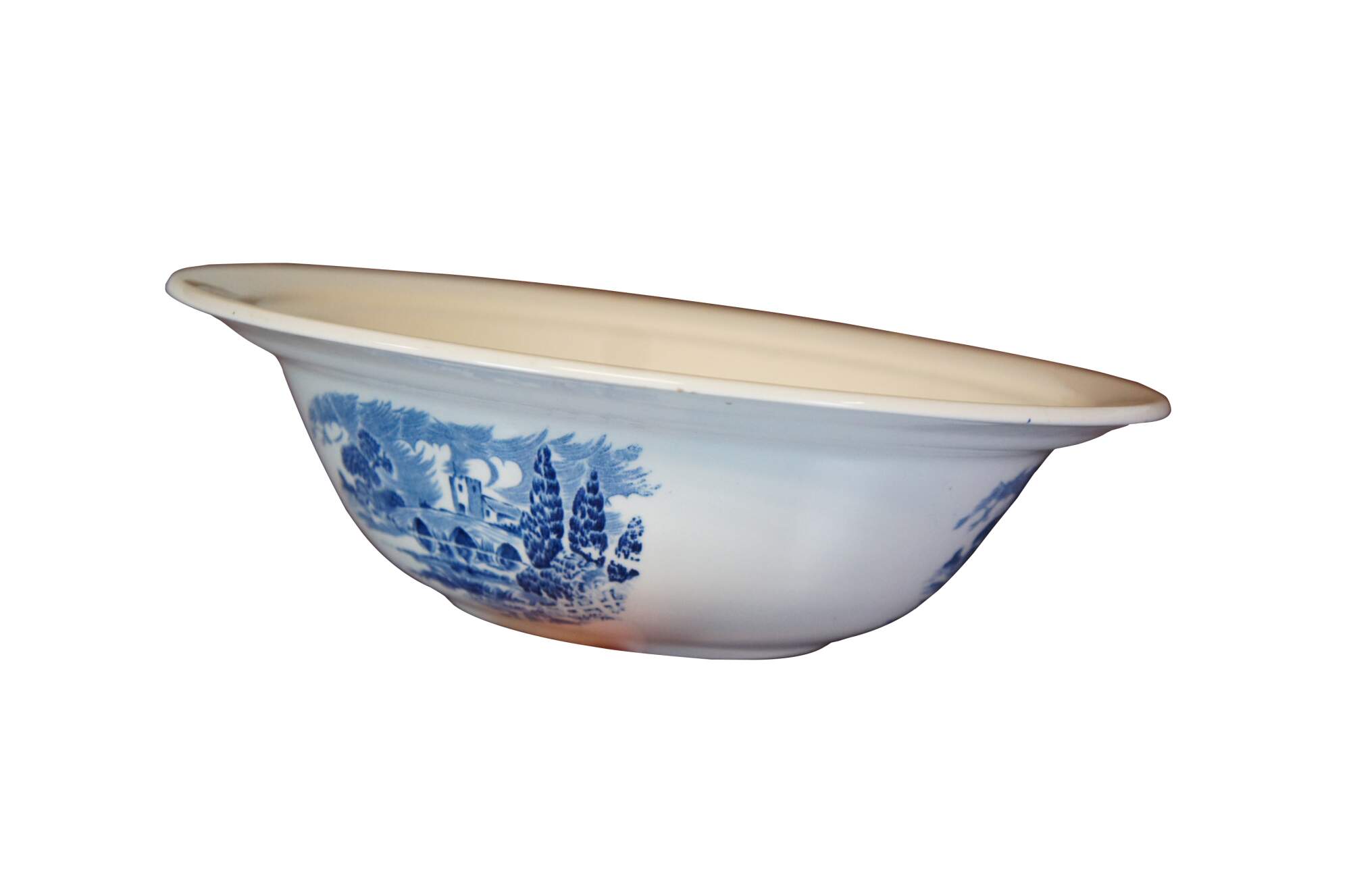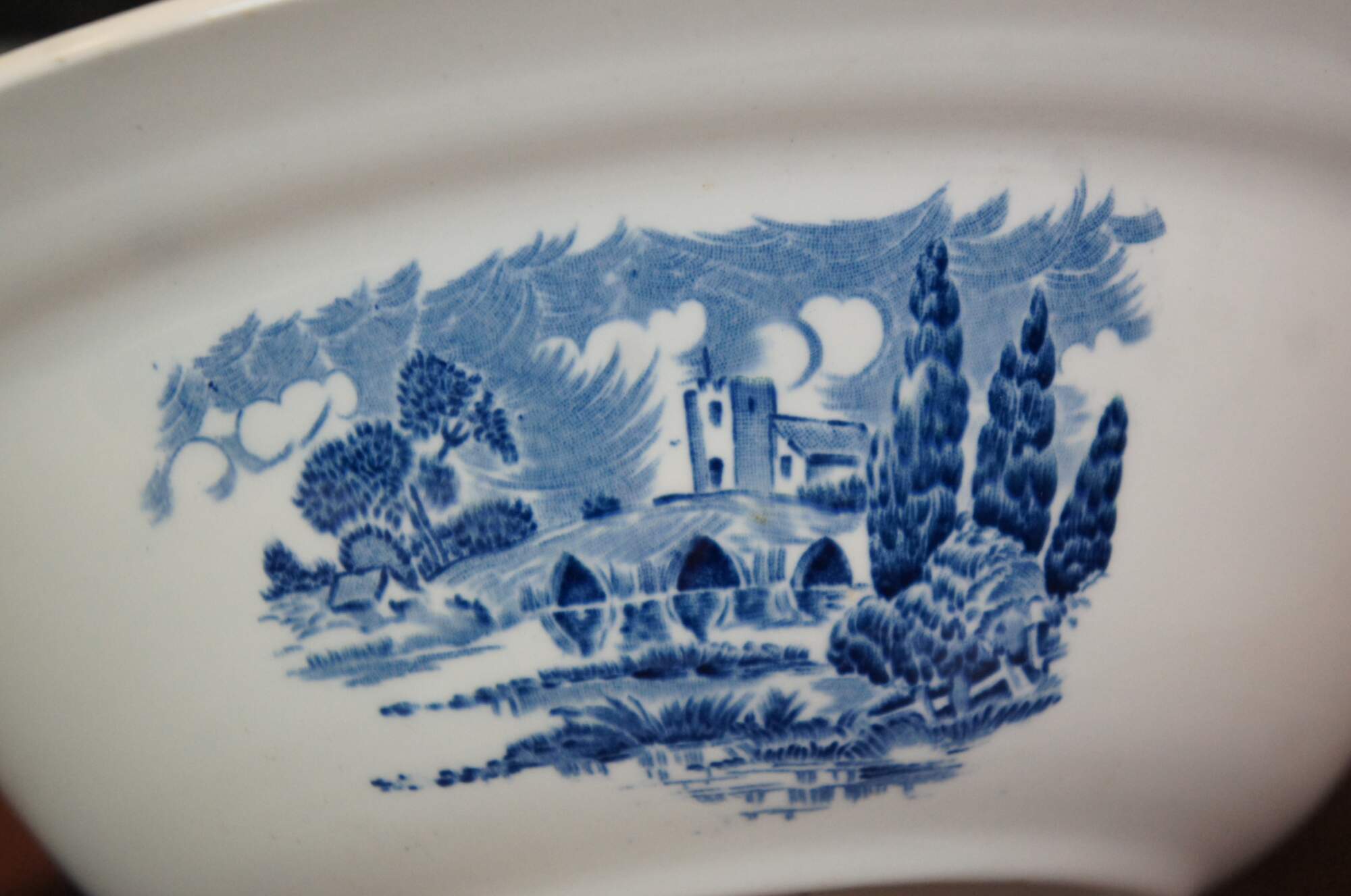 Mid to late 20th century porcelain sering bowl by Enoch Wedgwood (Tunstall) Ltd in the Countryside pattern, featuring a thrice repeated landscape of a small manor house over a culvert framed with cypress trees. Unicorn stamp.