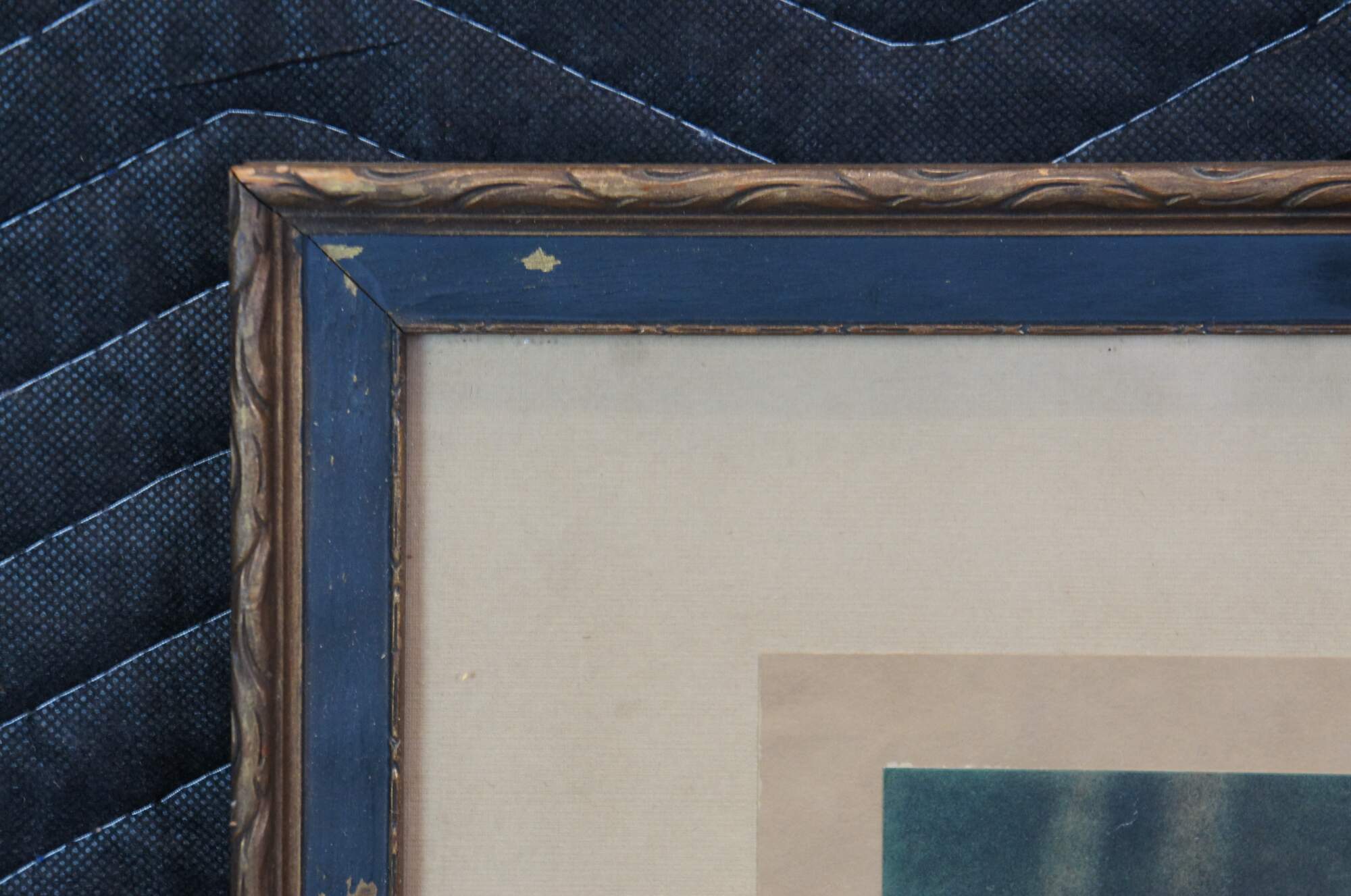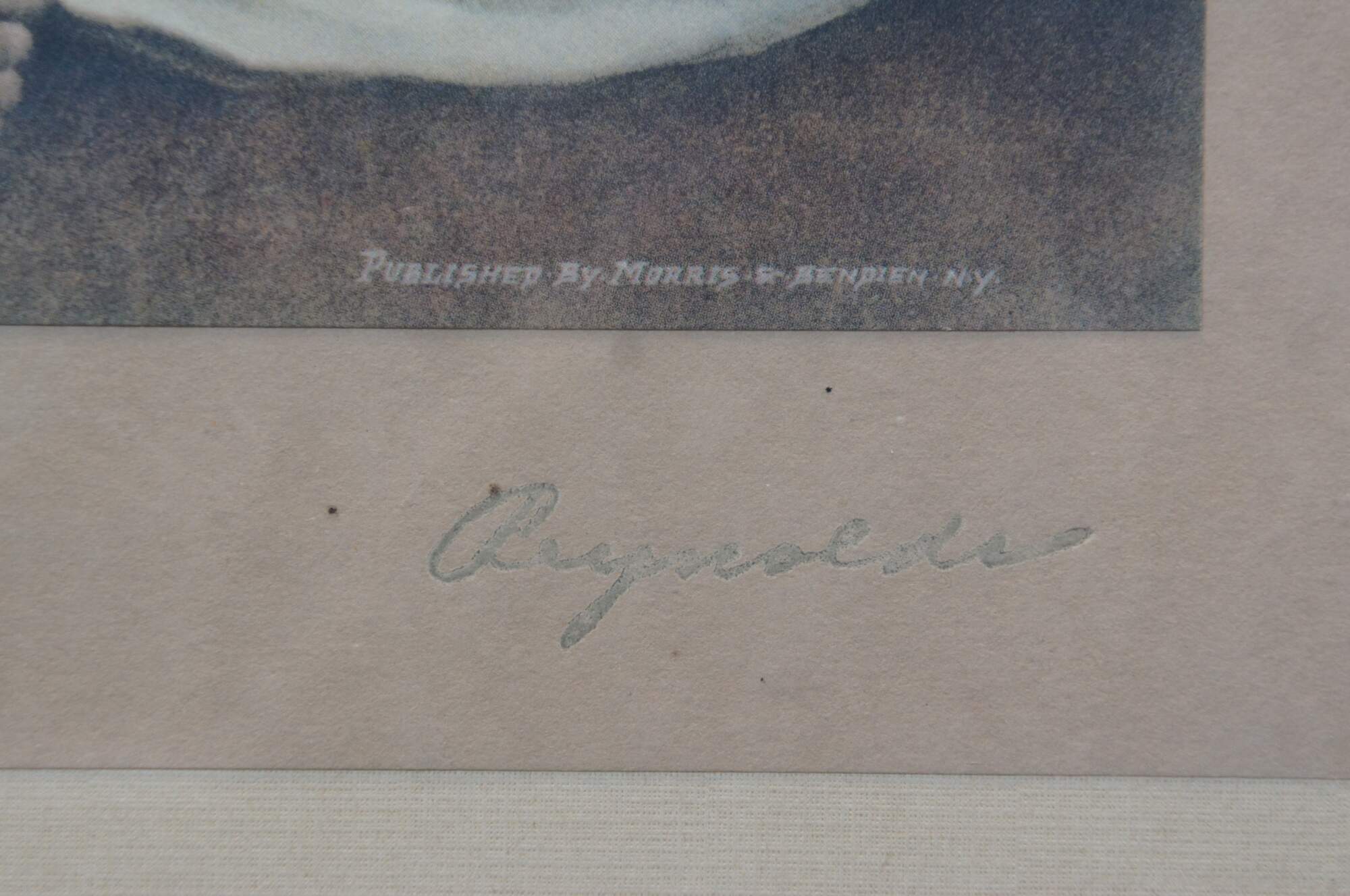Antique early 20th century lithograph print of "Age of Innocence" by Sir Joshua Reynolds. Depicts a young child in white with blue sash and hair bow, seated in a forest landscape. Signed and titled in plate along lower edge. Published by Morris & Bendien, NY. Carved lightly gilt wood frame with blue painted bevel; white mat.