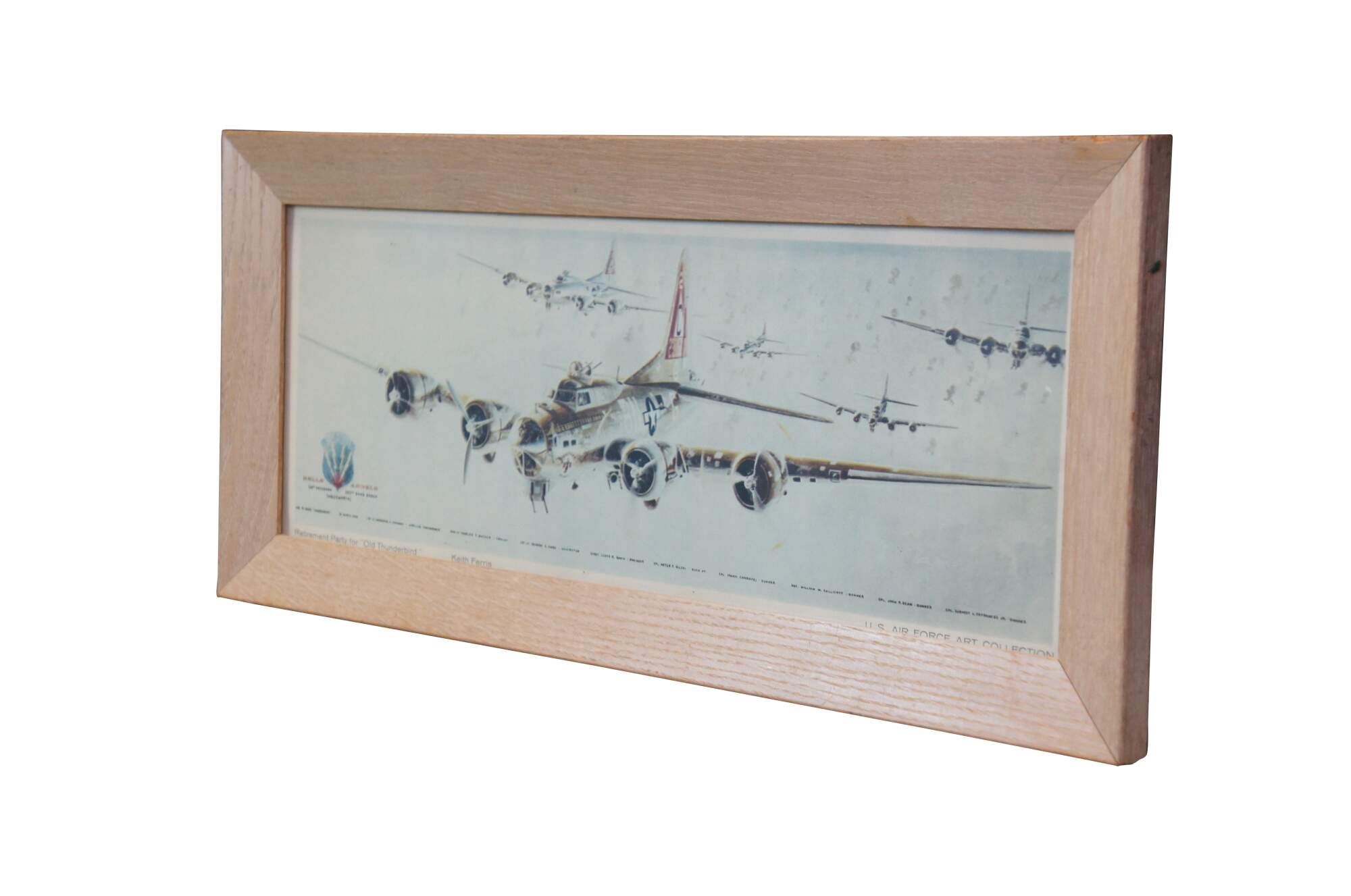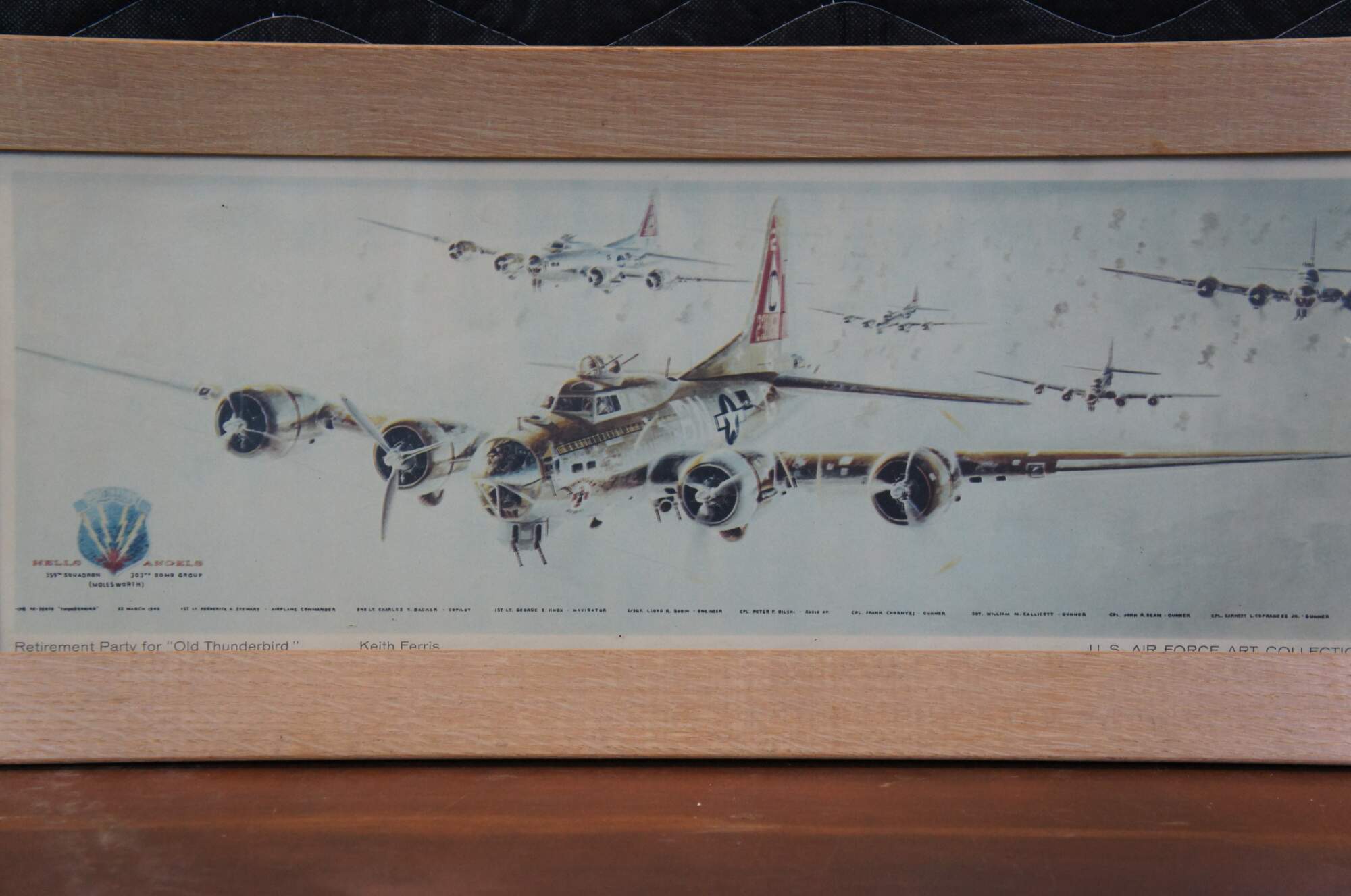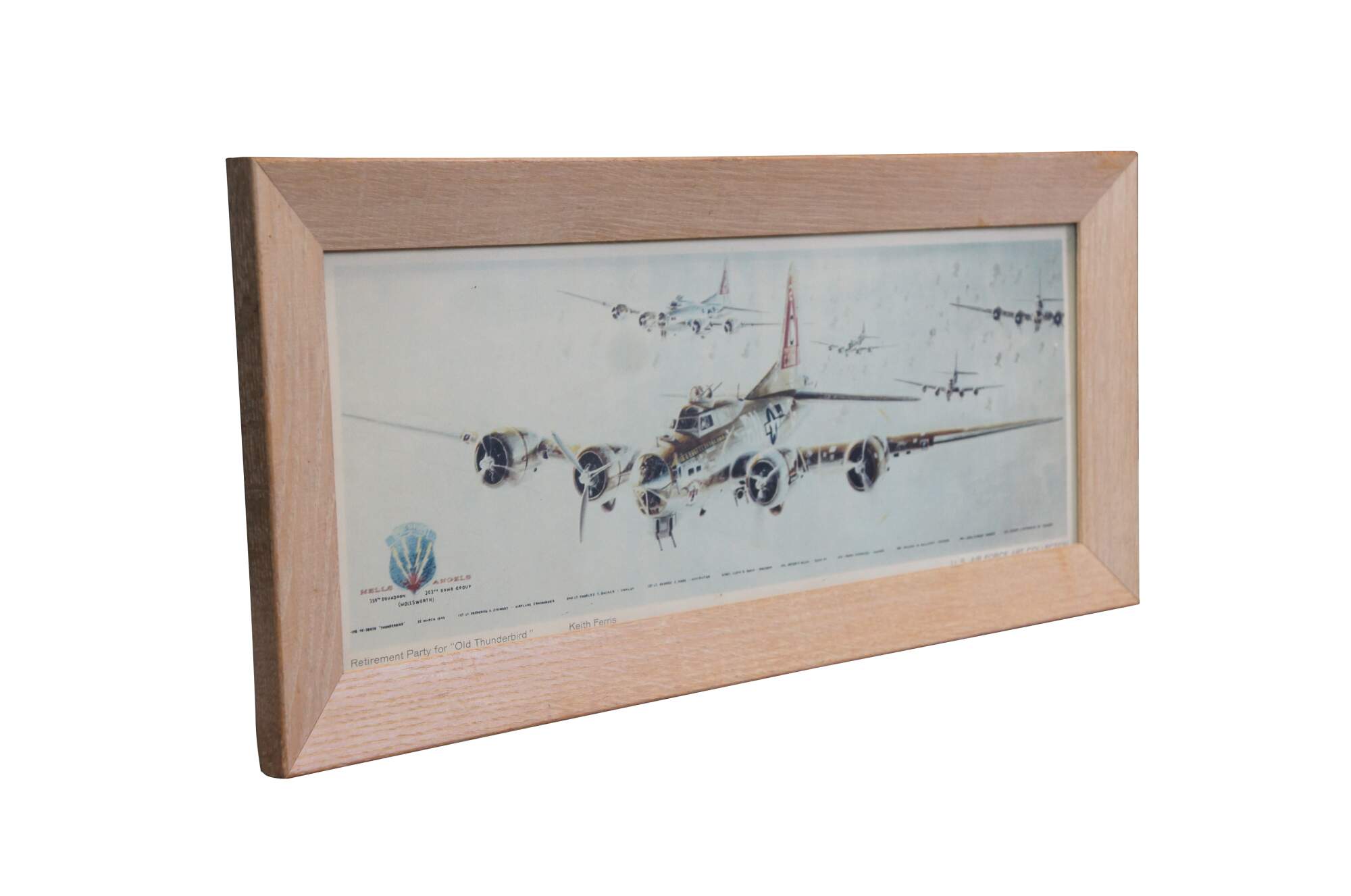 Vintage late 20th century print of "Retirement Party for Old Thunderbird" by Keith Ferris from the U.S. Air Force Art Collection. Based on the mural "Fortresses Under Fire" painted in 1975 at the Smithsonian Air & Space Museum, Washington, DC and depicts the 70th mission of Thunderbird on August 15, 1944 to Wiesbaden, Germany. This is the B-17 that Lt. Vern Moncur flew from Molesworth during WWII. LT Vern Moncur is the father of Gary Moncur who will speak to the JAC on June 5th. A copy of the painting is in the 303rd Bomb Group (Heavy) Memorial Building (Bldg 100) on RAF Molesworth. (Source: 501st Combat Support Wing) Beveled plain wood frame.