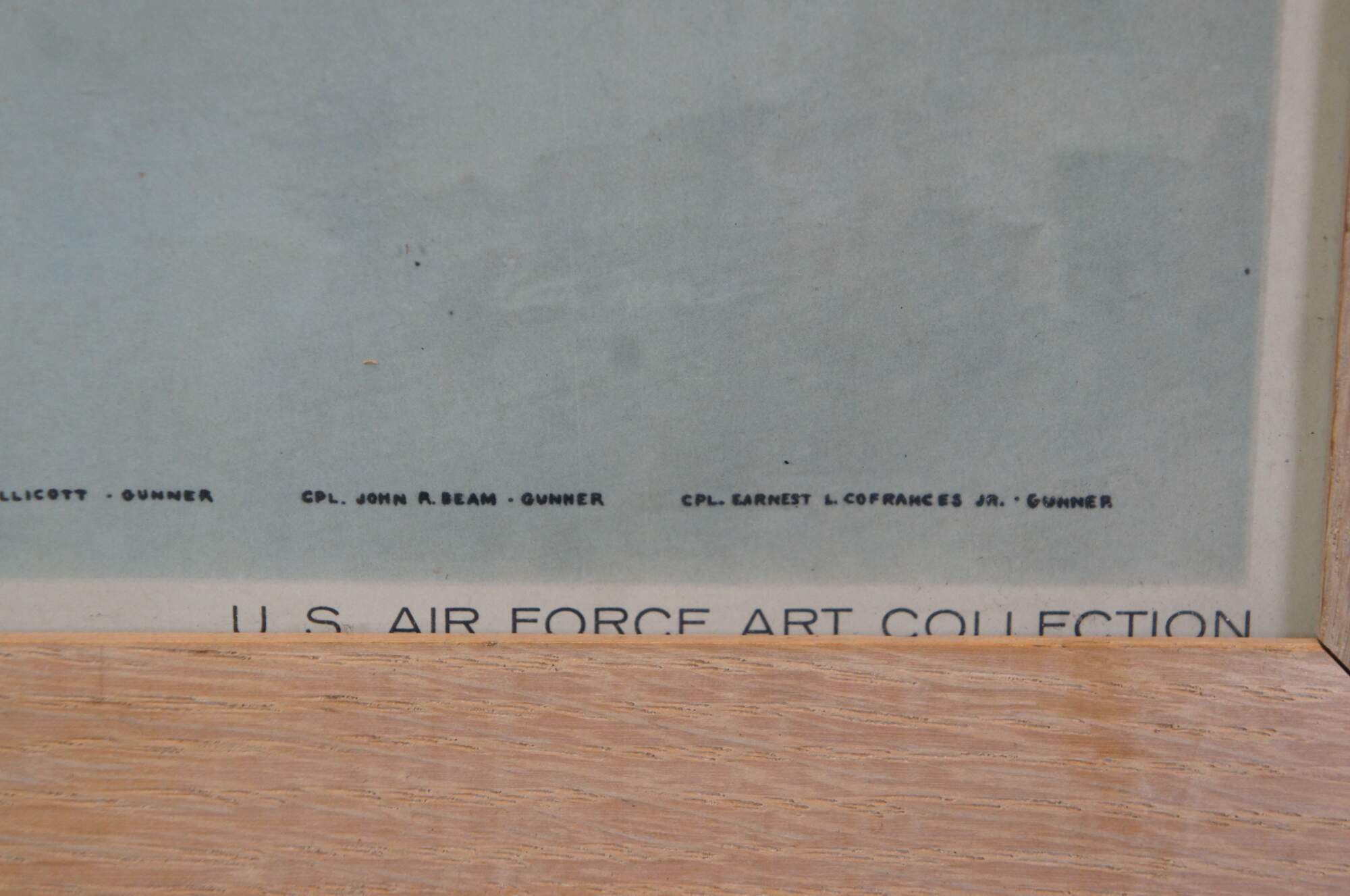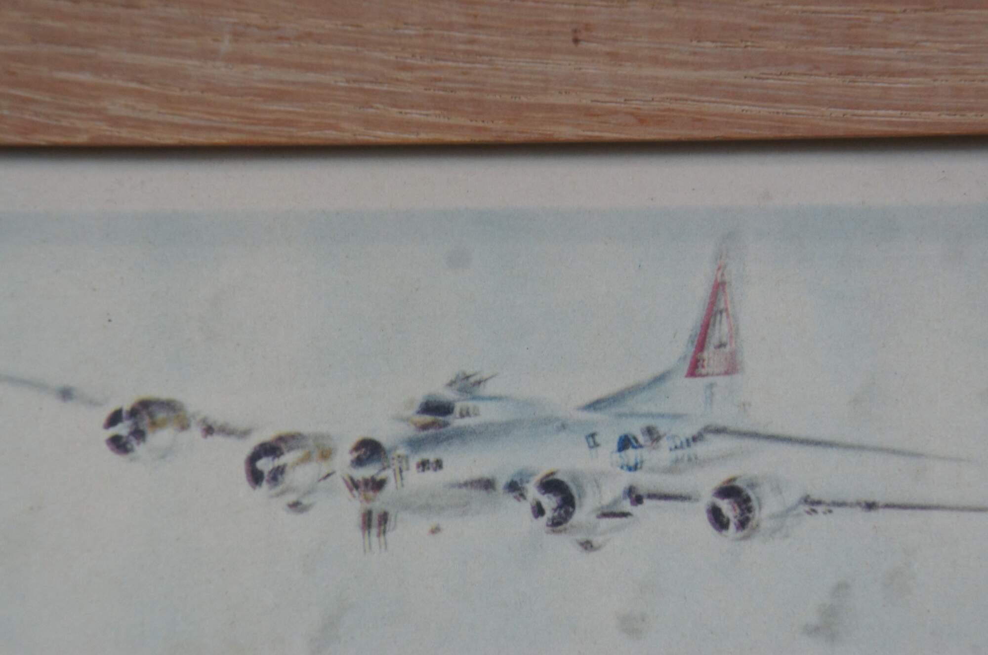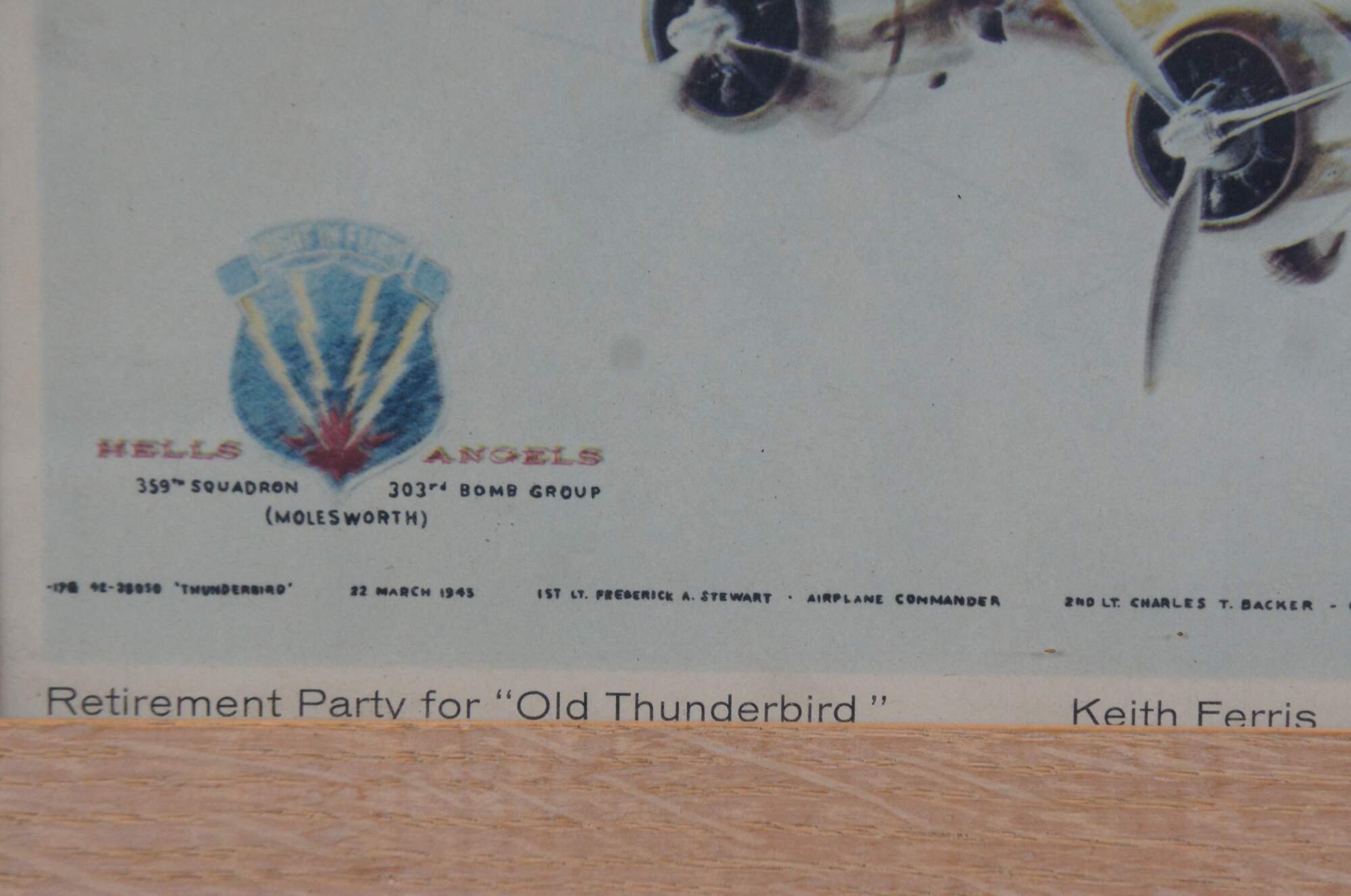 Vintage late 20th century print of "Retirement Party for Old Thunderbird" by Keith Ferris from the U.S. Air Force Art Collection. Based on the mural "Fortresses Under Fire" painted in 1975 at the Smithsonian Air & Space Museum, Washington, DC and depicts the 70th mission of Thunderbird on August 15, 1944 to Wiesbaden, Germany. This is the B-17 that Lt. Vern Moncur flew from Molesworth during WWII. LT Vern Moncur is the father of Gary Moncur who will speak to the JAC on June 5th. A copy of the painting is in the 303rd Bomb Group (Heavy) Memorial Building (Bldg 100) on RAF Molesworth. (Source: 501st Combat Support Wing) Beveled plain wood frame.