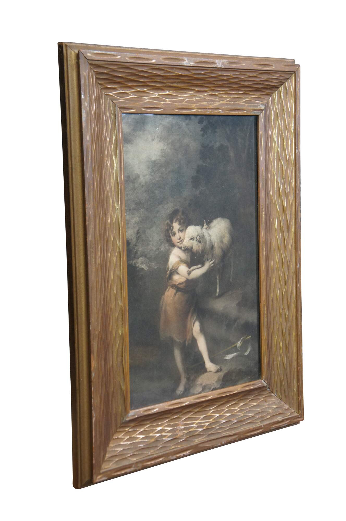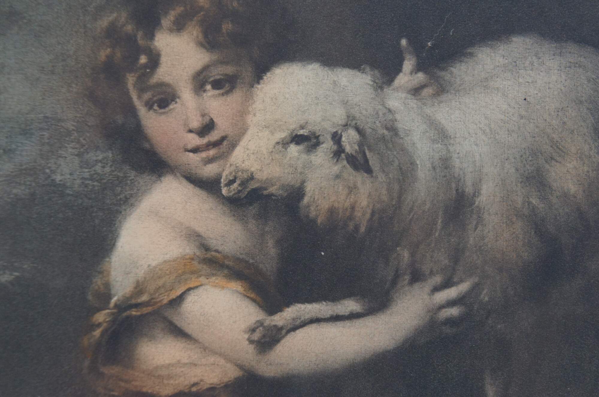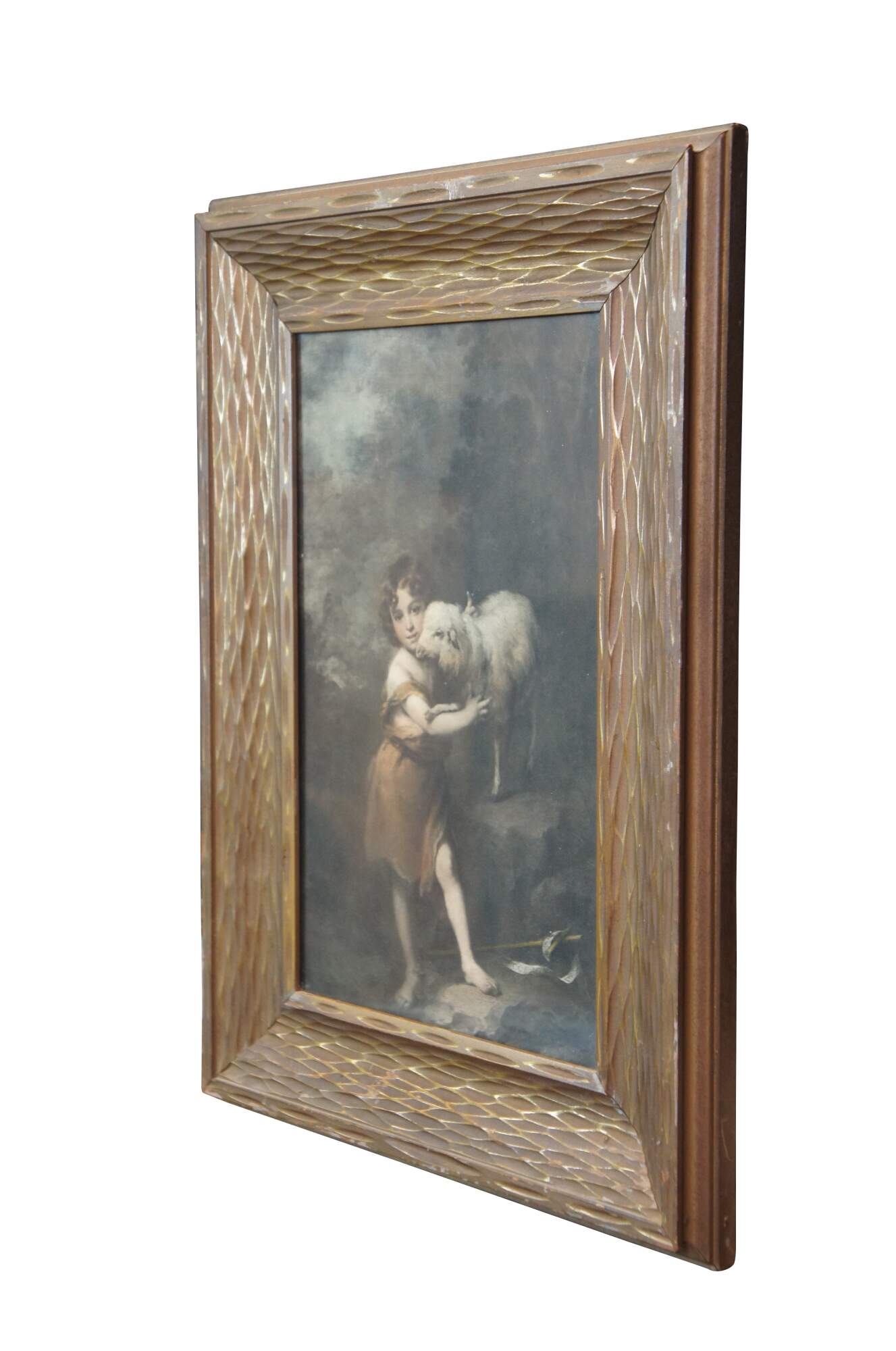 Early to mid 20th century print of "The Infant St. John with the Lamb" by Bartolome Esteban Murillo. Depicts a toddler aged Saint John the Baptist in a rocky landscape, dressed in his traditional camel hair tunic, his arms around white lamb, representing Jesus Christ. The original was painted circa 1660-1665 and is housed today at The Natinal Gallery, London. Bower's Fine Art Goods - Lexington, KY. Beveled, rough carved, lightly gilt wood frame.