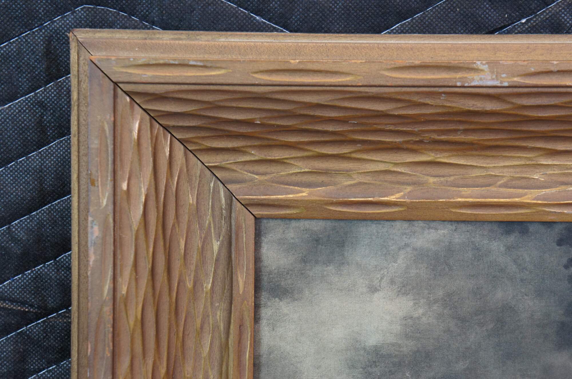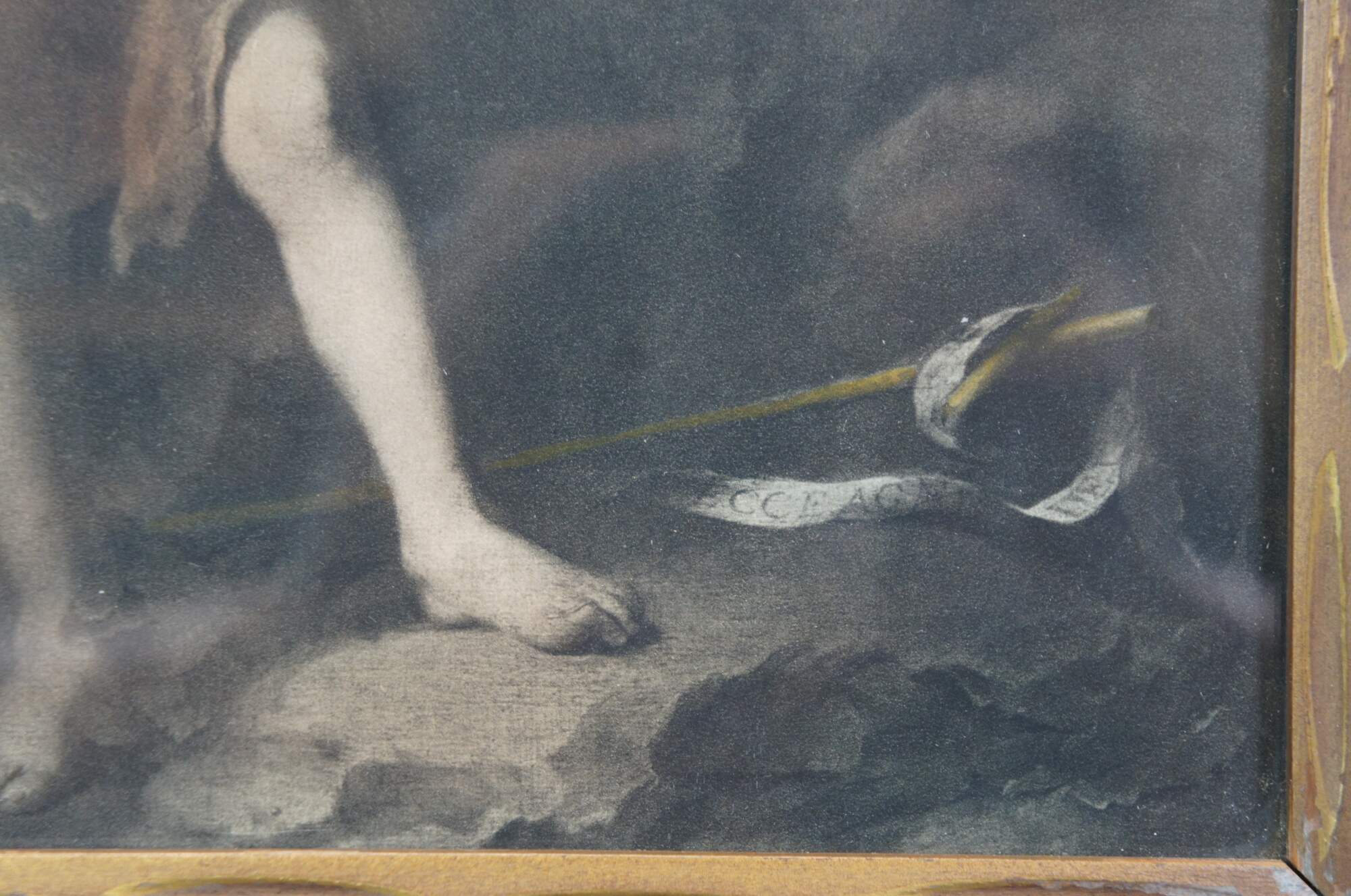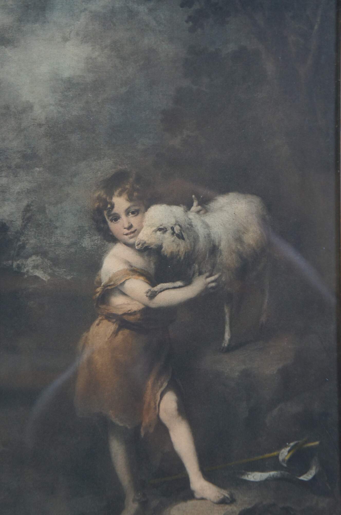 Early to mid 20th century print of "The Infant St. John with the Lamb" by Bartolome Esteban Murillo. Depicts a toddler aged Saint John the Baptist in a rocky landscape, dressed in his traditional camel hair tunic, his arms around white lamb, representing Jesus Christ. The original was painted circa 1660-1665 and is housed today at The Natinal Gallery, London. Bower's Fine Art Goods - Lexington, KY. Beveled, rough carved, lightly gilt wood frame.