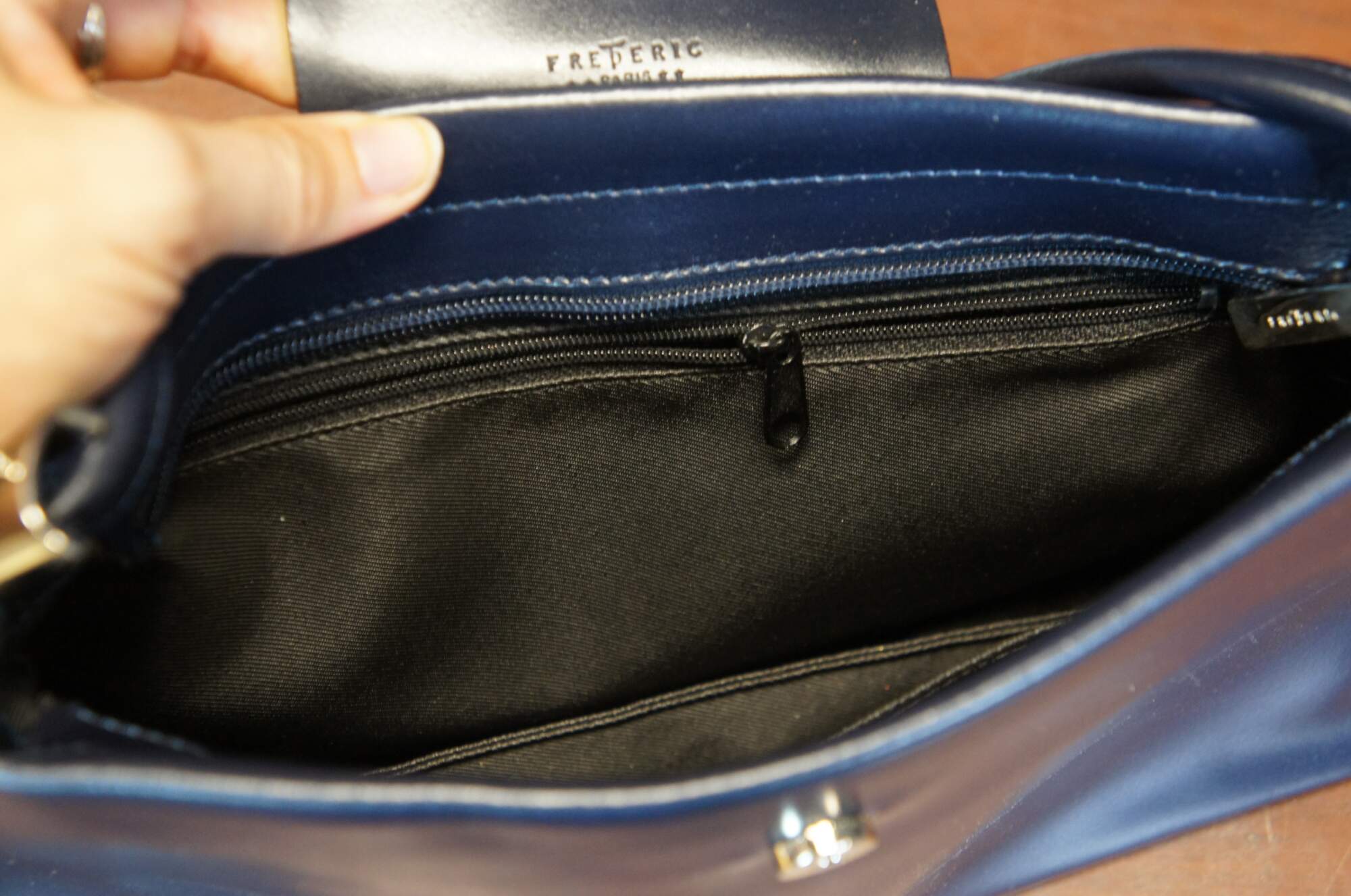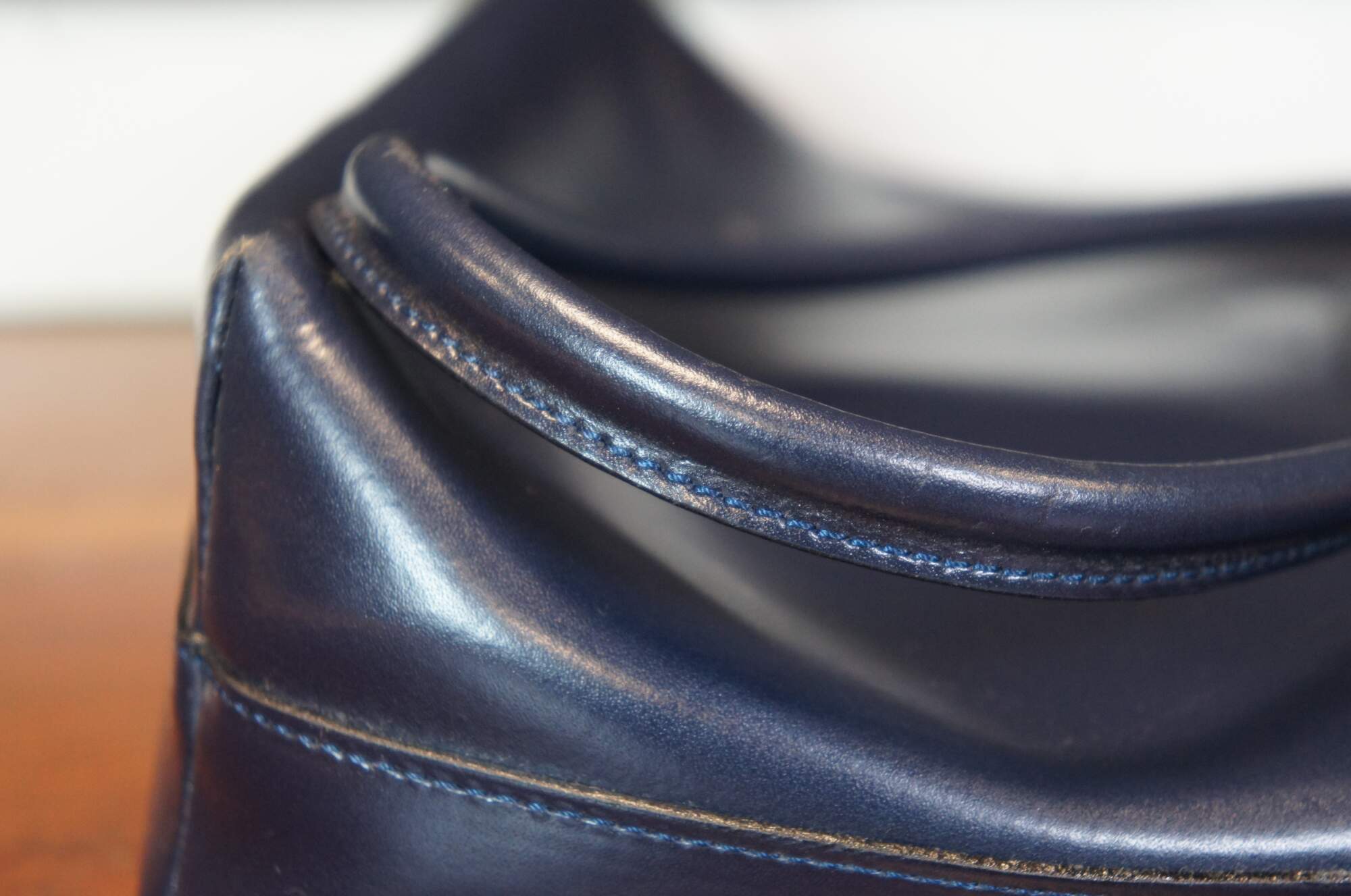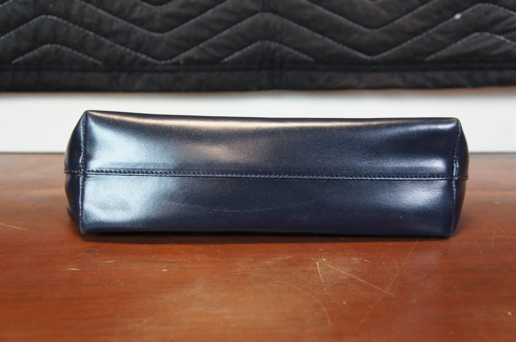 Vintage Frederic T Paris purse / shoulder bag. Navy / cobalt blue leather with magnetic flap; zipper closure; black twill lining, one zipper interior pocket; two interior slip pockets; adjustable shoulder strap. Made in France. Includes dust bag.