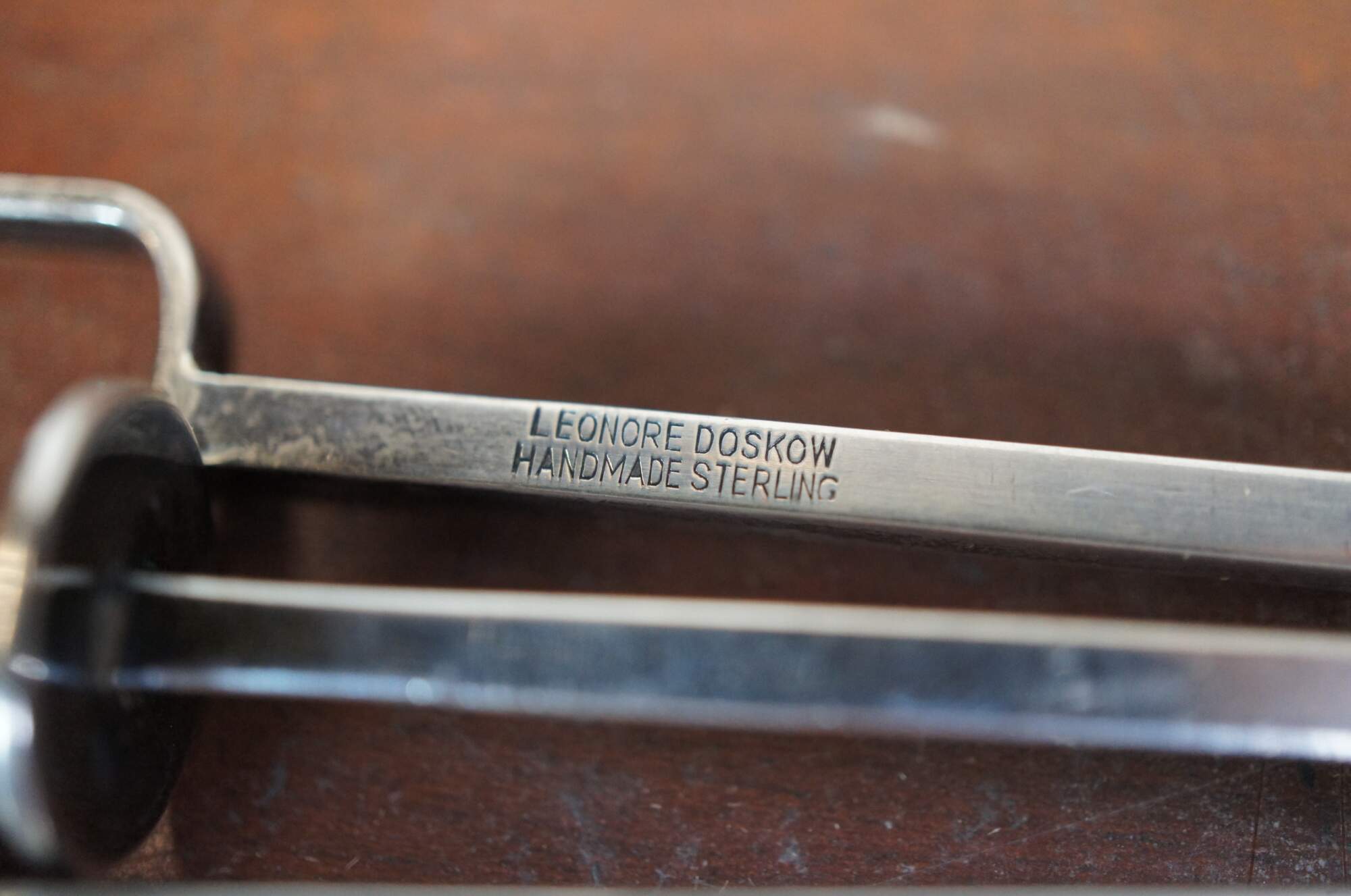 Rare vintage 3 piece handmade sterling silver olive serving set by Leonore Doskow. Minimalist / modernist styling with curled ends. Set includes spoon, fork and skewer.
