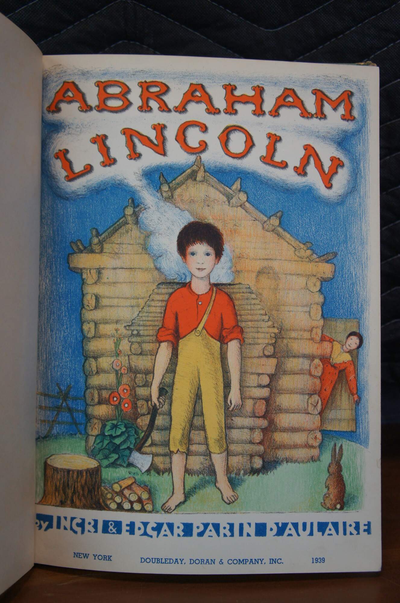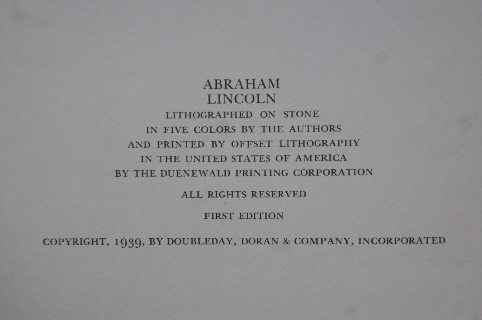 Abraham Lincoln" by Ingri & Edgar Parin D'Aulaire - Copyright / Published by Doubleday, Doran & Company Inc, New York 1939 - Lithographed on stone in five colora by the authors and printed by offset lithography in the United States of America by the Duenewald Printing Corporation - First Edition. Paper bound hard back / hard cover; blue cloth spine. No jacket.