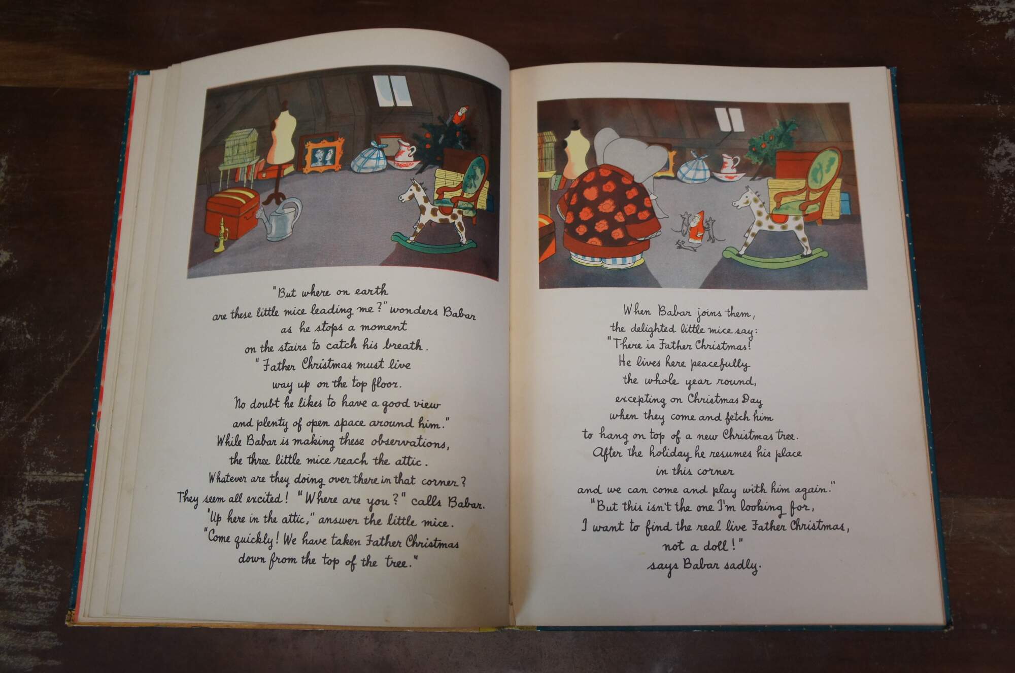 Babar and Father Christmas" by Jean de Brunhoff - Translated from the French by Merle Haas - Copyright / Published by Random House Inc, New York 1940 - Lithographed in the United States of America by the Duenewald Printing Corporation. Paper bound hard cover / hard back, yellow cloth spine. No jacket.