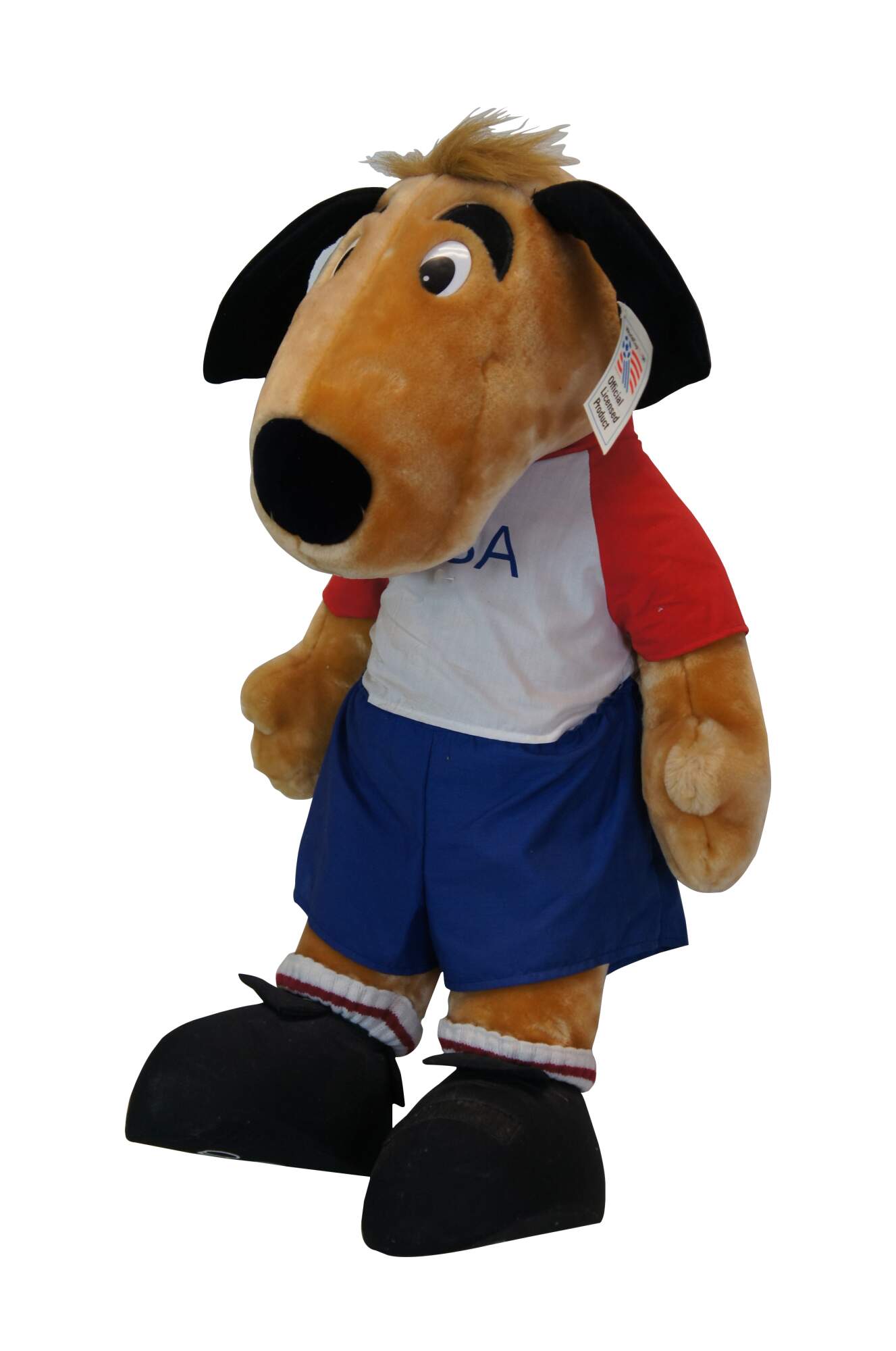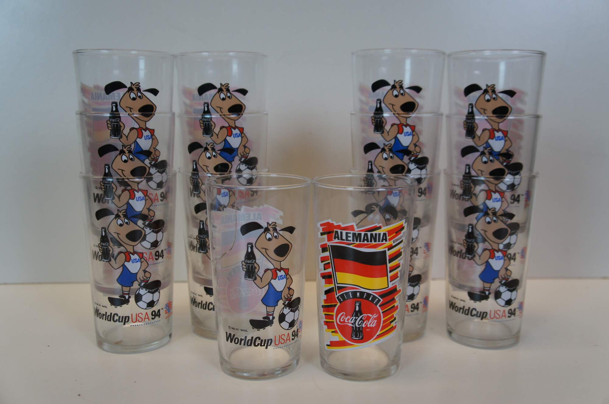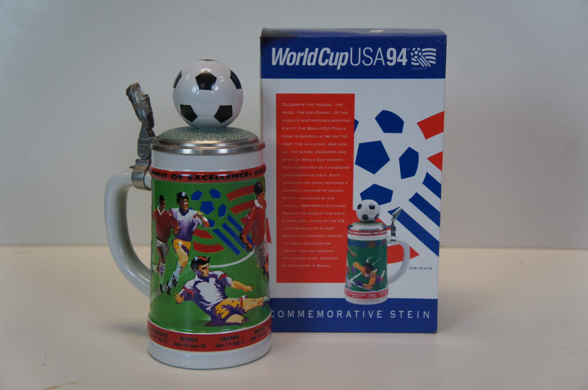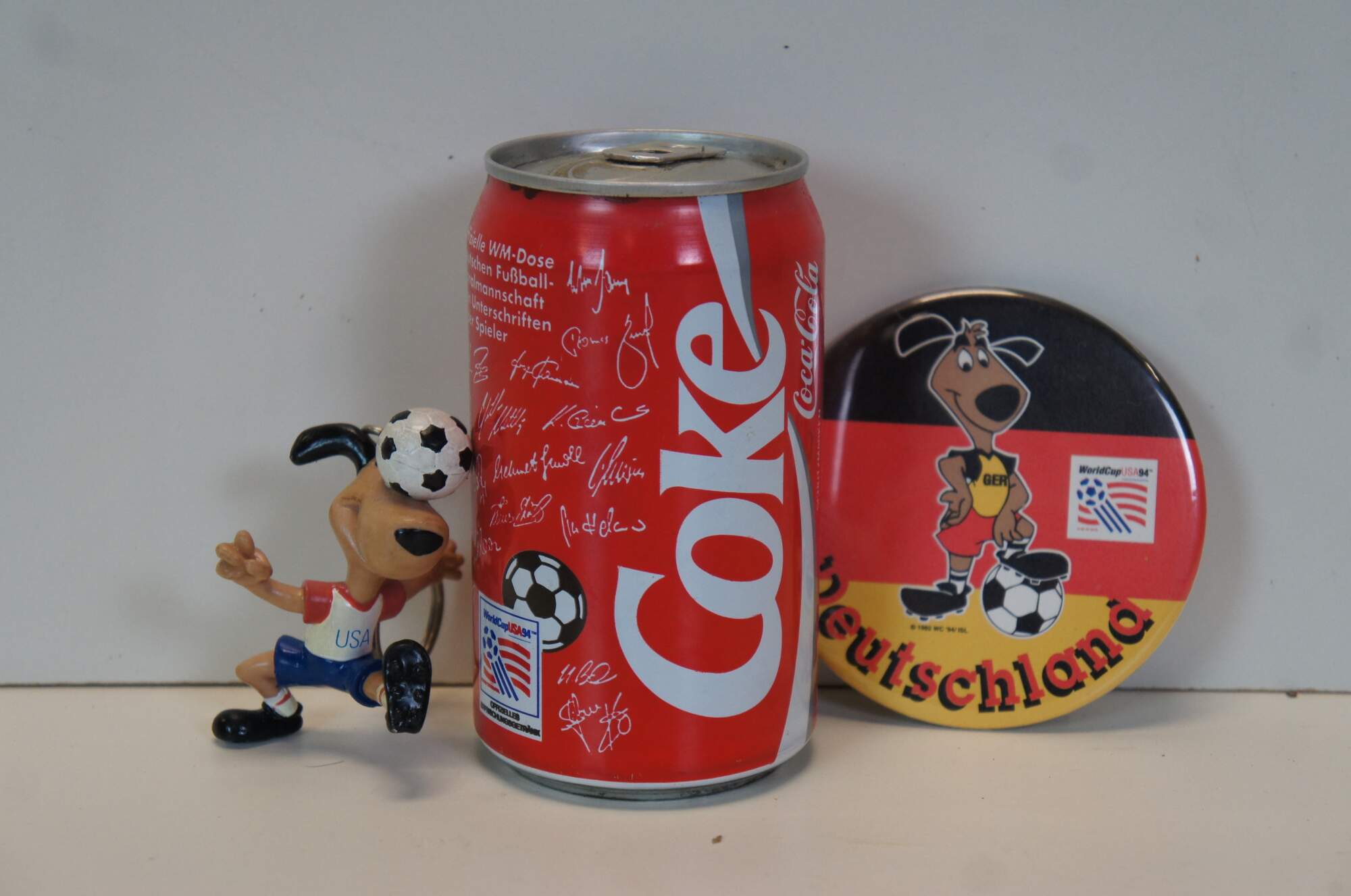 Lot of 56 pieces of FIFA World Cup USA 1994 soccer memorabilia and collectibles. Includes: large 28" standing Striker the dog mascot plush, Boston / Germany windbreaker jacket (size Large), Germany baseball cap with 2 enamel pins, Germany scarf, 14 Alemania / Germany glass tumblers, Budweiser Commemorative Stein, mascot keychain, commemorative Coca Cola can (unopened), Deutschland button, 2 newspapers with articles about the event, 30 pieces of ephemera (including tickets, game schedules, informative booklets and advertisements).