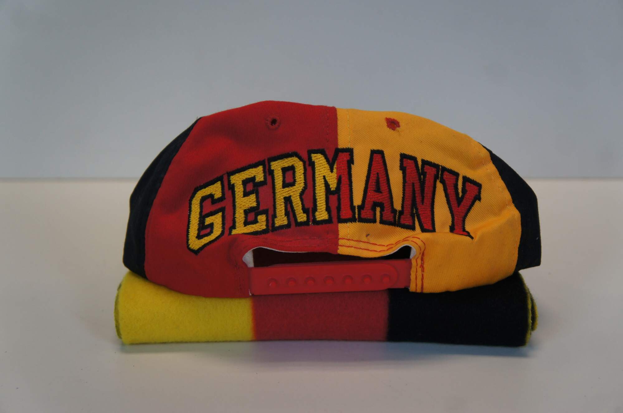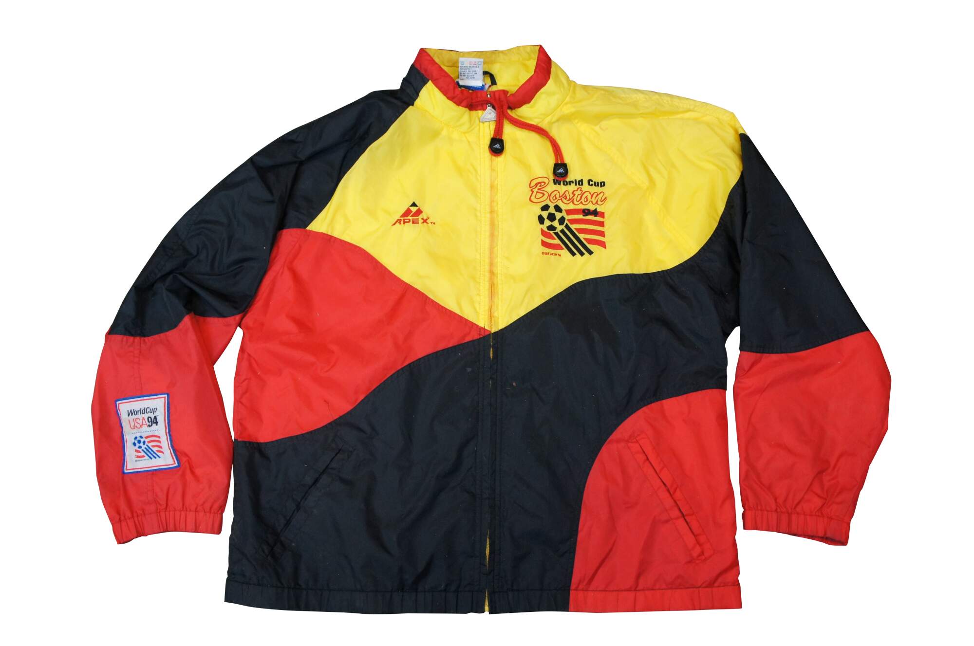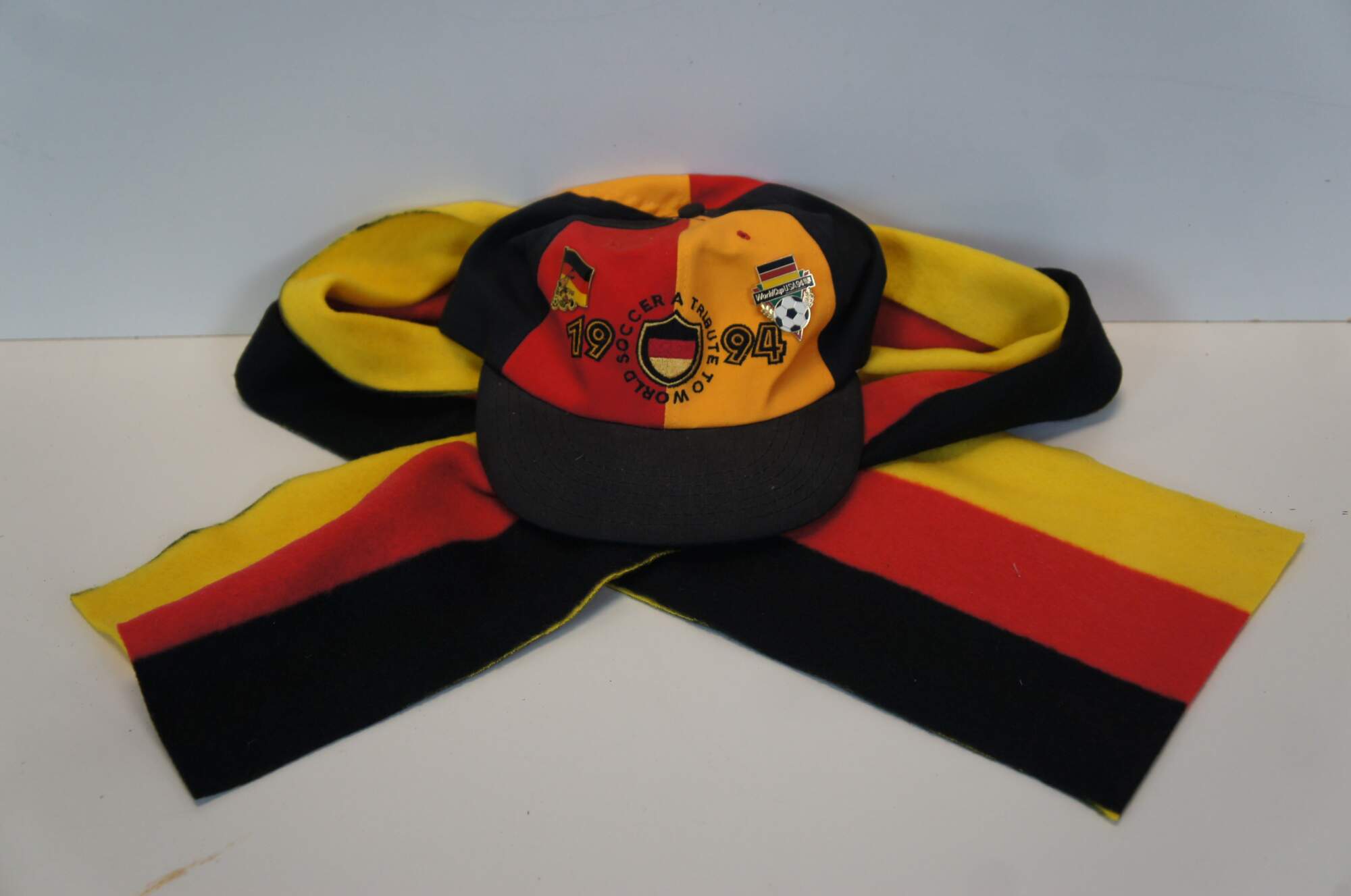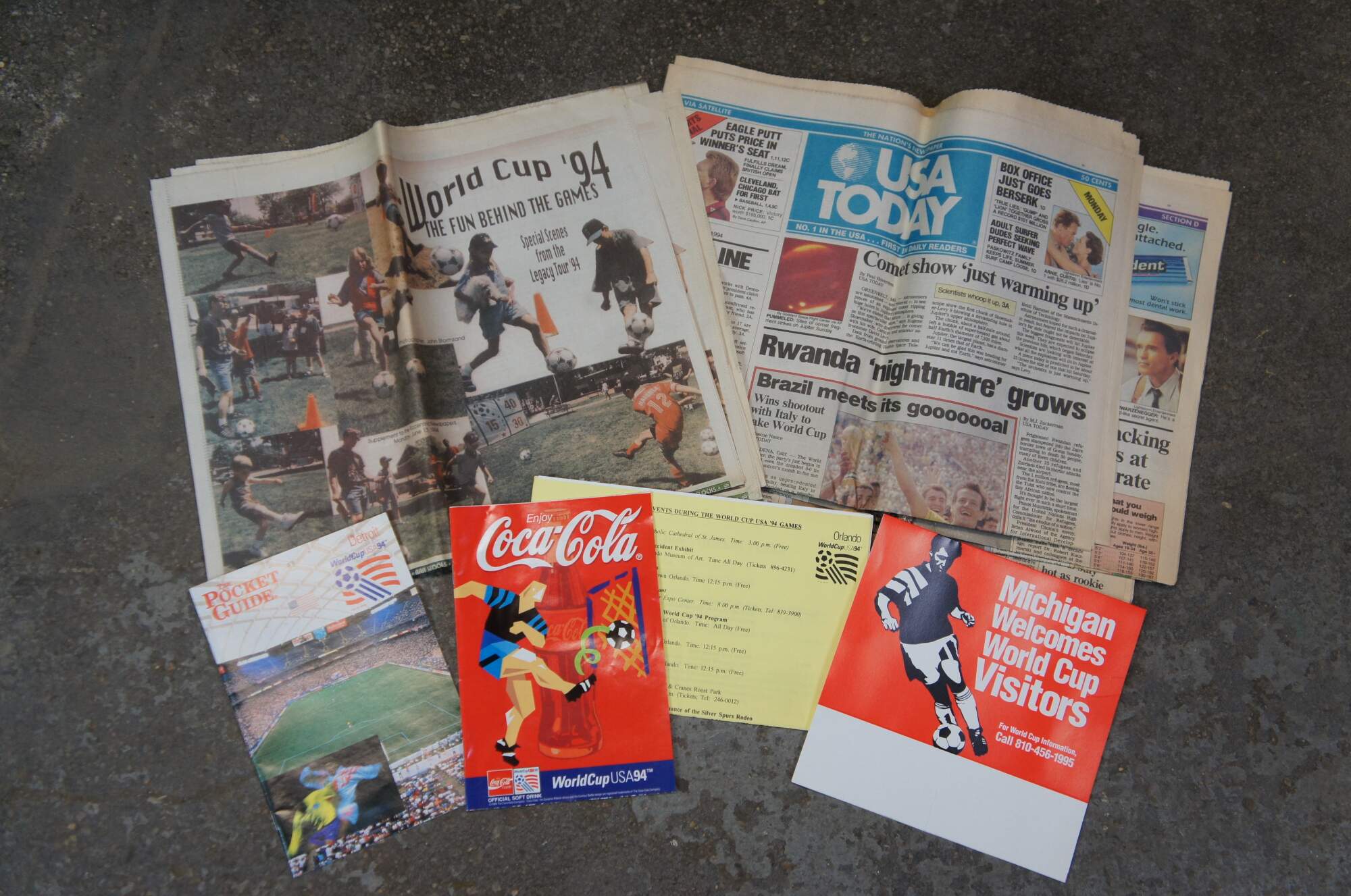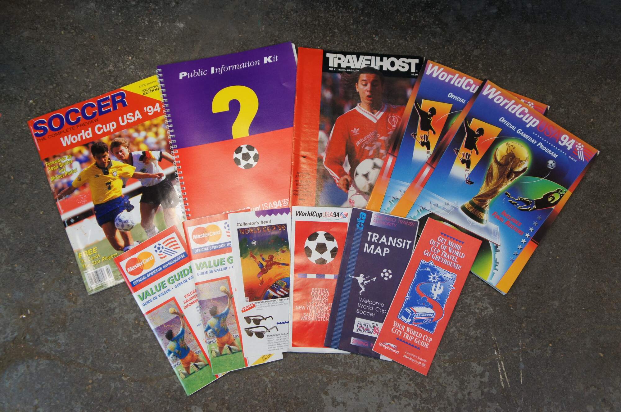 Lot of 56 pieces of FIFA World Cup USA 1994 soccer memorabilia and collectibles. Includes: large 28" standing Striker the dog mascot plush, Boston / Germany windbreaker jacket (size Large), Germany baseball cap with 2 enamel pins, Germany scarf, 14 Alemania / Germany glass tumblers, Budweiser Commemorative Stein, mascot keychain, commemorative Coca Cola can (unopened), Deutschland button, 2 newspapers with articles about the event, 30 pieces of ephemera (including tickets, game schedules, informative booklets and advertisements).