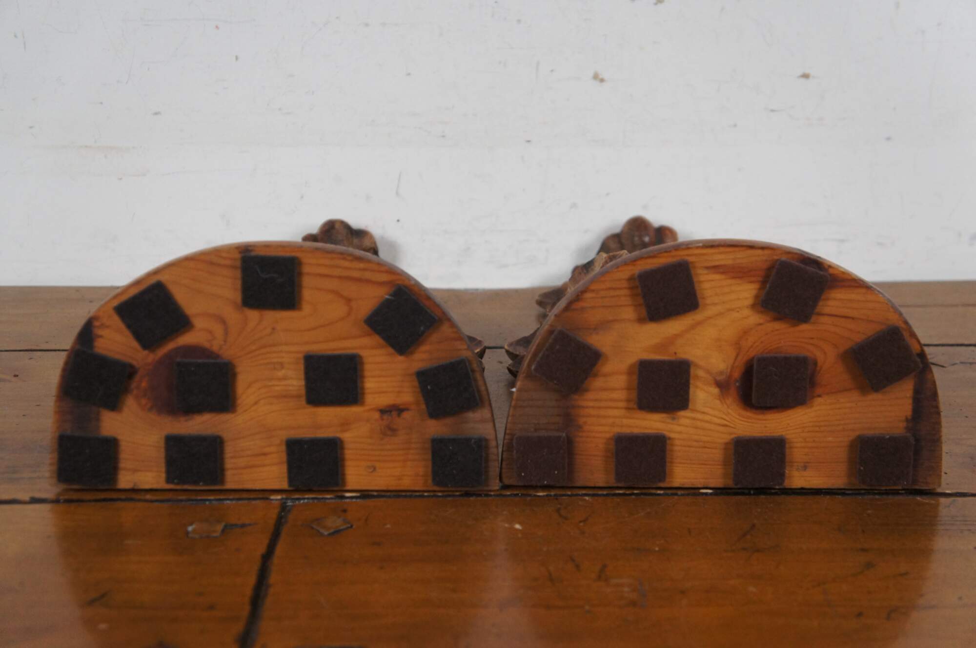 Pair of antique hand carved pine corbels / brackets / shelves. Demilune surfaces with baroque scrolled acanthus leaves. Both surfaces have adhesive felt pads across them.