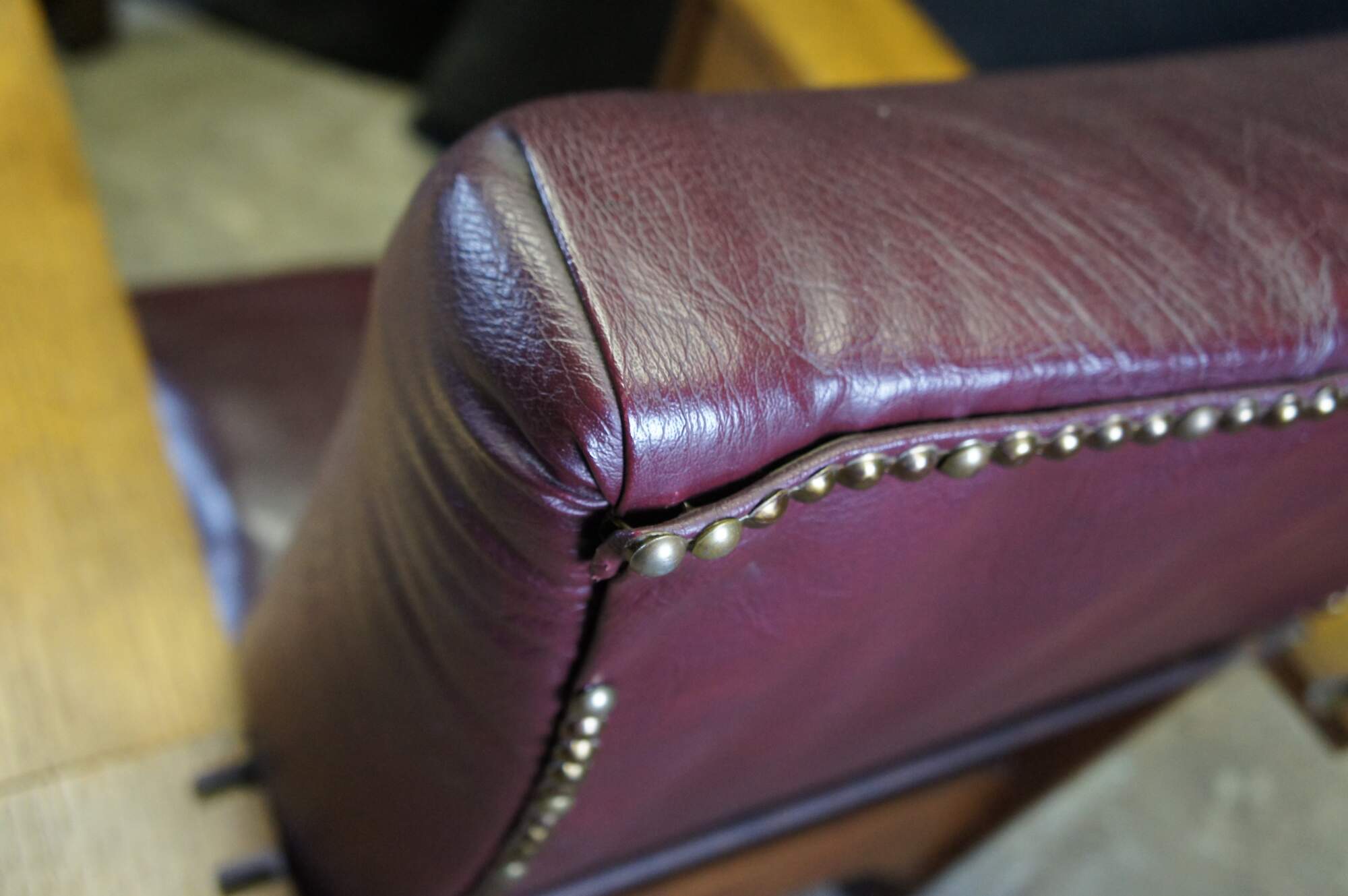 Good antique condition, wear and distressing commensurate with age and use, scuffing / tears / impacts to vinyl, missing nailheads, no longer reclines.
