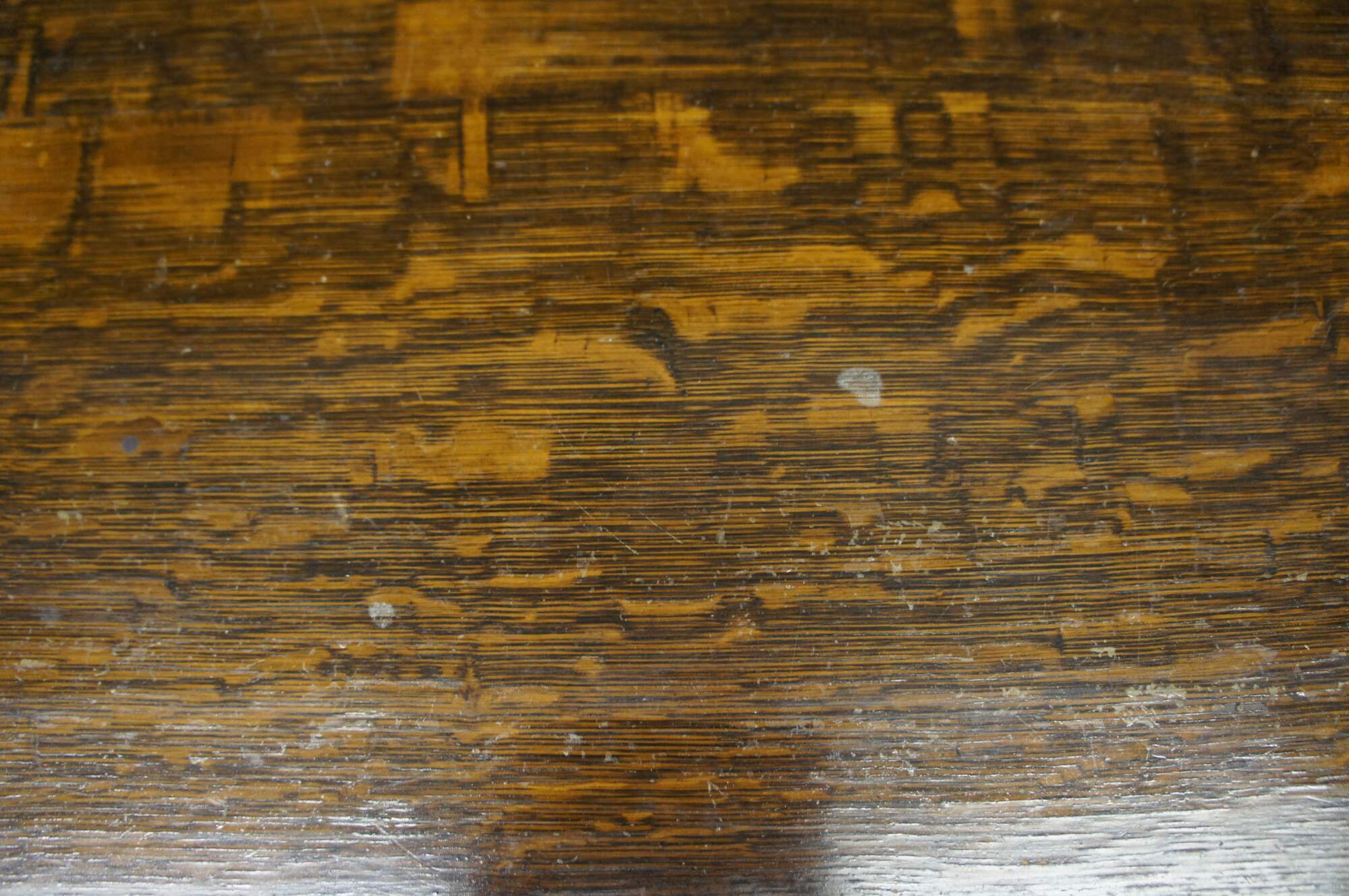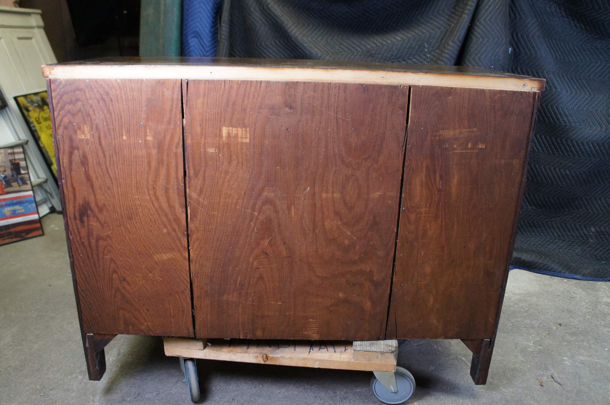 Good antique condition, wear and distressing commensurate with age and use, scuffing, marking, fading, finish loss, veneer loss, edge wear, one knob missing edge, one mismatched knob.