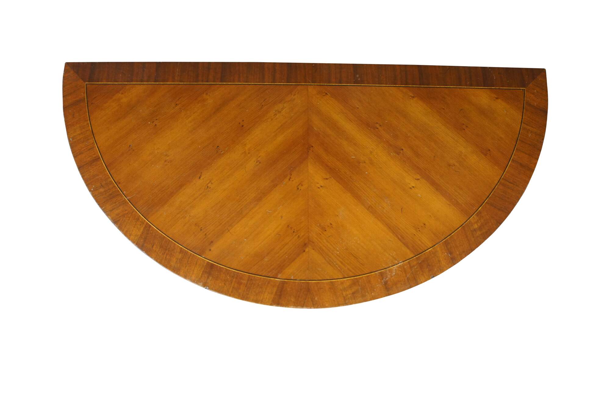 Vintage demilune console table or sideboard. Made of mahogany featuring Sheraton / Federal styling with half round form, matchbook top, fan inlay and tapered legs.