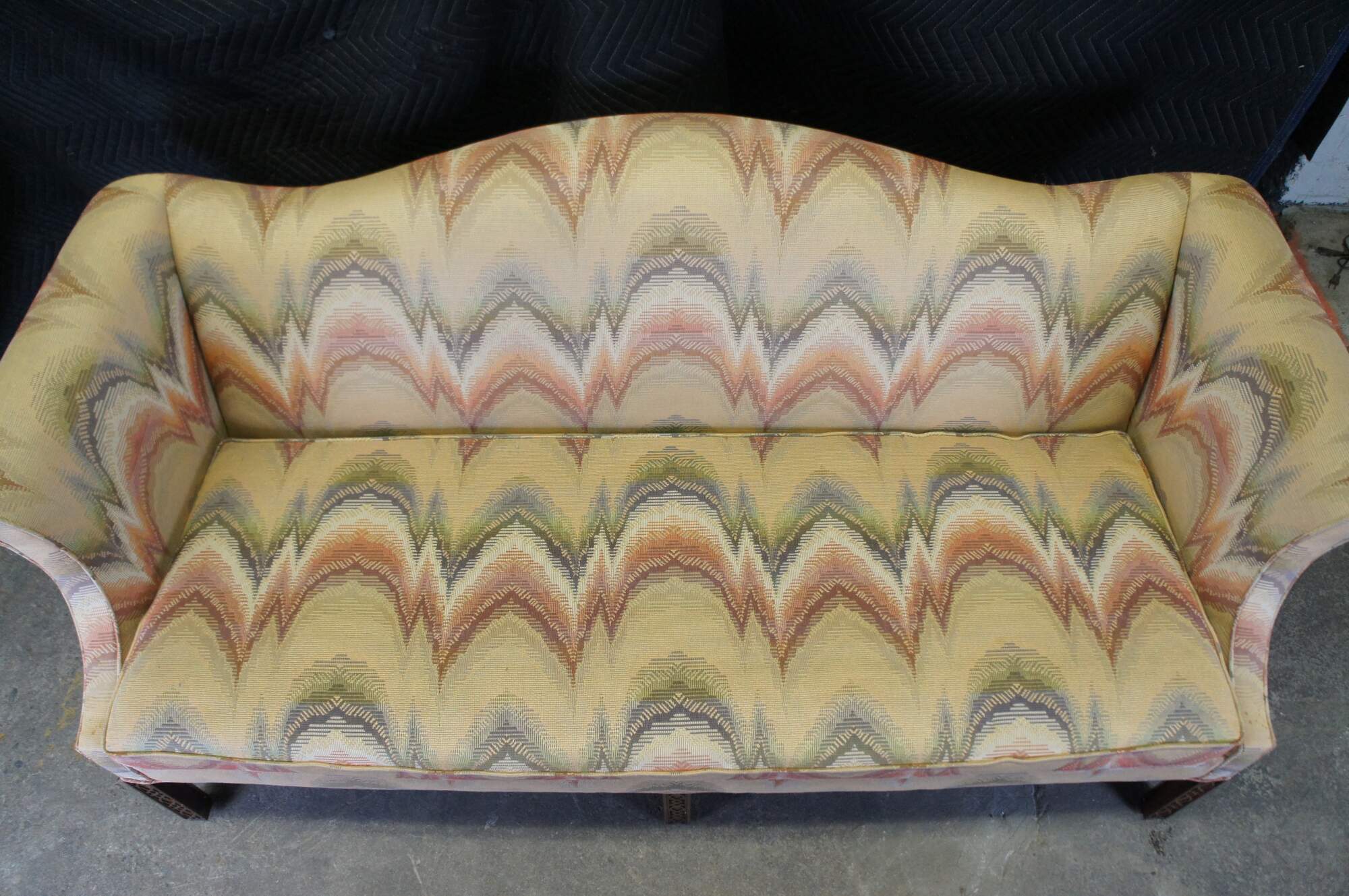 Southwood Chippendale camelback parlor sofa or couch, circa 1980s. Made of mahogany featuring flame stitch fabric with rolled arms and fretwork legs connected by H stretcher.