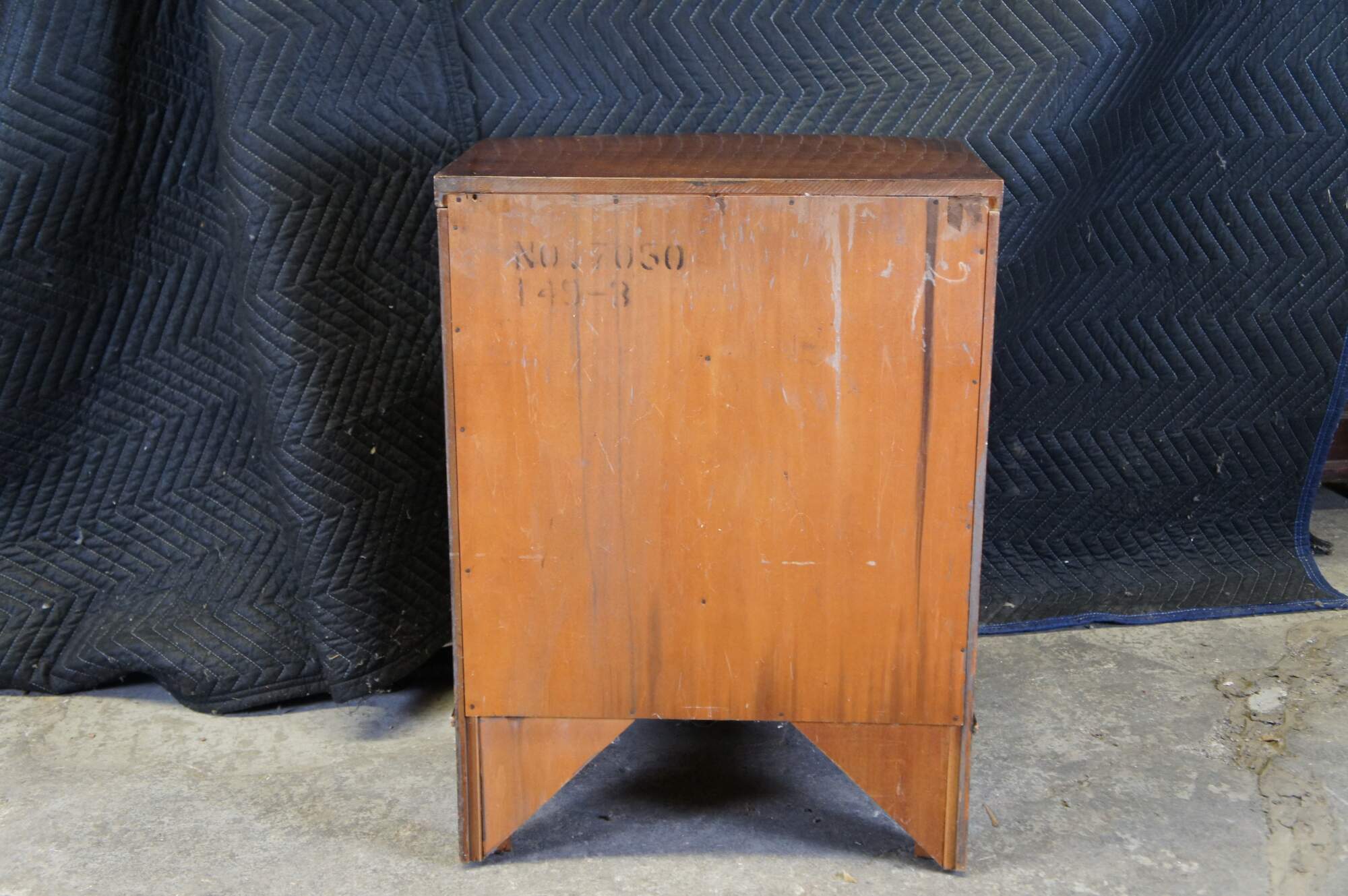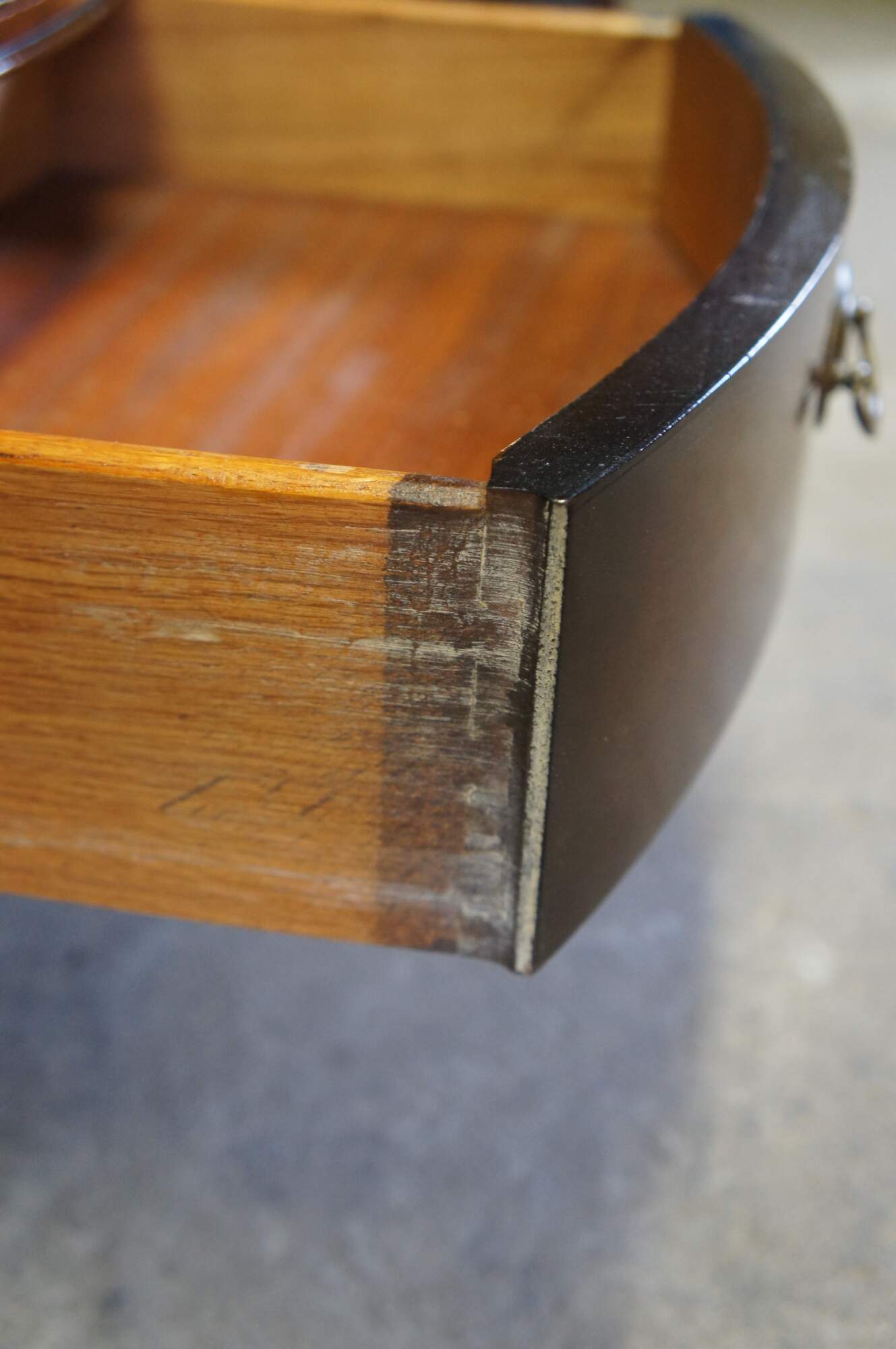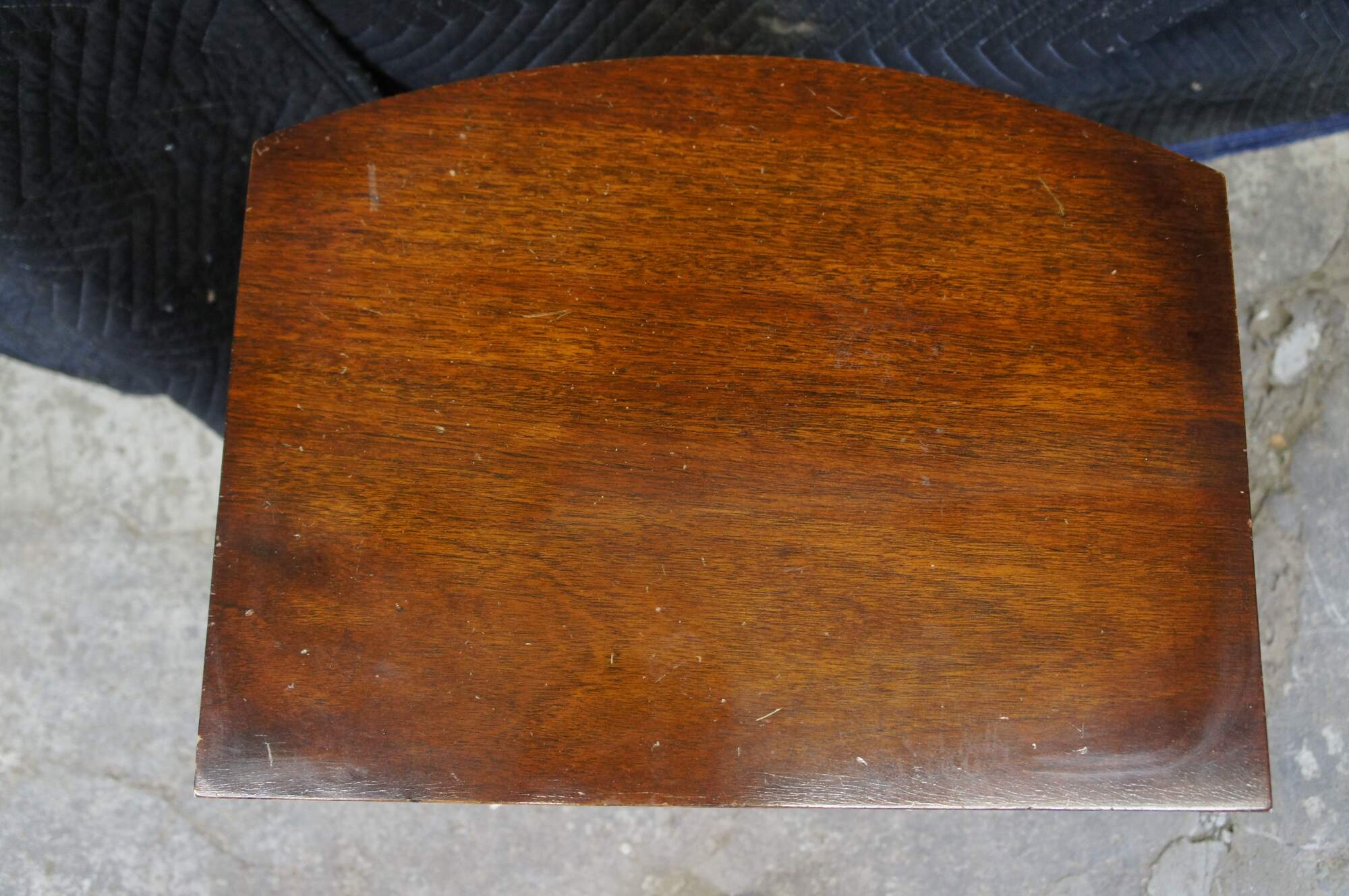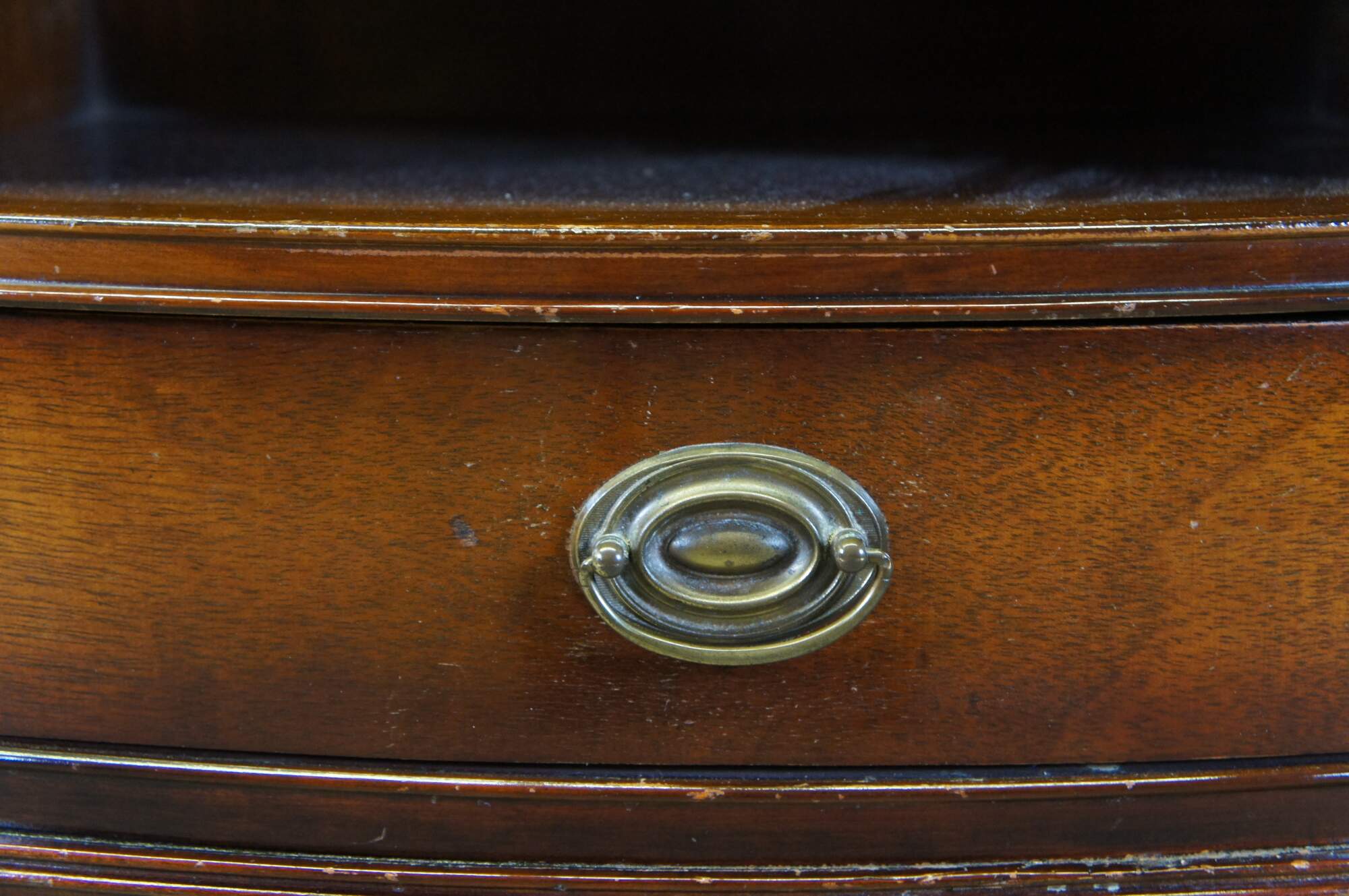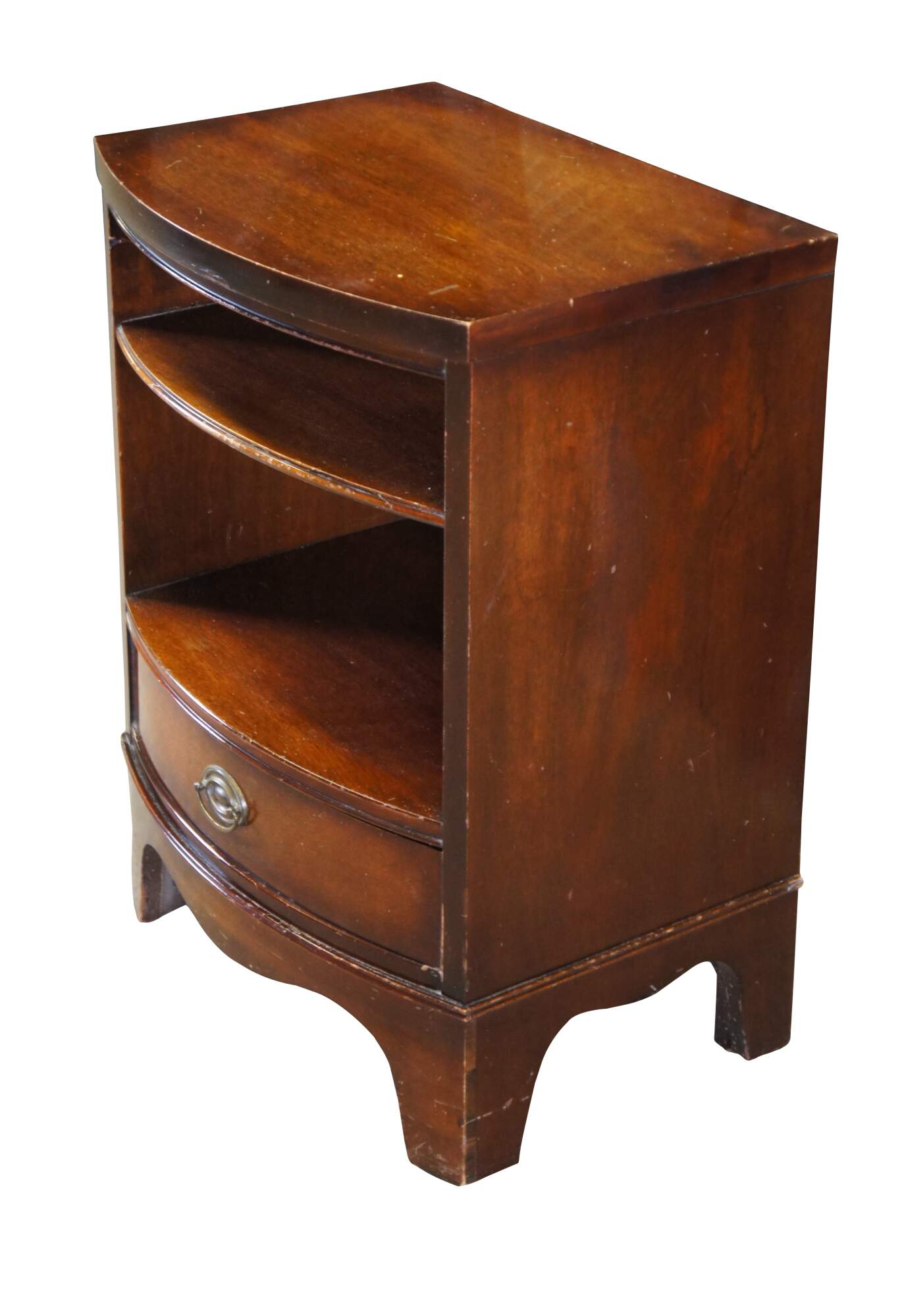 Antique circa 1940s Duncan Phyfe style bow front nightstand. Made of mahogany featuring a tiered design with multiple cubbies / shelves and one drawer. 7030. 149-3.