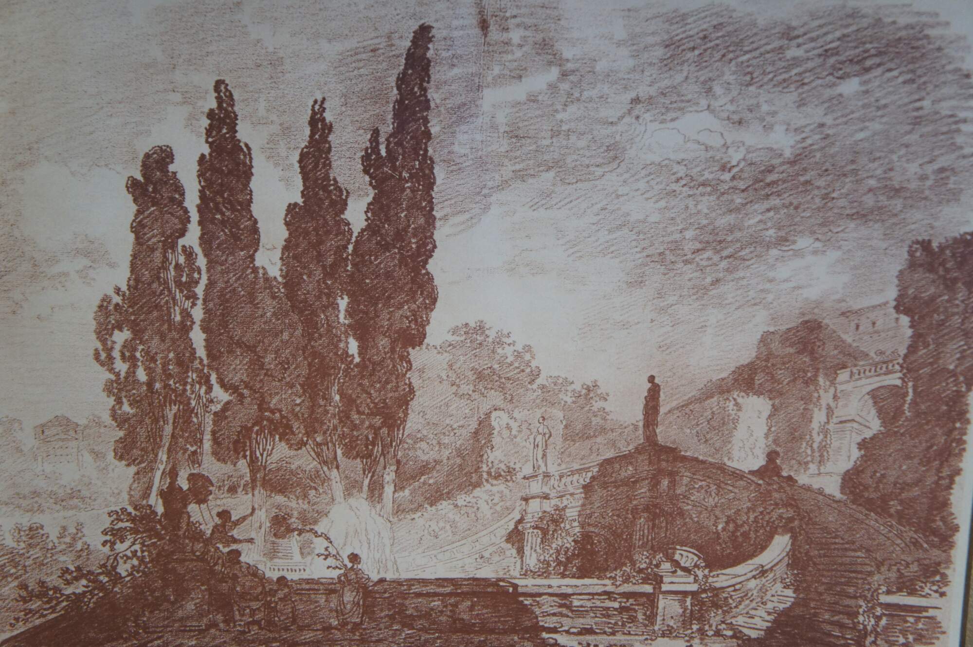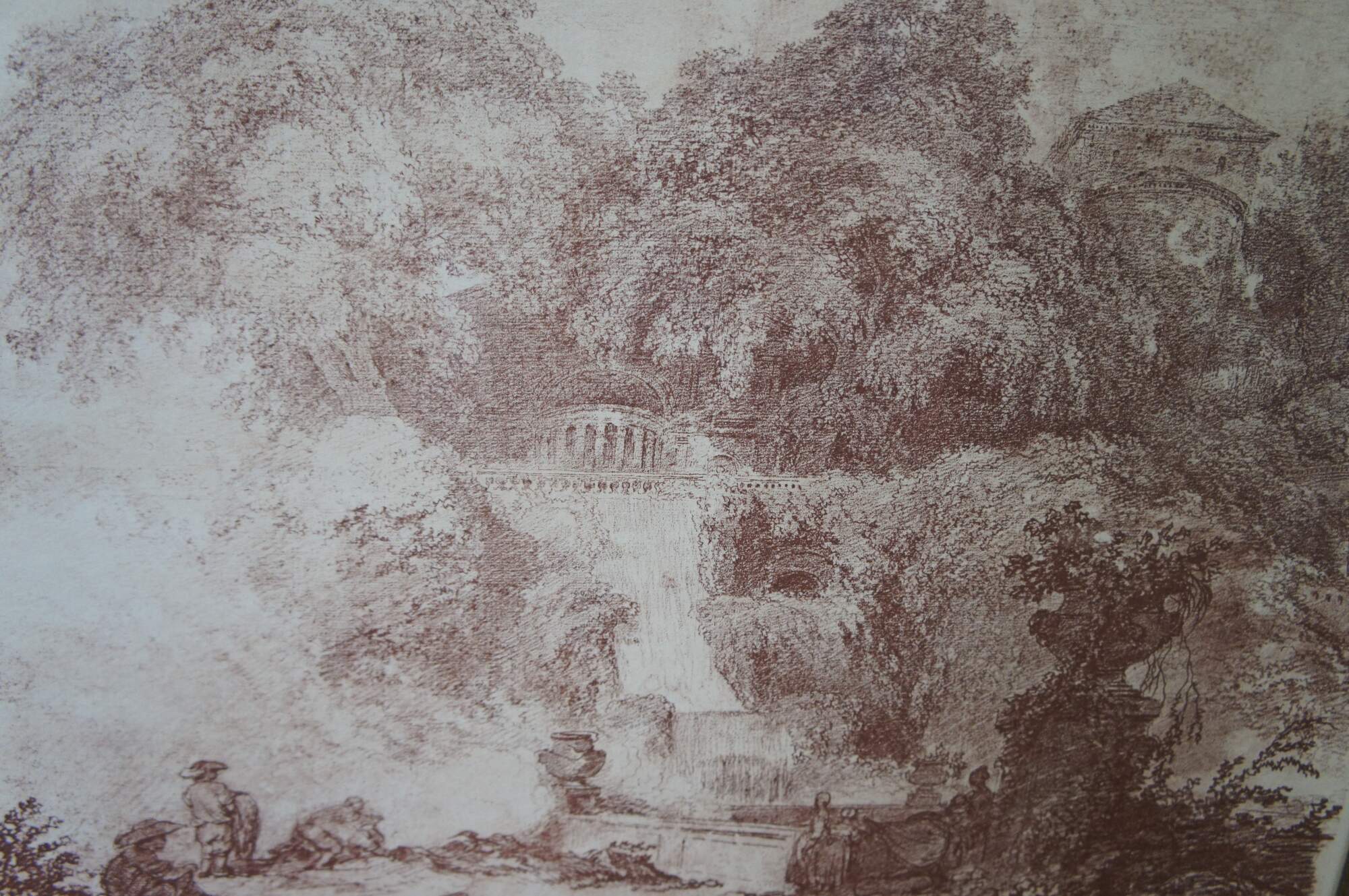 While at Rome, Fragonard contracted a friendship with a fellow painter Hubert Robert. In 1760, they toured Italy together, executing numerous sketches of local scenery. It was in these romantic gardens, with their fountains, grottoes, temples and terraces, that Fragonard conceived the dreams which he was subsequently to render in his art. He also learned to admire the masters of the Dutch and Flemish schools (Rubens, Hals, Rembrandt, Ruisdael), imitating their loose and vigorous brushstrokes. Added to this influence was the deep impression made upon his mind by the florid sumptuousness of Giovanni Battista Tiepolo, whose works he had an opportunity to study in Venice before he returned to Paris in 1761.