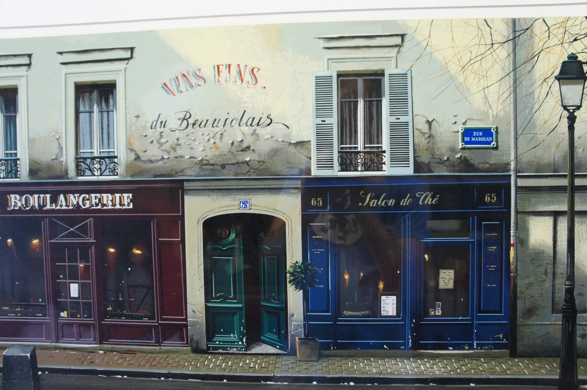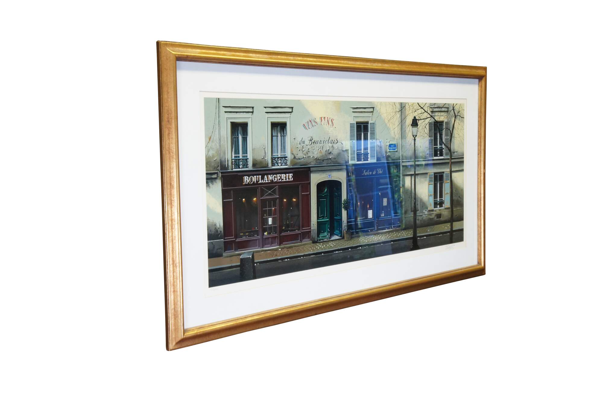 Vintage Thomas Pradzynski Twilight on Rue de Madiran serigraph print, circa 1992. It features a cityscape / streetscape view of the Rue de Madiran in Paris France. Vins Fins du Beaujolais, Boulangerie, Salon de Che. Museum framed in gold.