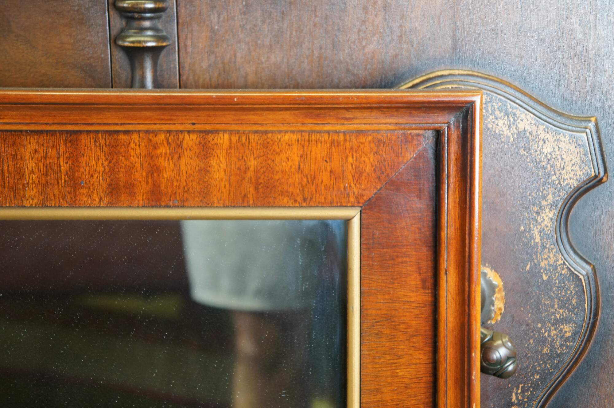 Vintage rectangular mahogany wall vanity mirror featuring traditional styling with gold trim.