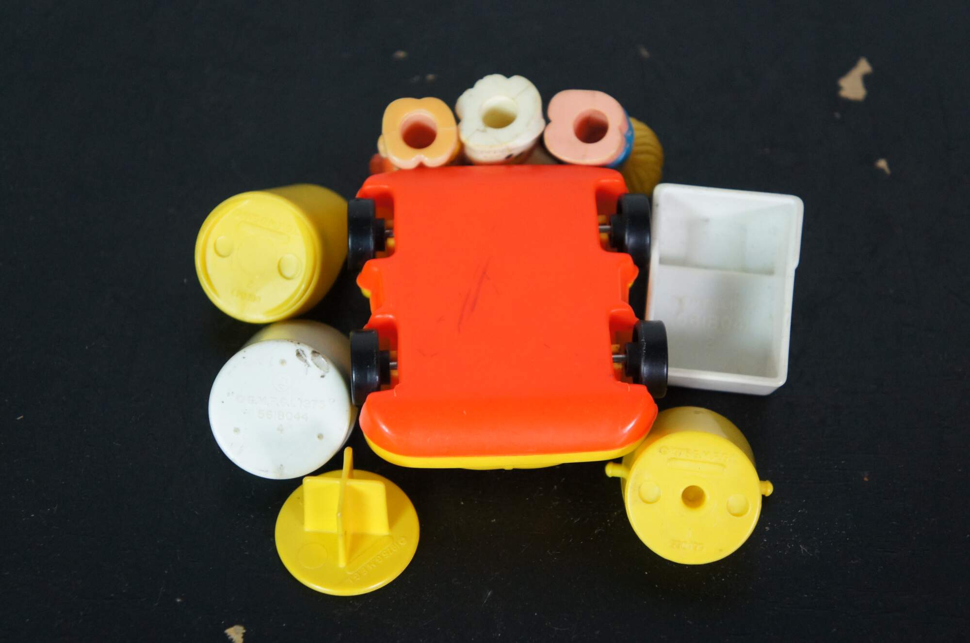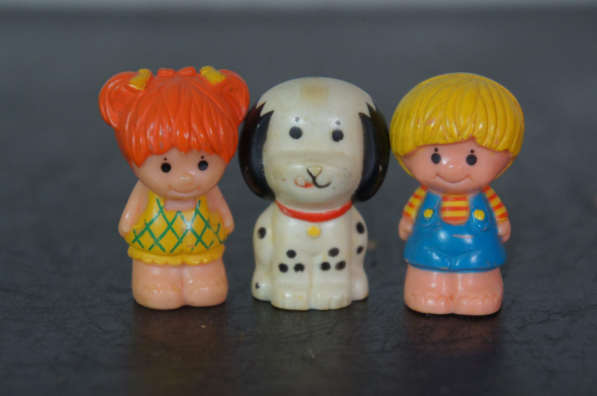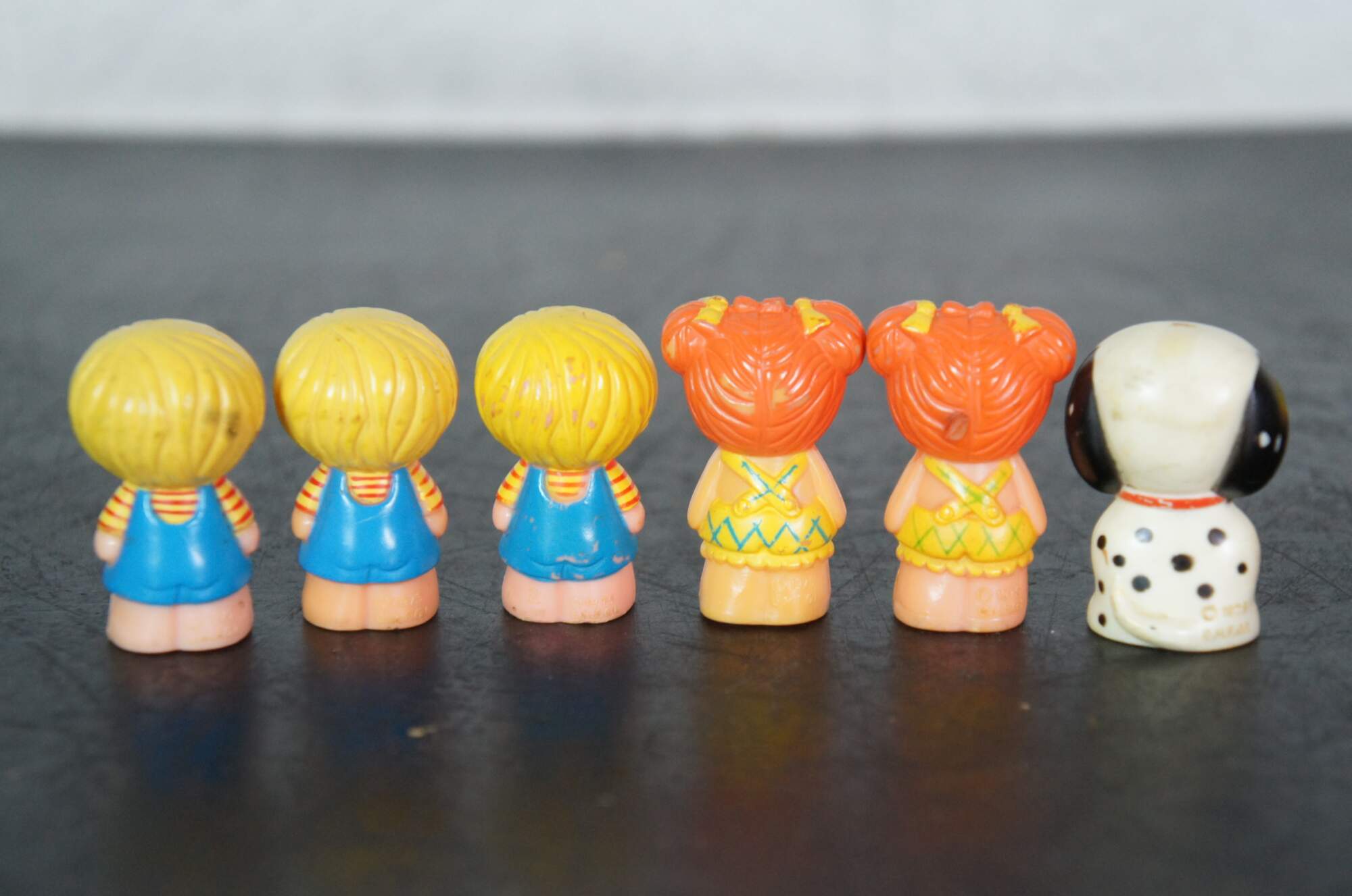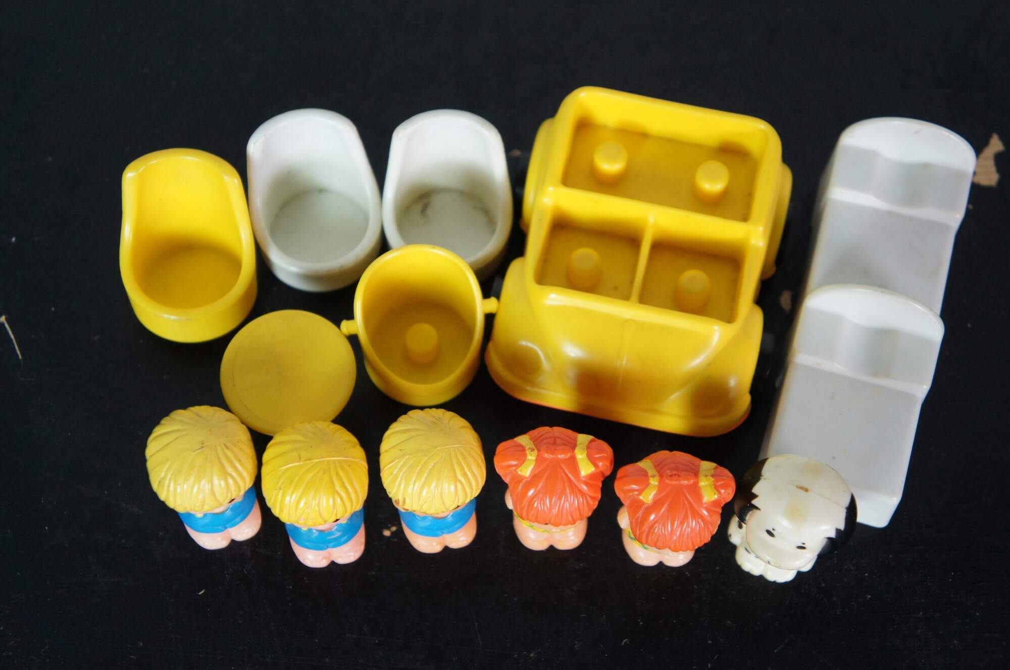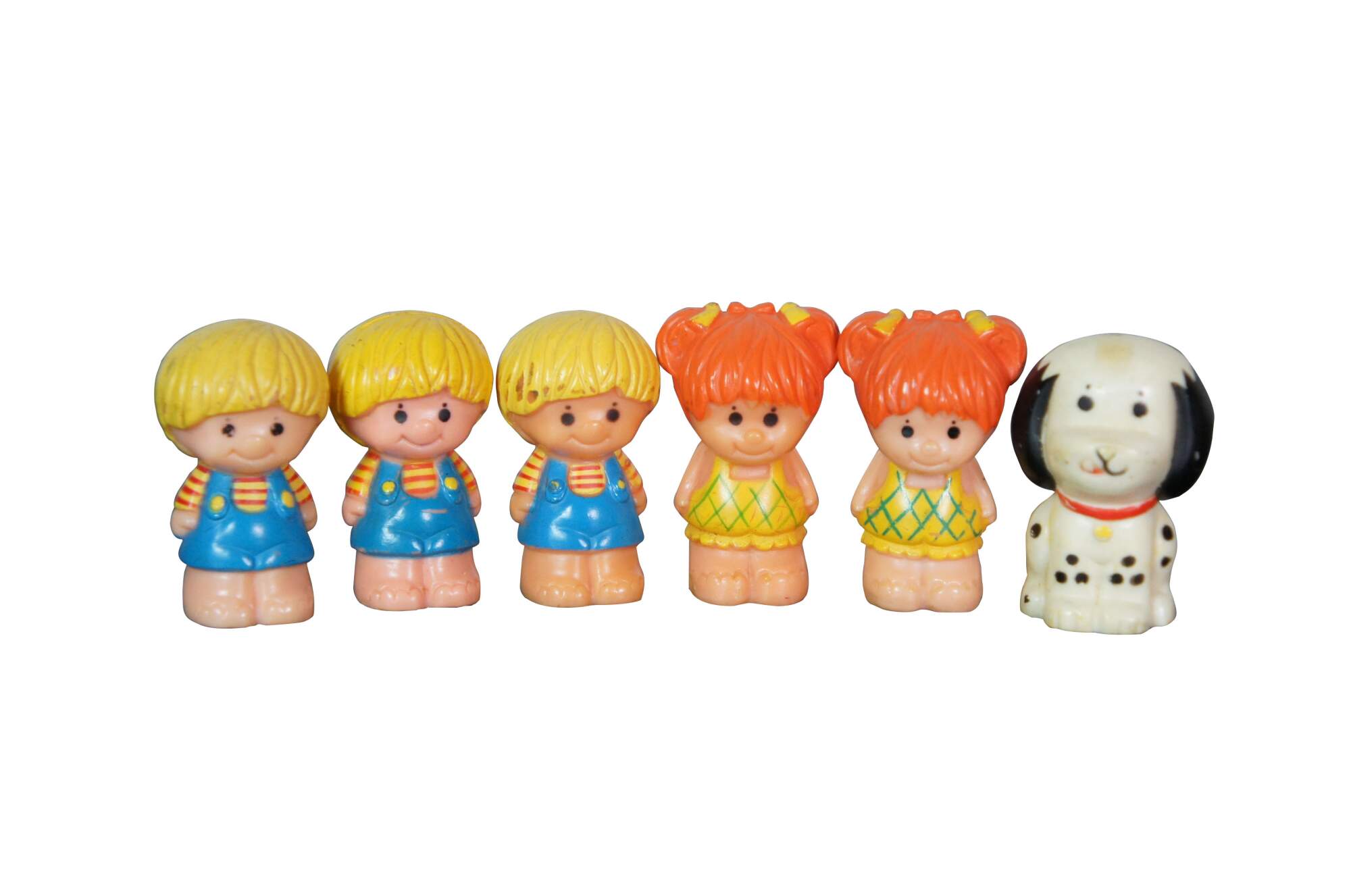 Vintage 14 piece lot of 1970's Kenner Tree Tots toys. Includes: 3 boy figures, 2 girl figures, dog, 3 chairs, 1 swing chair, 1 table, 2 beds, and 1 car.