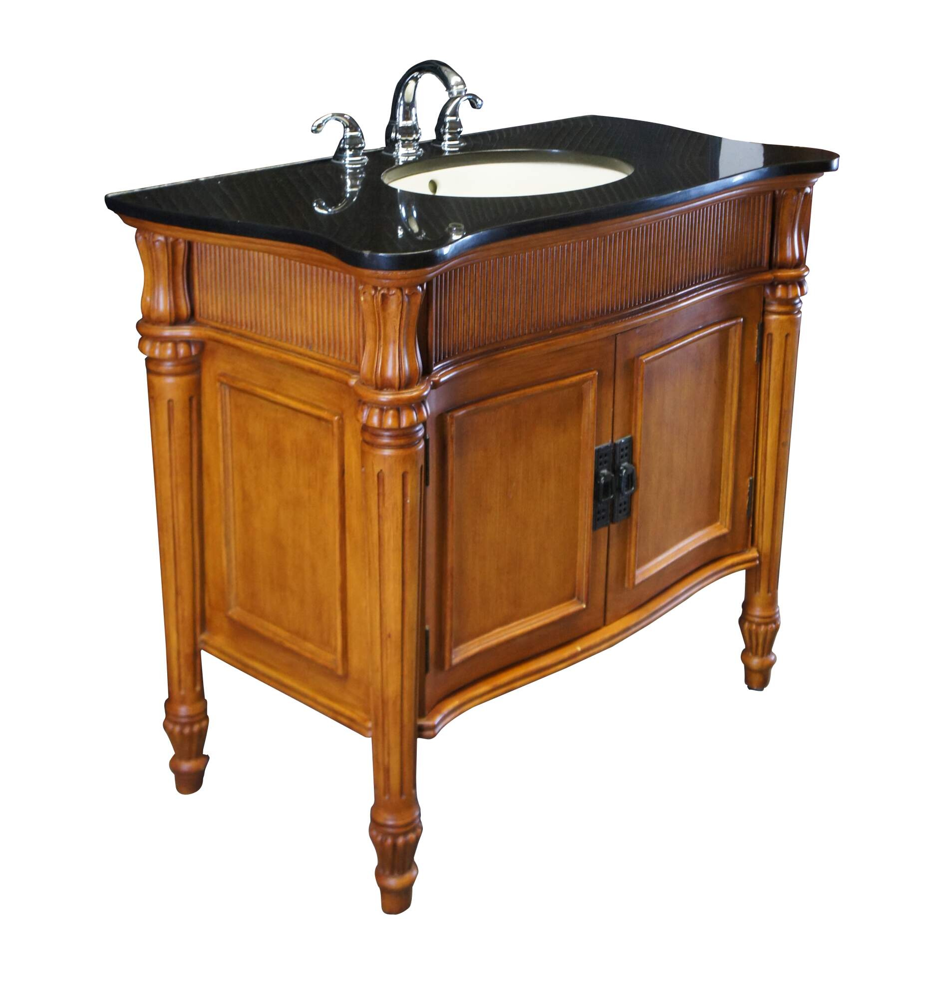 Vintage vanity sink / cabinet featuring a tapered and fluted design with double doors, two shelves, serpentine black granite top, and nickle plated hardware.