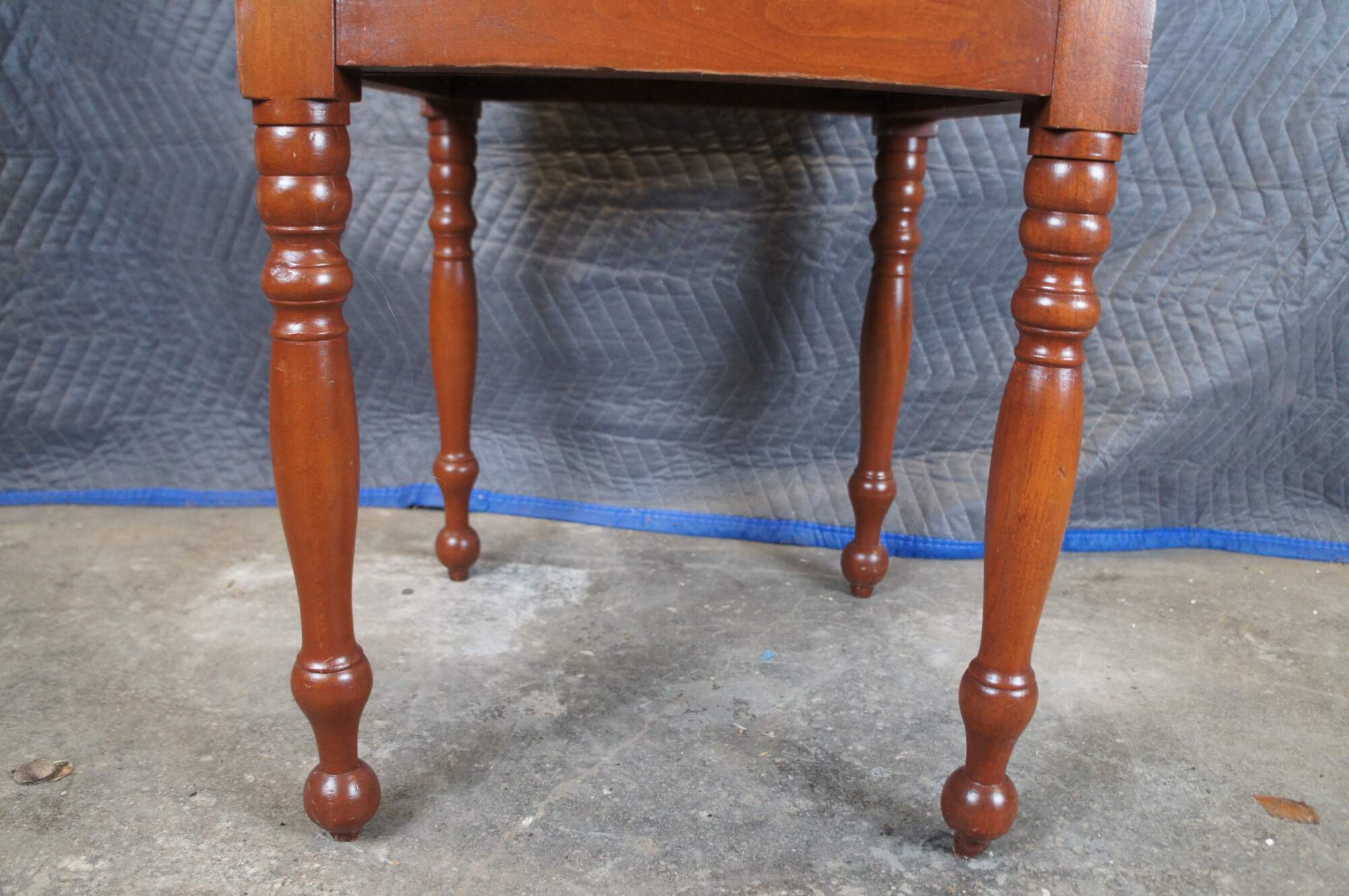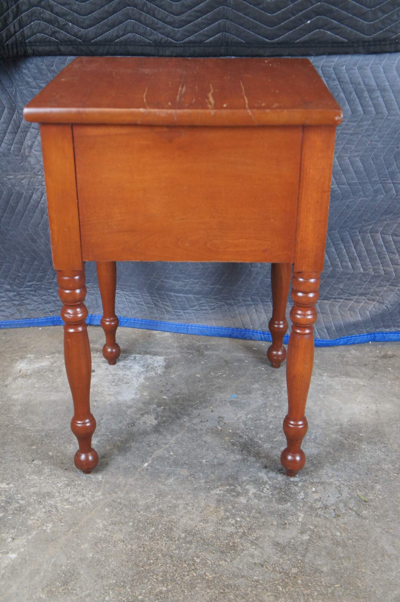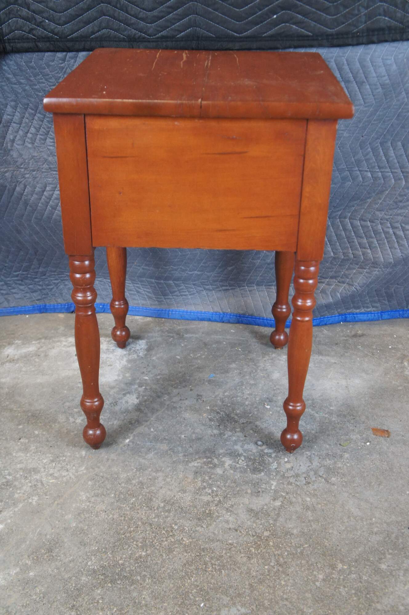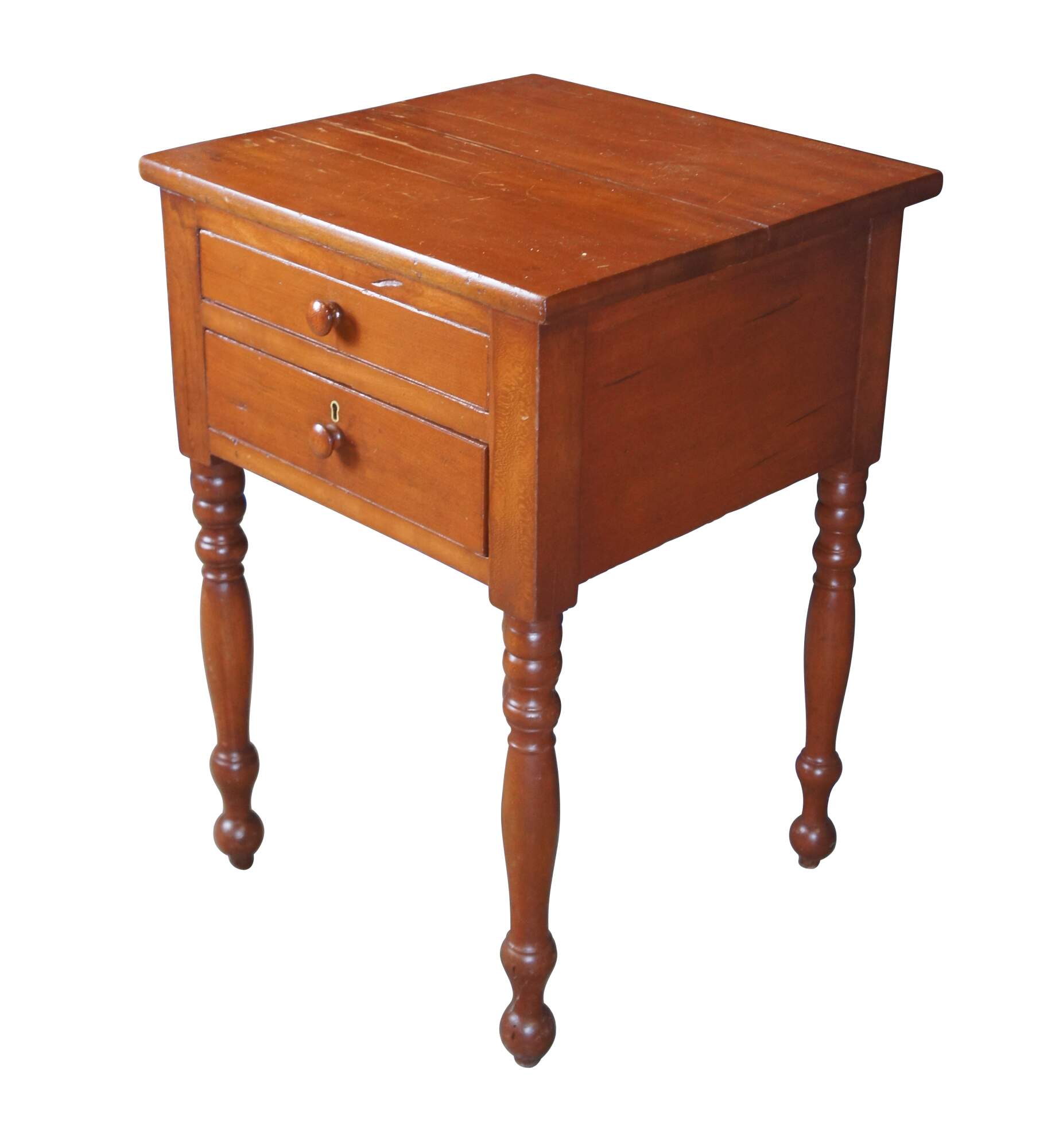 Antique Early American 19th century side table. Made of cherry featuring rectangular form with two dovetailed drawers over long turned legs.