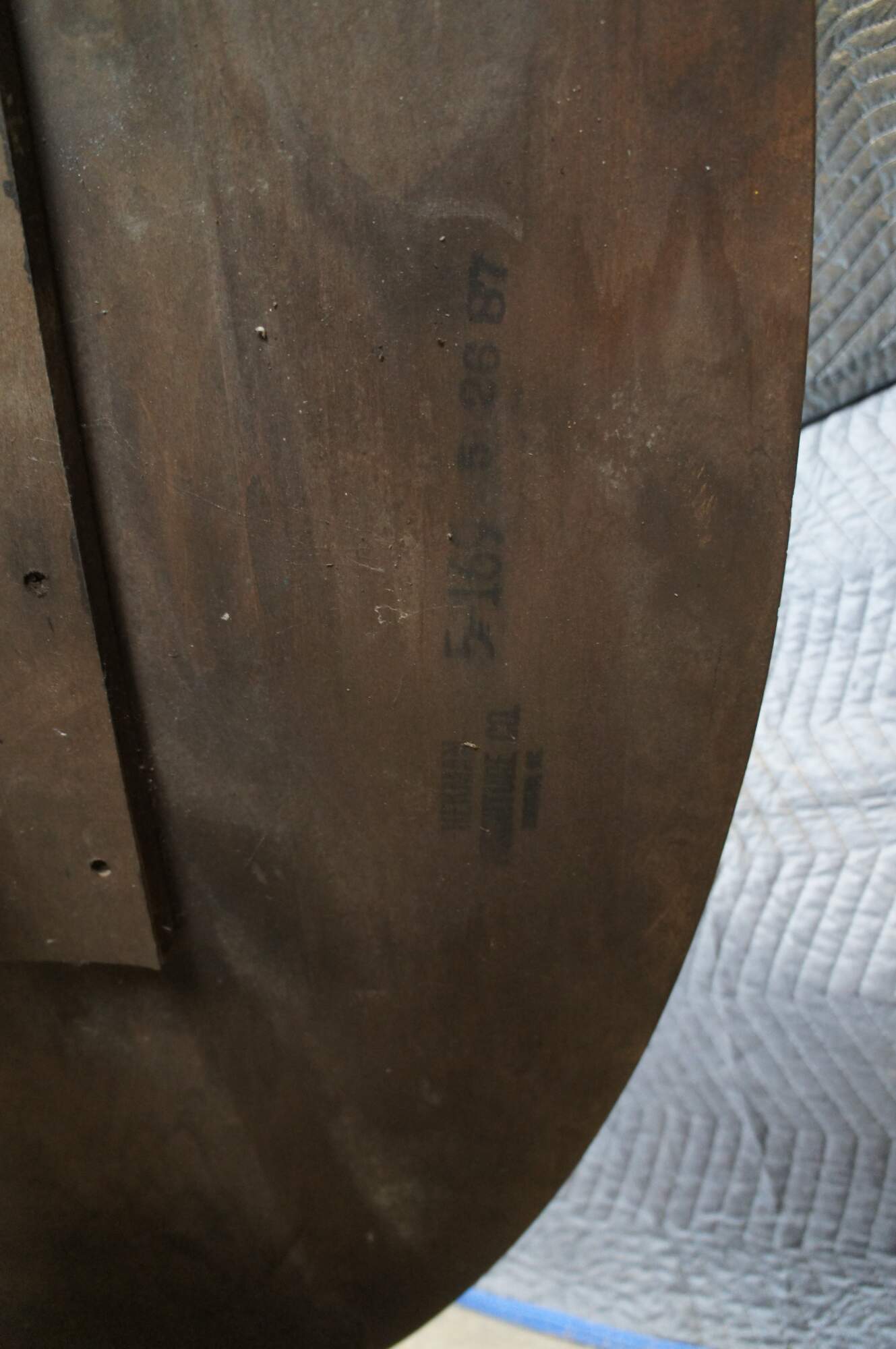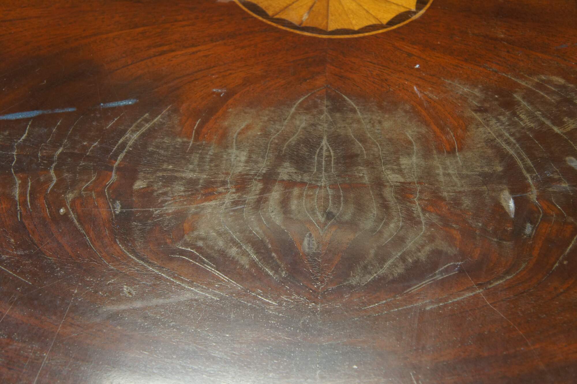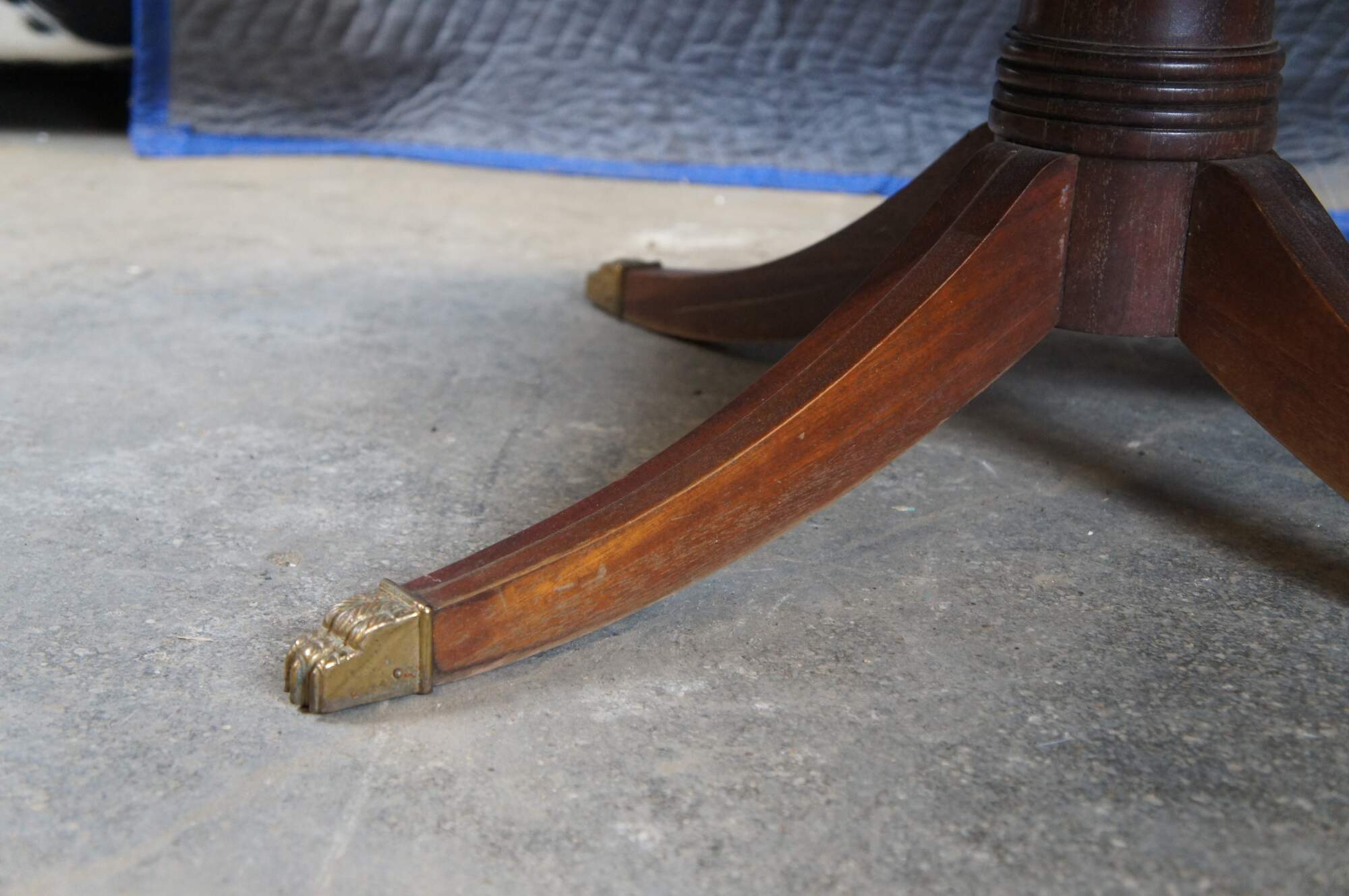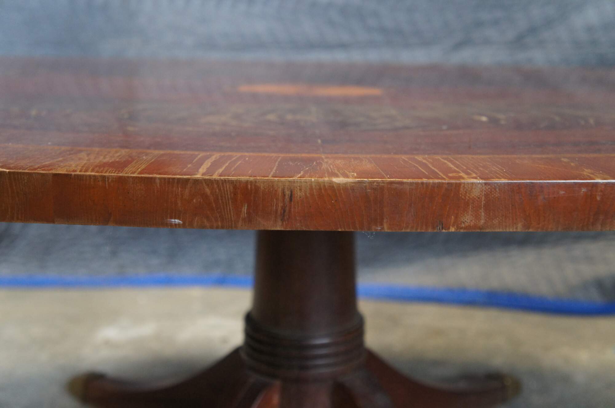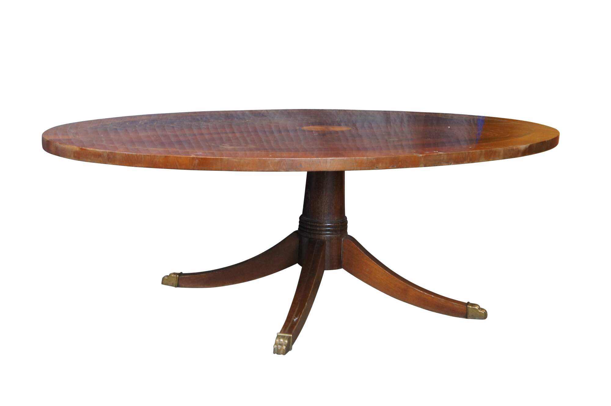 Vintage Hekman Furniture oval coffee or cocktail table featuring English Georgian styling with crotch mahogany top and inlaid satinwood over pedestal base with four moluded splay legs capped with brass claw feet. Circa 1987.