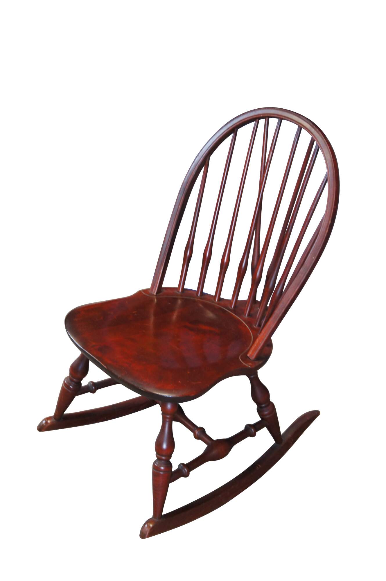 Vintage Nichols and Stone windsor rocking chair or rocker featuring a slatted bentwood bow back design with turned supports and H stretcher.